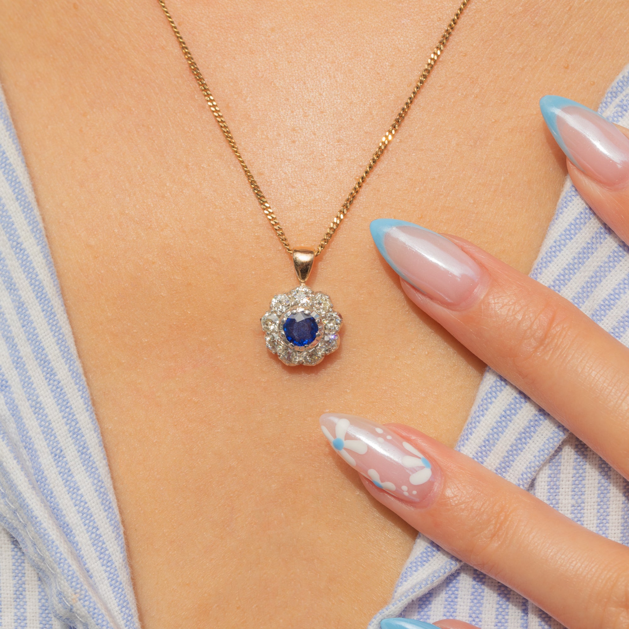 The Sapphire and Diamonds, boasting 0.30ct and 0.65ct respectively, are delicately formed into a classic floral cluster.
