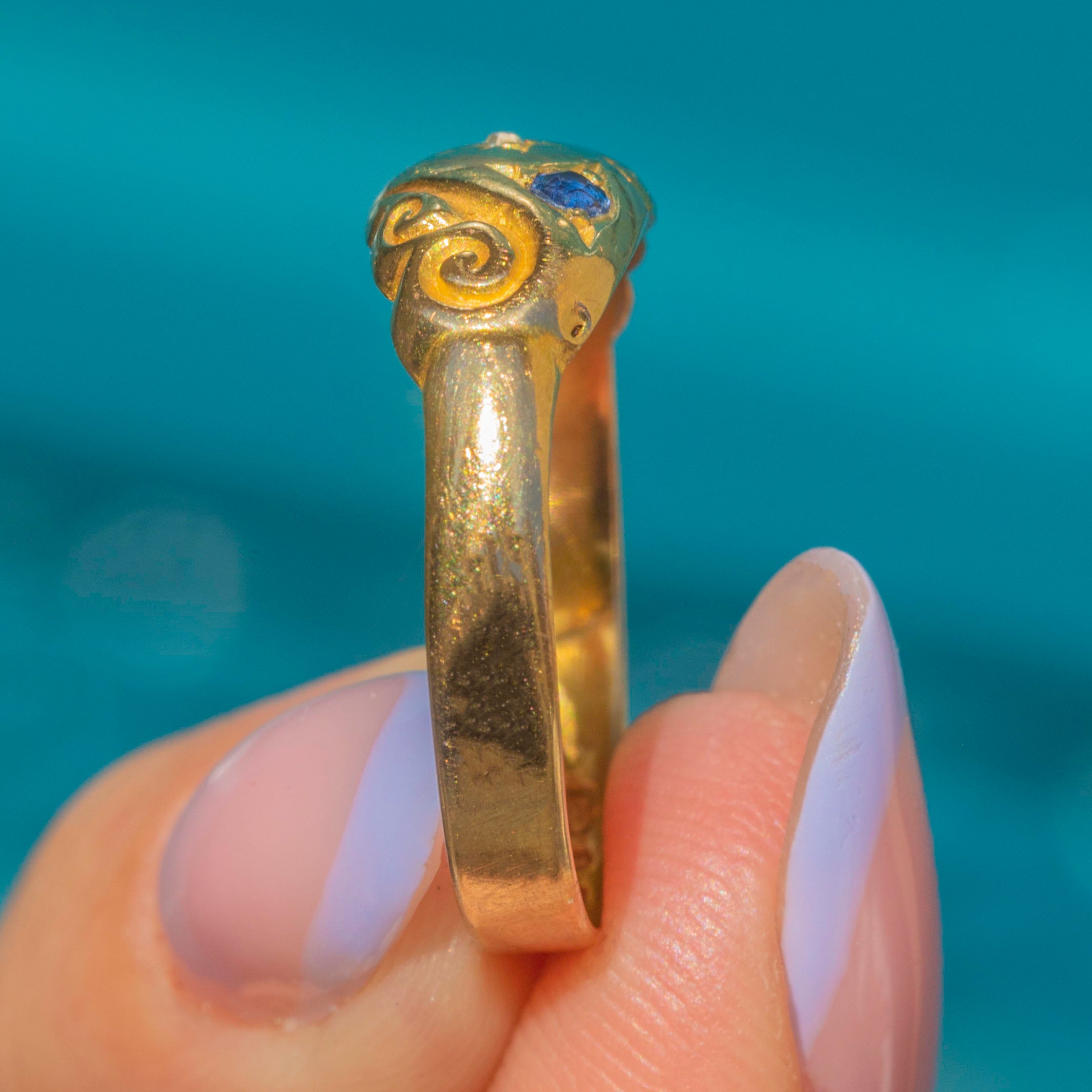 This Edwardian 18ct Gold Sapphire Diamond gypsy ring is a celestial dream! The gemstones are flush-set in distinct star settings, with whimsical engraved details curving around the trilogy to create an undeniably enchanting piece.