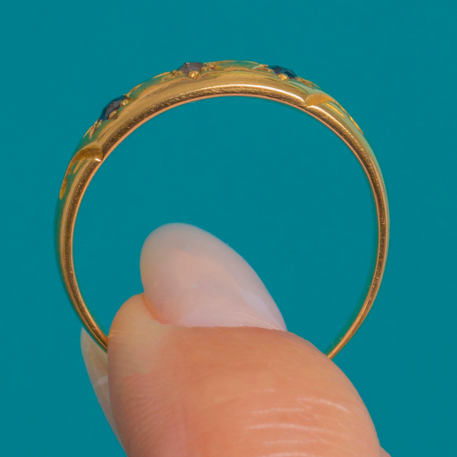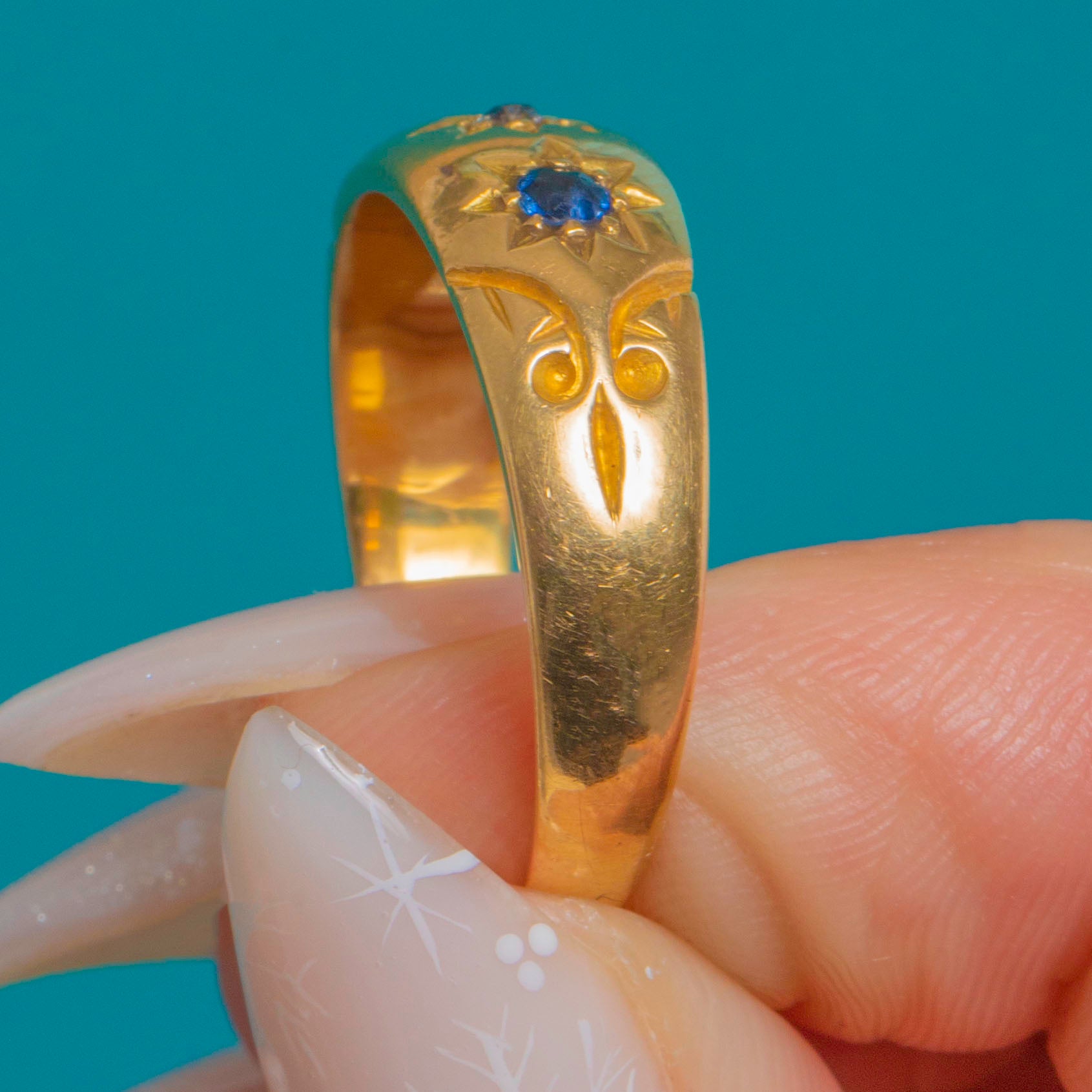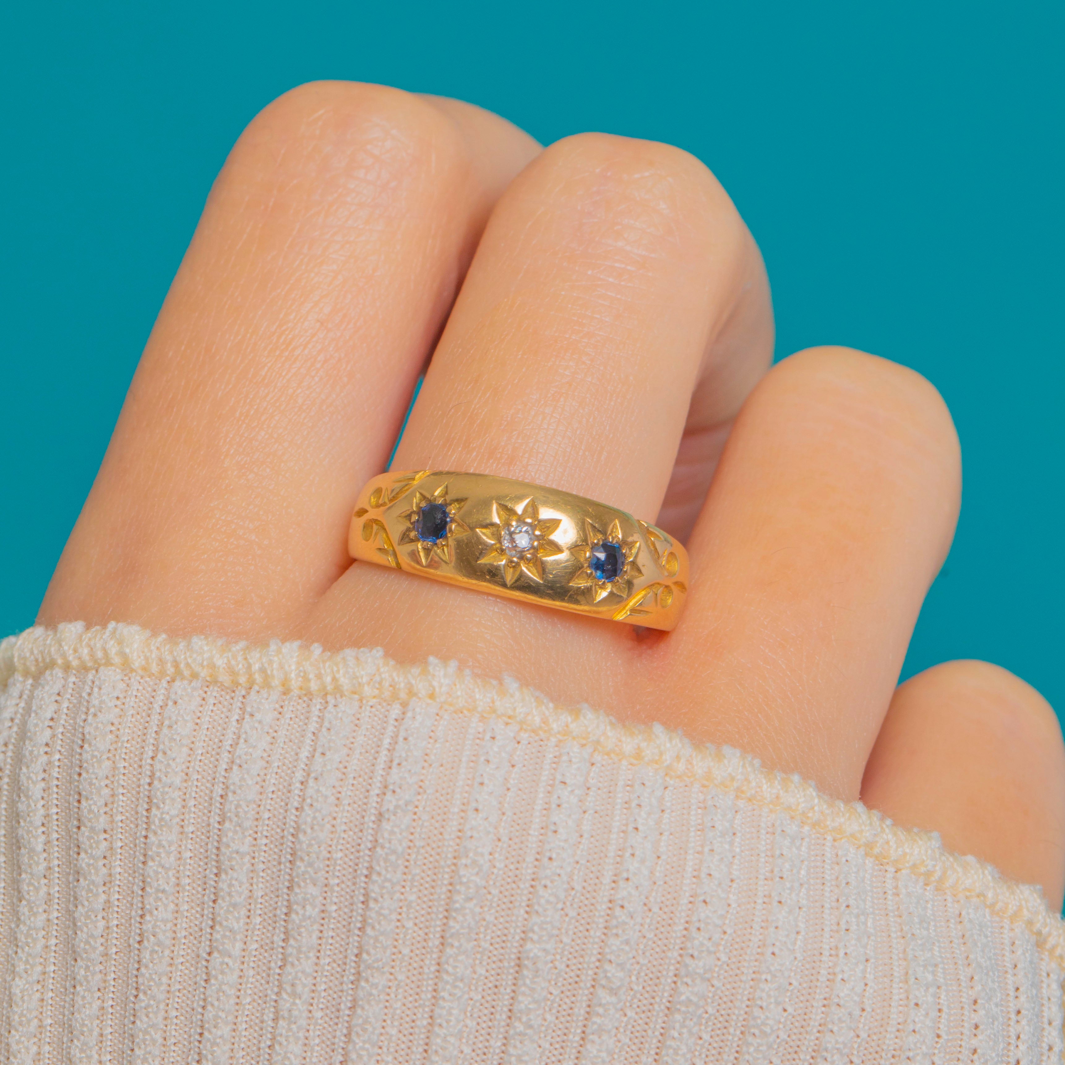This handsome Edwardian gypsy ring is a timeless classic: a rich 18ct Gold domed band set with a lively trio of star-cut settings, the central Diamond flanked by two deep blue Sapphires. The low, smooth profile hugs the finger beautifully, while the crisp eight-point starbursts add that signature antique sparkle.