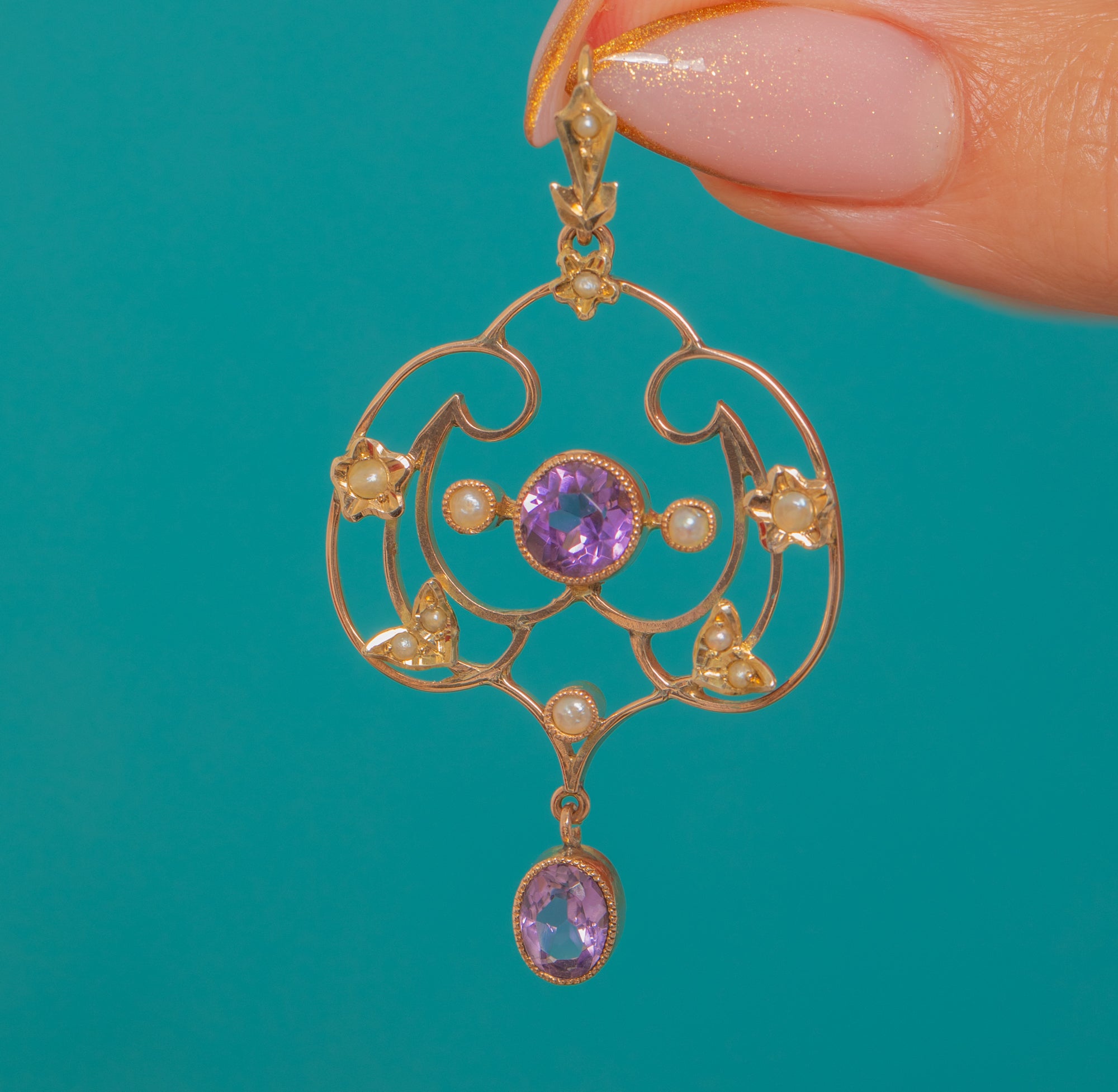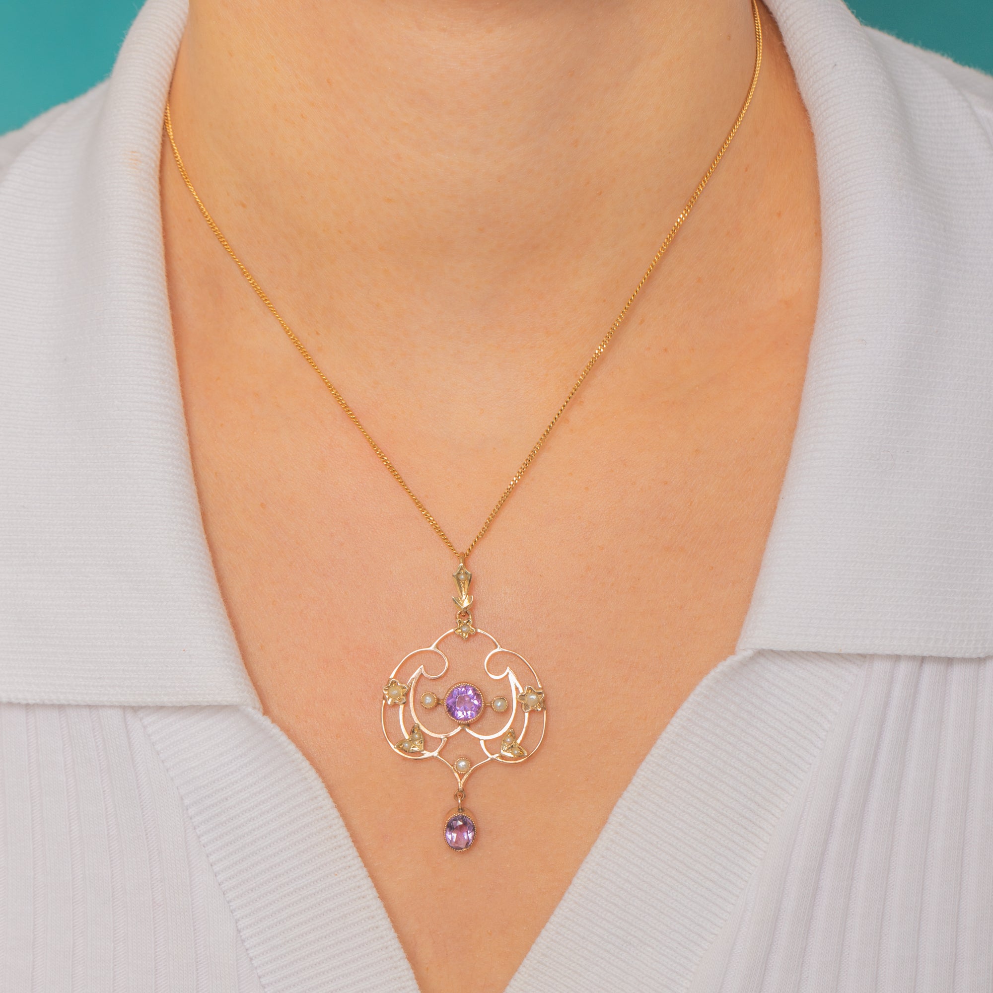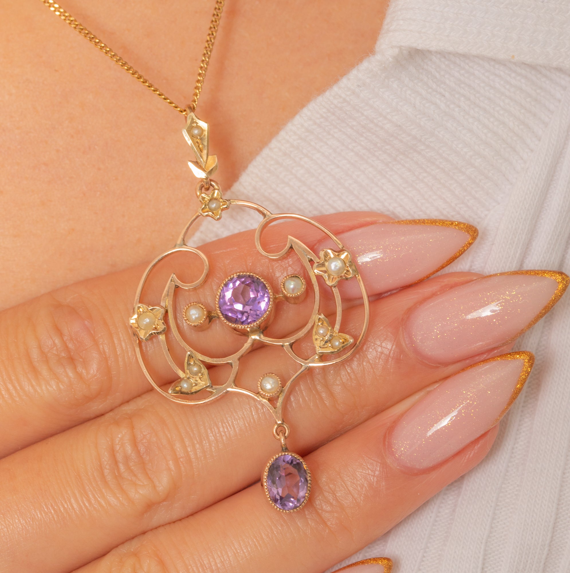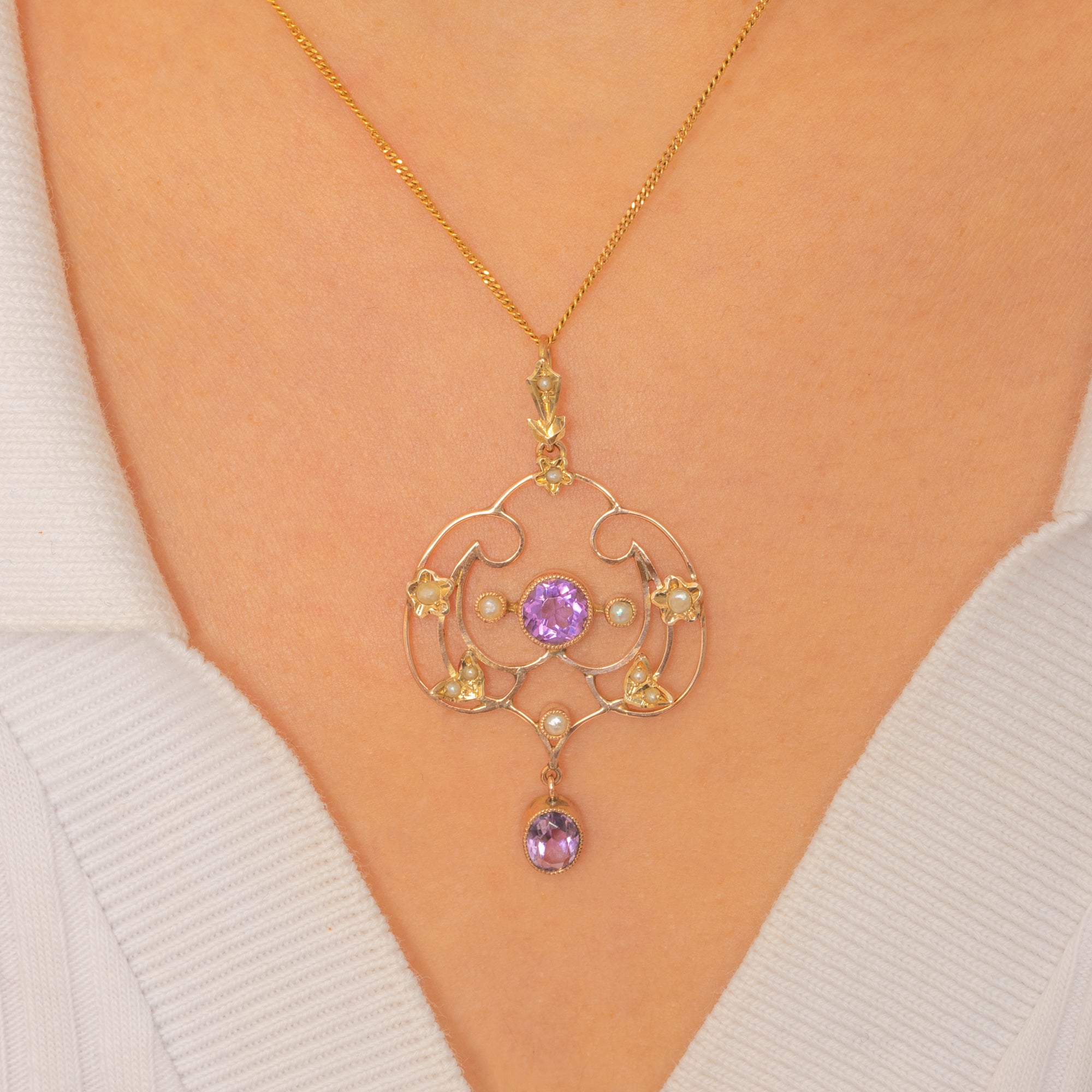 This exquisite Edwardian lavalier pendant captures the delicate elegance of early 20th-century design. Crafted in 9ct Gold, it features two glowing Amethysts framed by creamy Seed Pearls in a graceful openwork design.