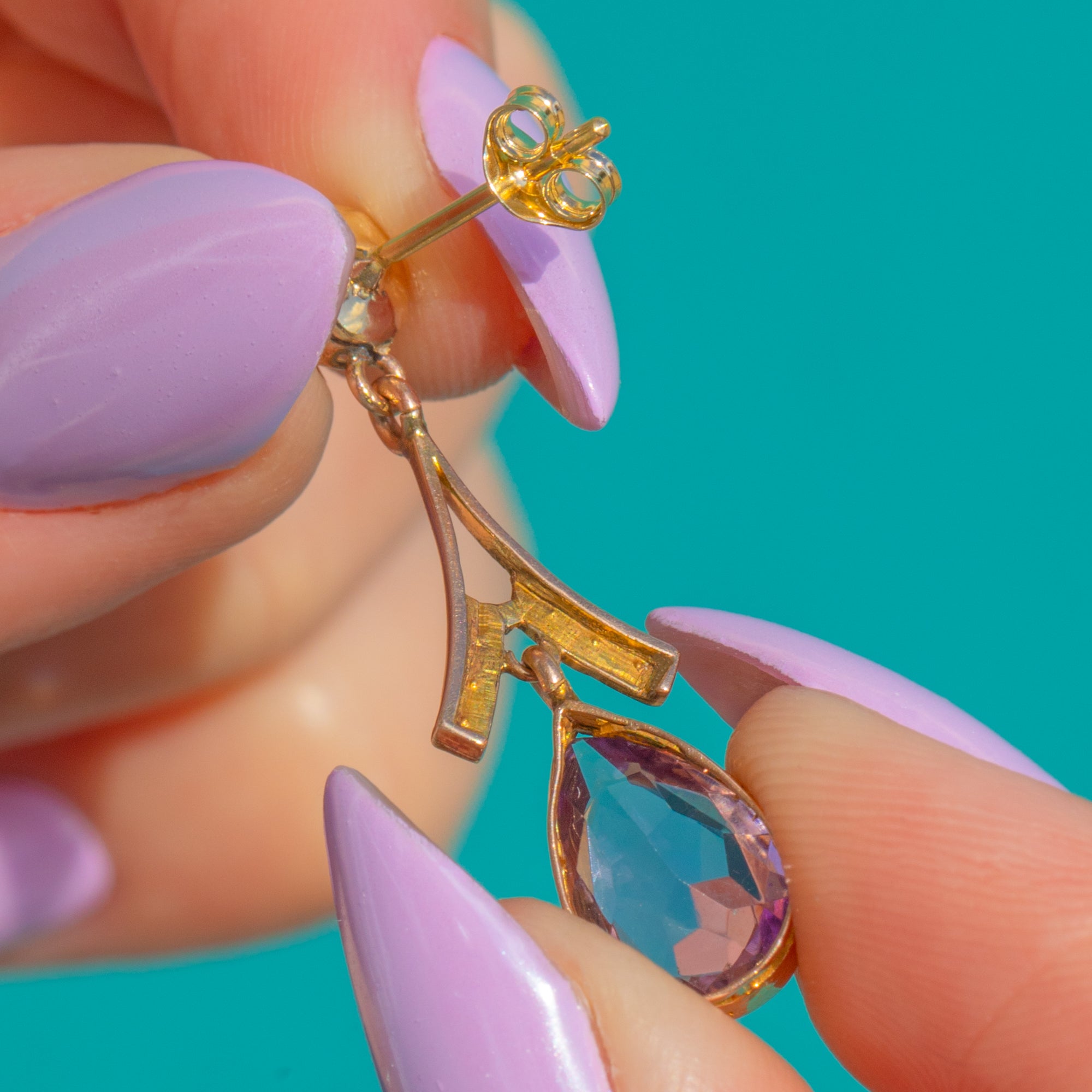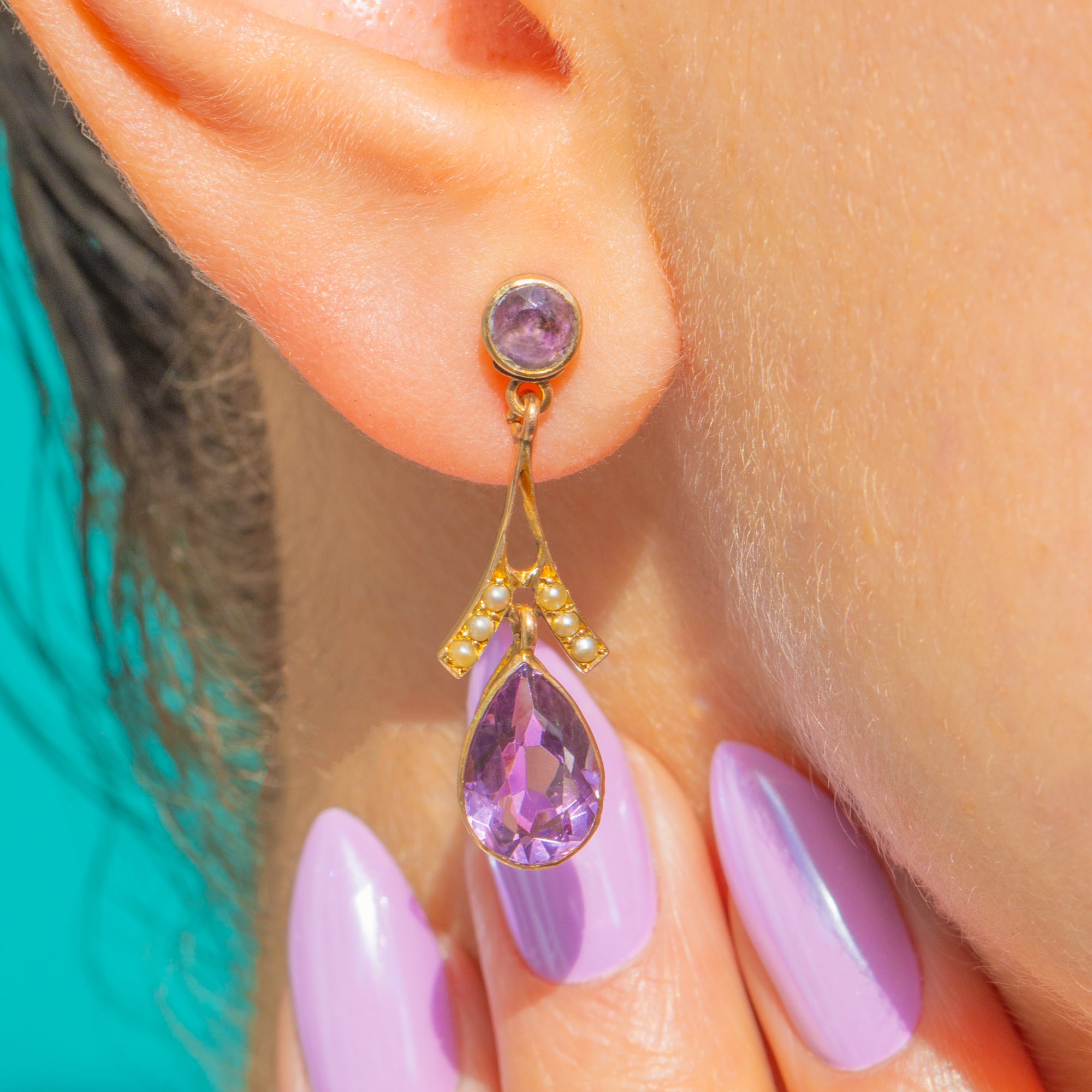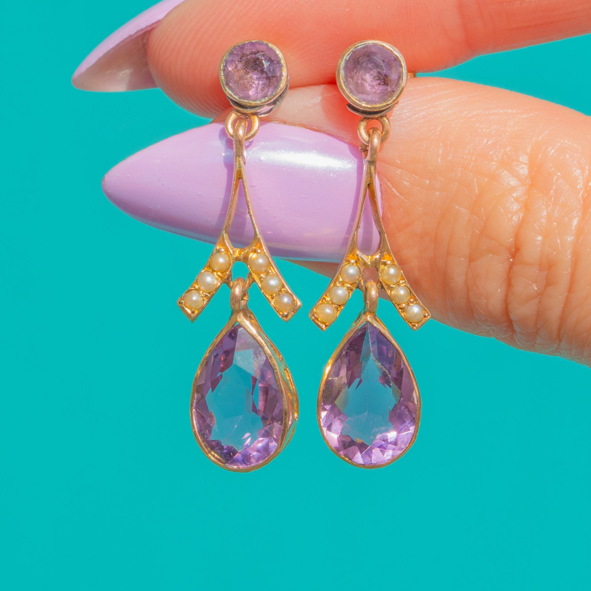 Effortlessly elegant, these Edwardian 9ct Gold earrings pair delicate Seed Pearls with regal Amethysts in a refined, feminine silhouette. A round Amethyst surmount leads to a graceful Y-shaped connector embellished with creamy seed Pearls, flowing into a bezel-set pear-shaped Amethyst drop that catches the light with every movement.