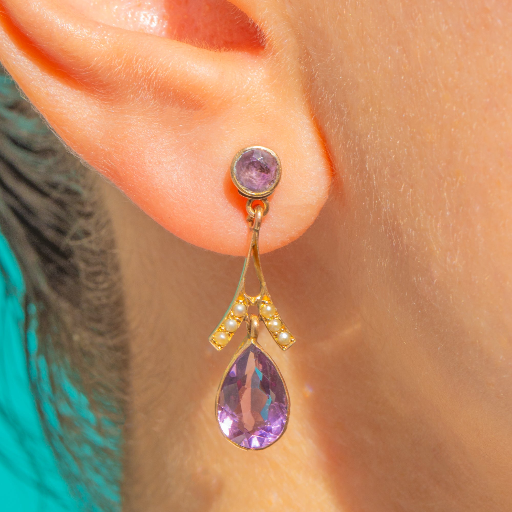 Edwardian 9ct Gold Amethyst Pearl Pear Drop Earrings