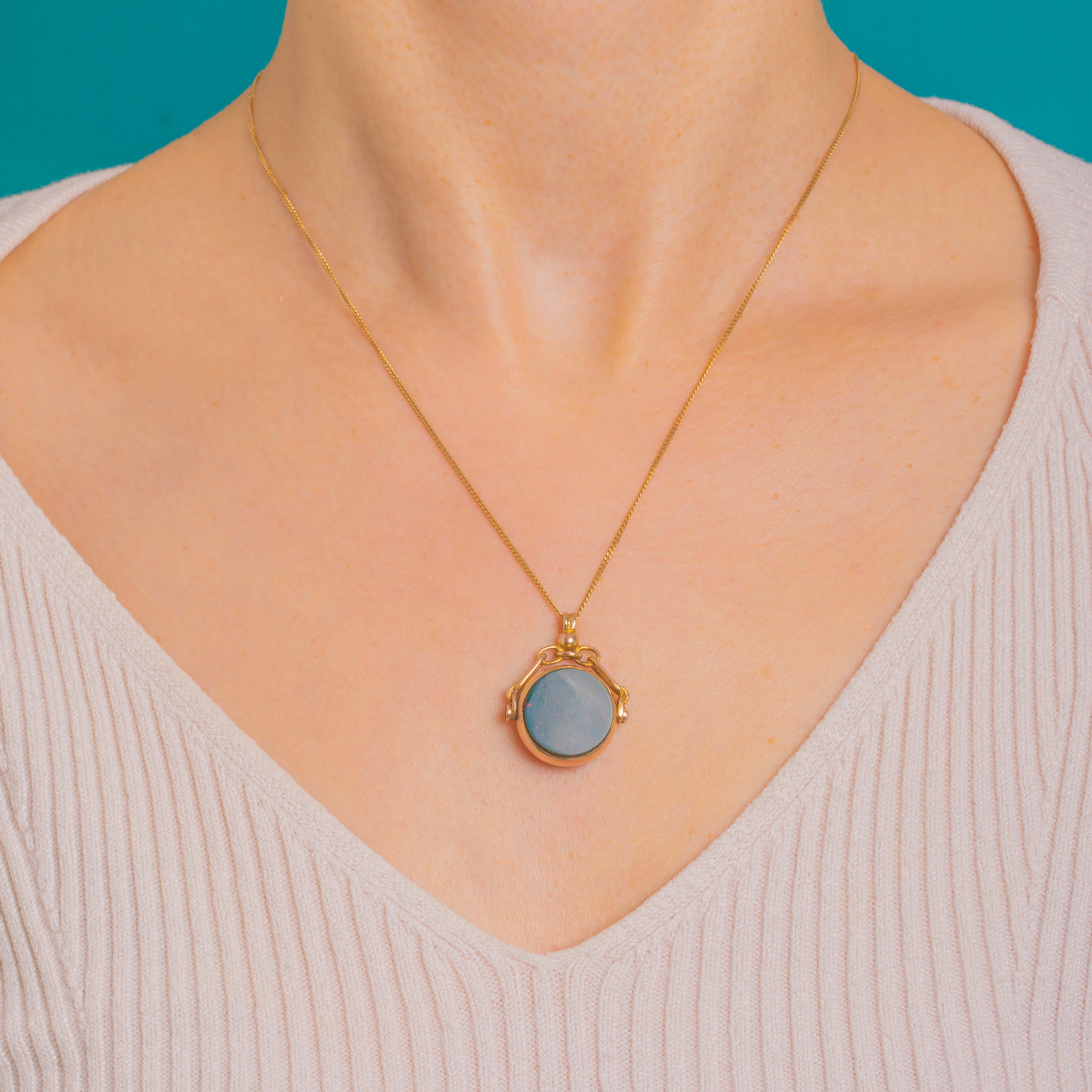 A refined Edwardian fob pendant crafted in rich 9ct Gold, this circular treasure is set with characterful Bloodstone flecked with vivid reds and complemented by sleek Onyx. The cabochon sits in a smooth bezel, suspended from an elegant double-armed, articulated bracket and petite round bail for a poised, timeless silhouette.