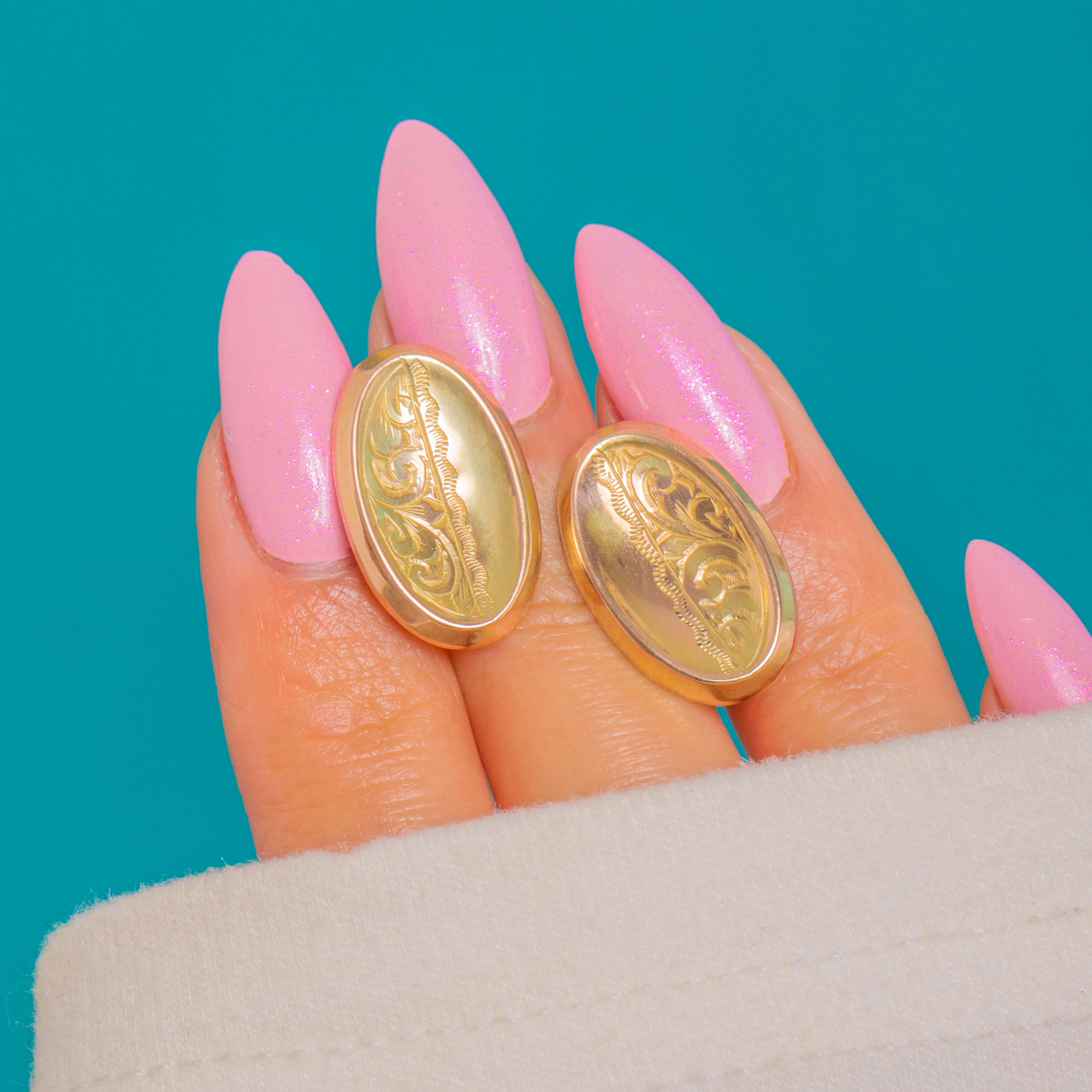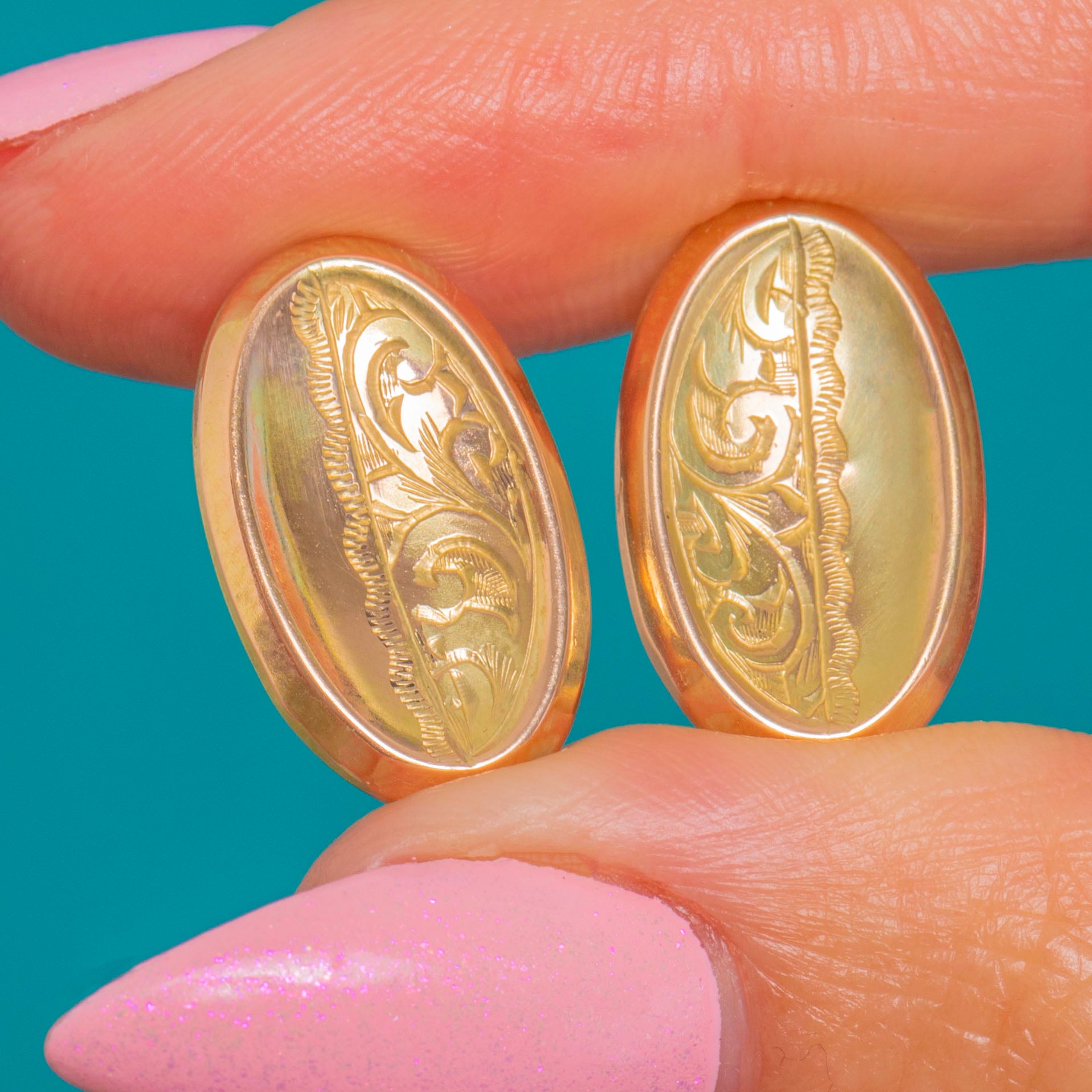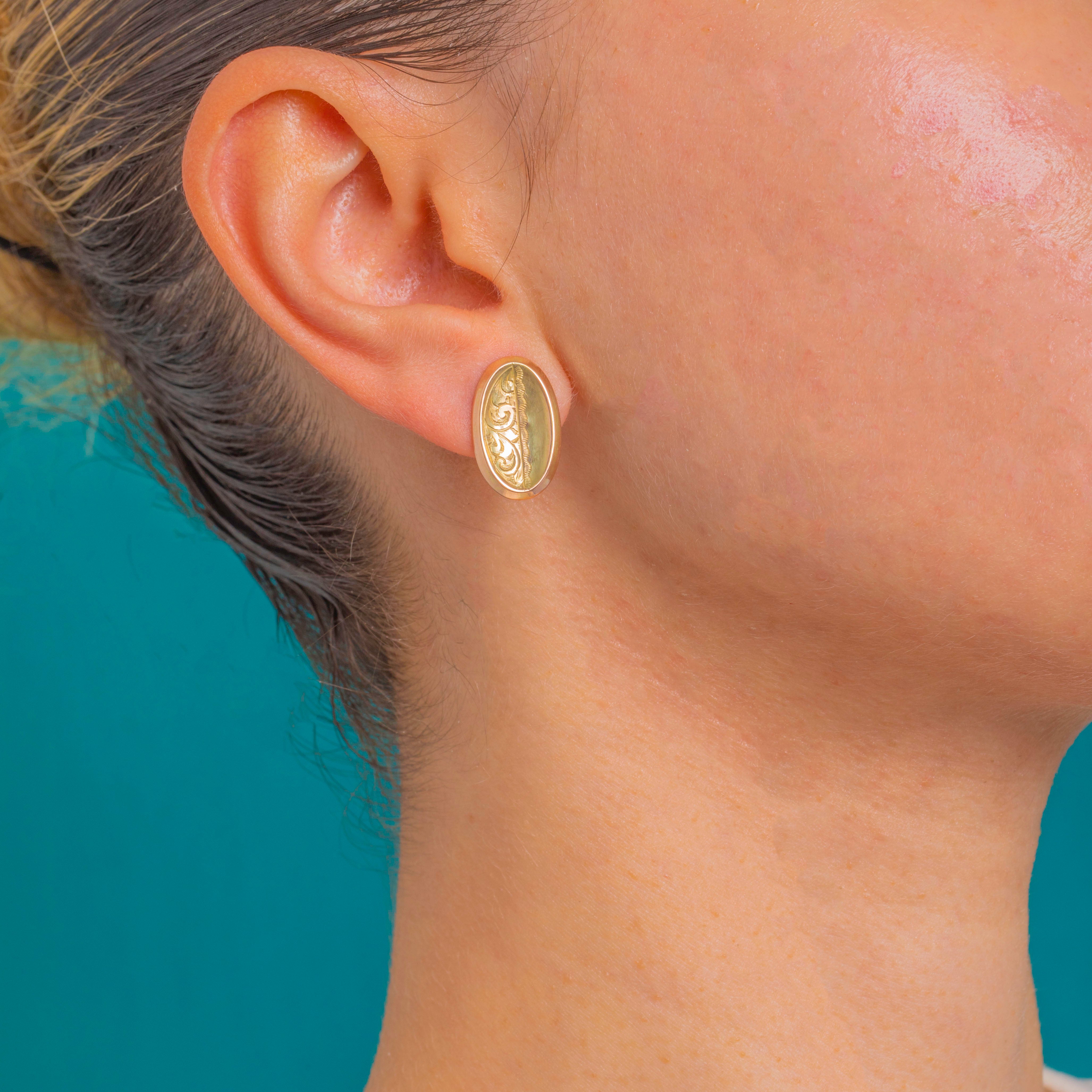 Refined and effortlessly elegant, these Edwardian 9ct Gold oval studs showcase the era’s love of delicate ornamentation. Converted from antique cufflinks, each domed oval is framed by a raised rim and divided vertically: one half gleams with a high polish while the other is adorned with low‑relief foliate scroll engravings, separated by a slender beaded divider.