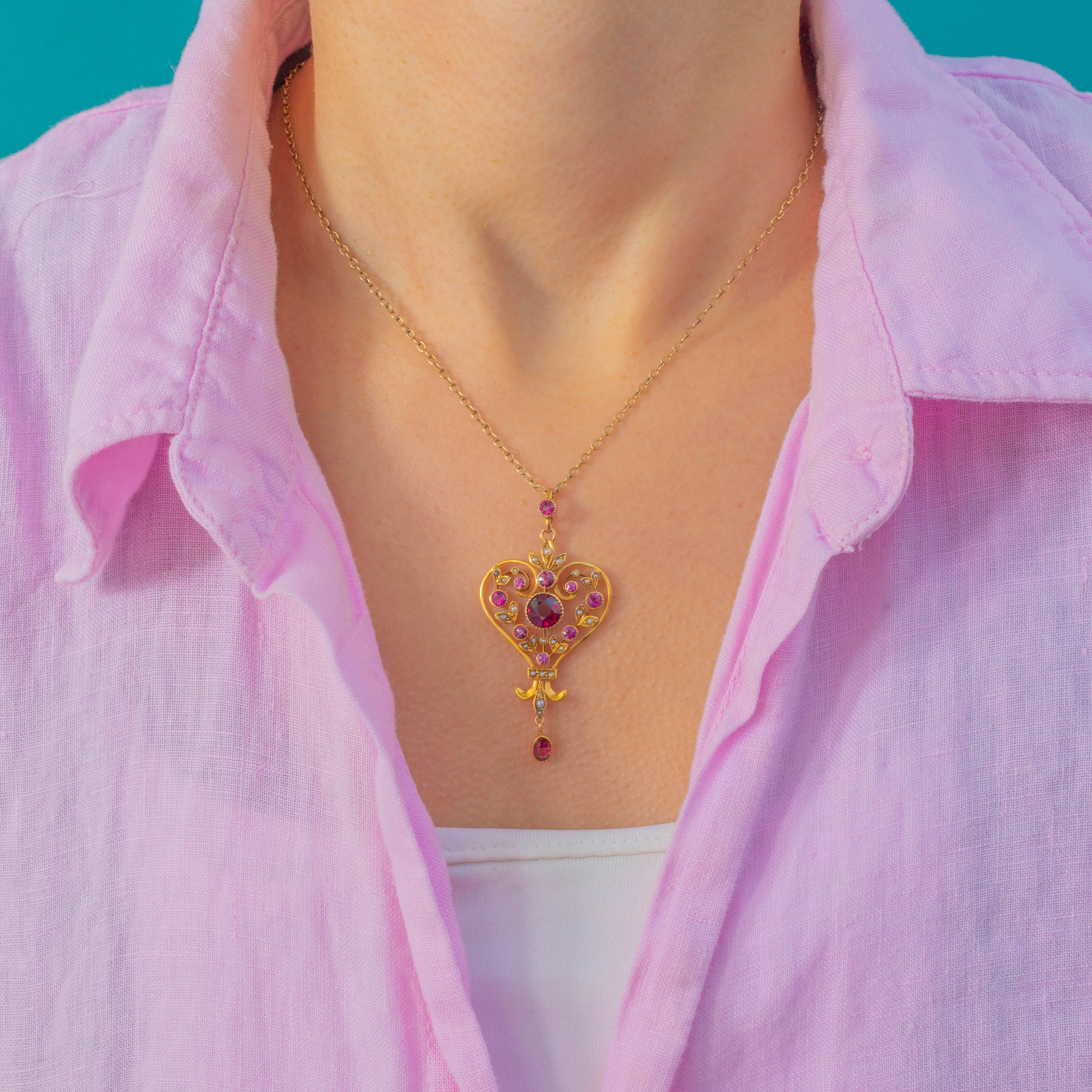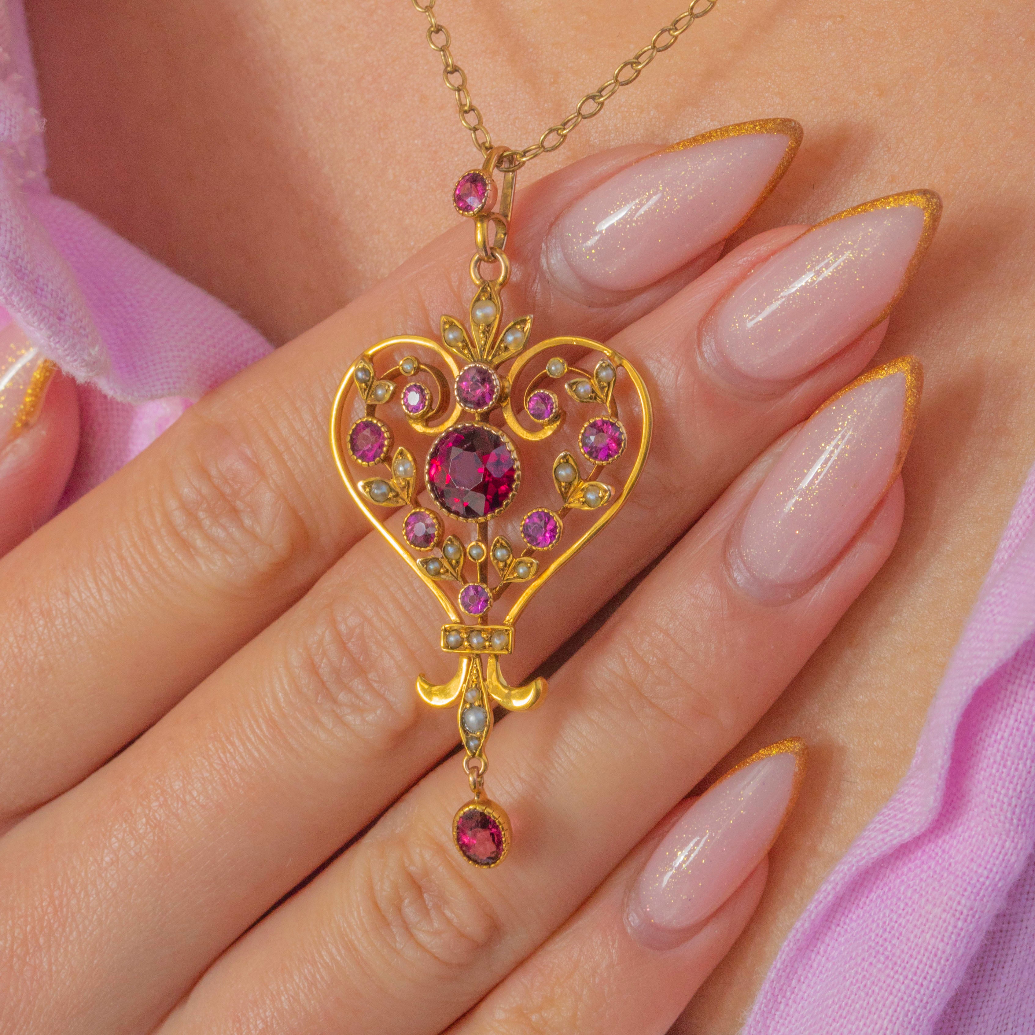 This exquisite Edwardian heart pendant is a romantic statement of colour and craftsmanship. Crafted in warm 9ct Gold, it features a beautifully ornate openwork design set with glowing Garnets and delicate natural Pearls. The central Garnet brings a rich, deep red sparkle, while the surrounding stones add rhythm, symmetry and movement in true Edwardian style.