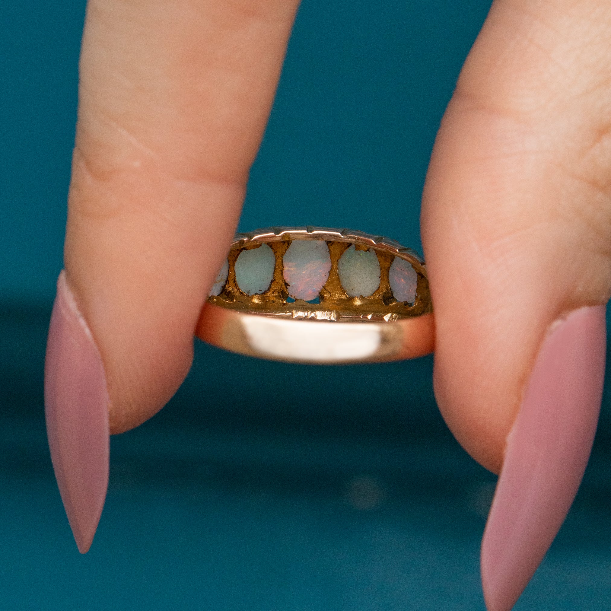 This Edwardian 9ct Gold Opal five stone ring will grace your finger with elegance! The Opals possess a wonderful play of colour, bursting with a confetti-like display as they catch the light.