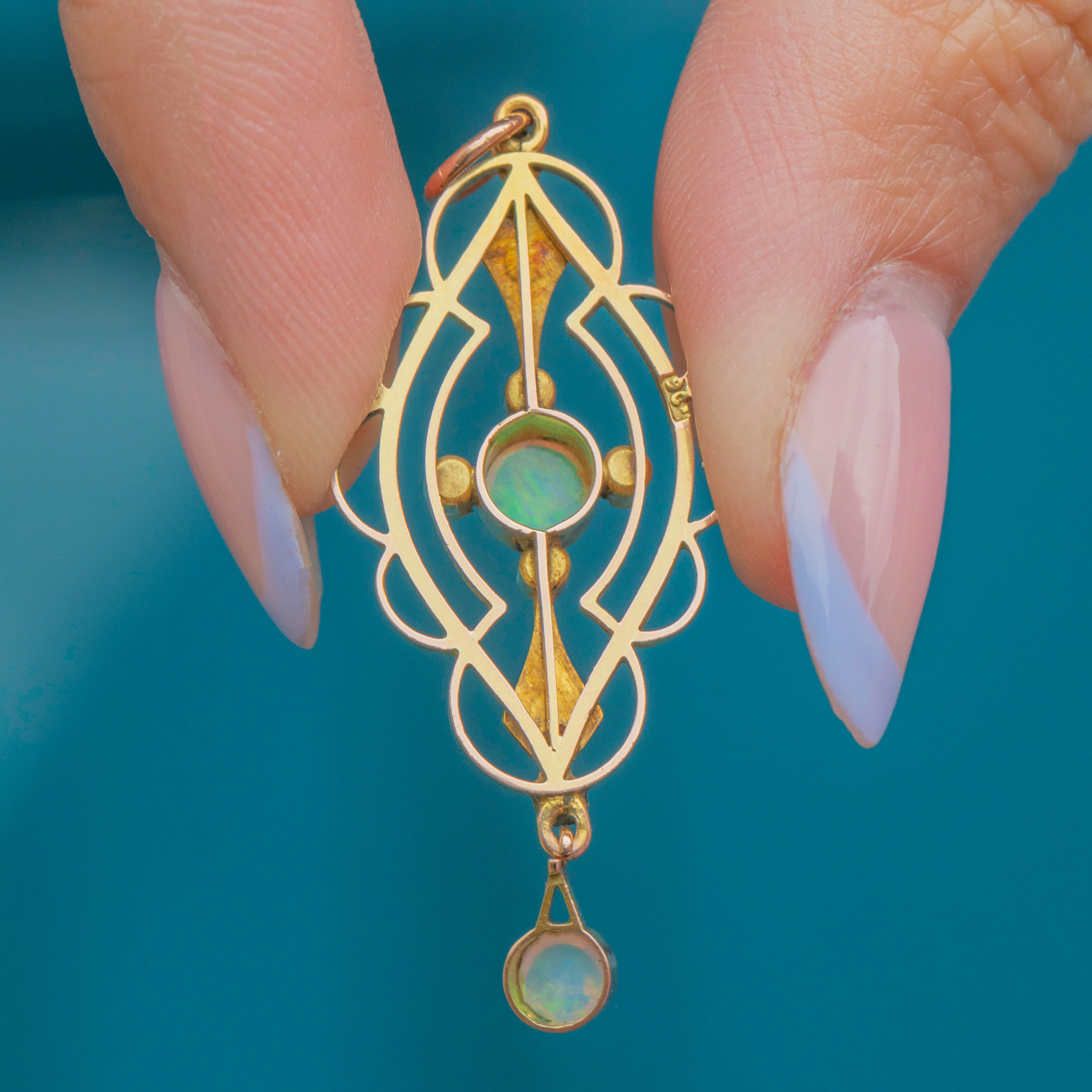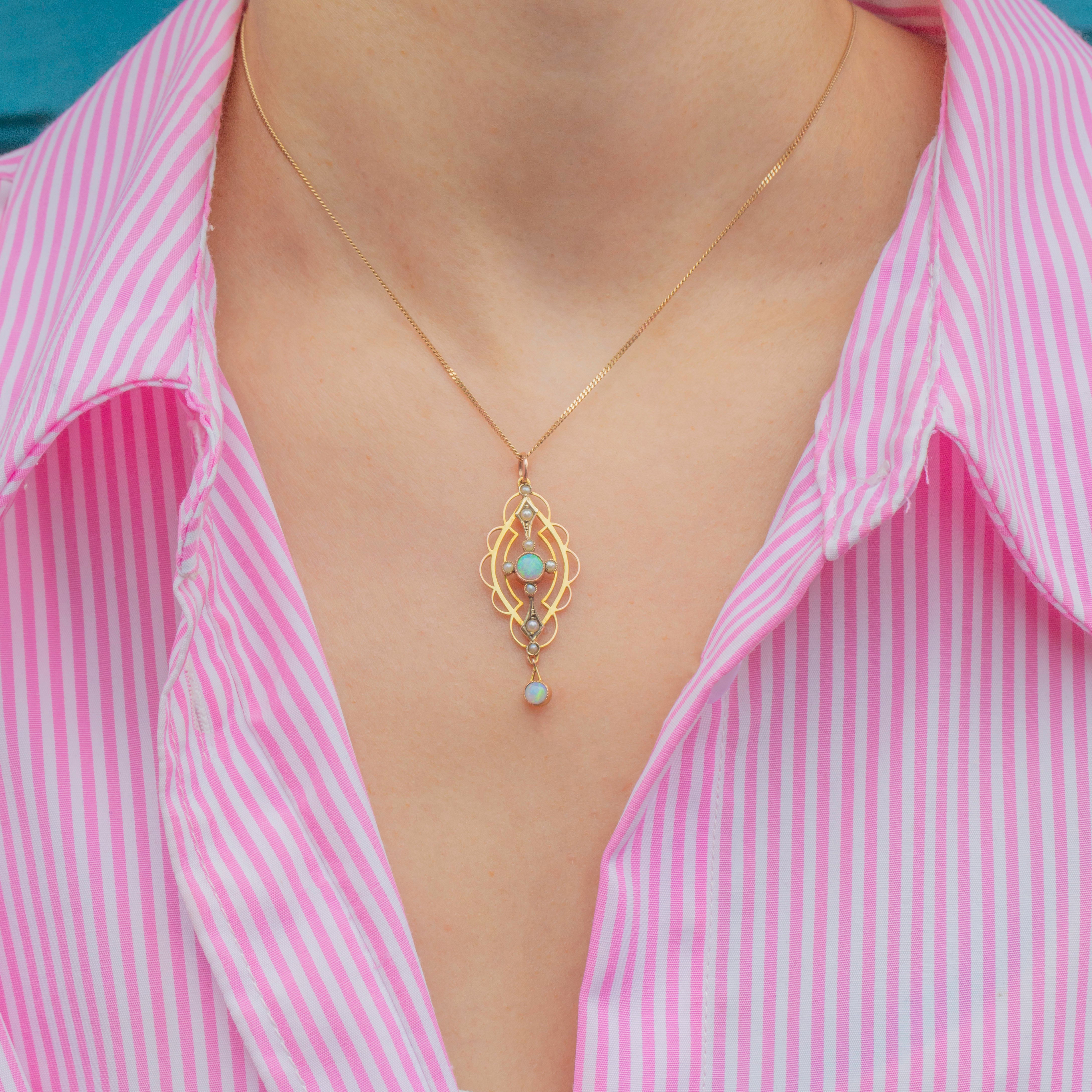 VERY GOOD-EXCELLENT: This Edwardian 9ct Gold Opal and Pearl drop pendant is in great condition.  The gemstones are radiant and secure in their bezels. There are some signs of wear and discolouration to the Gold settings commensurate with age, though this is only noticeable under close inspection. With a securely soldered jump ring, you can wear this antique Opal pendant with confidence!