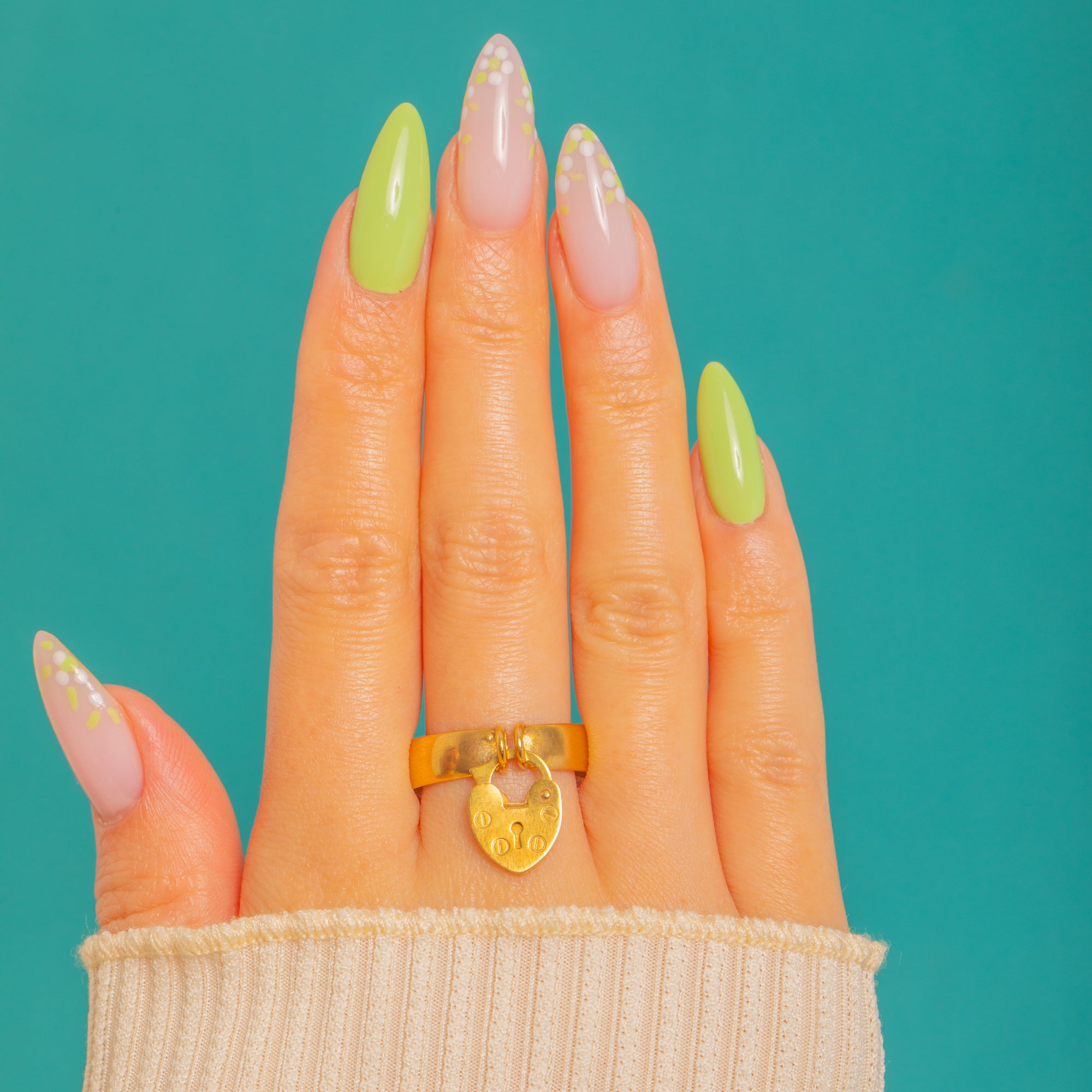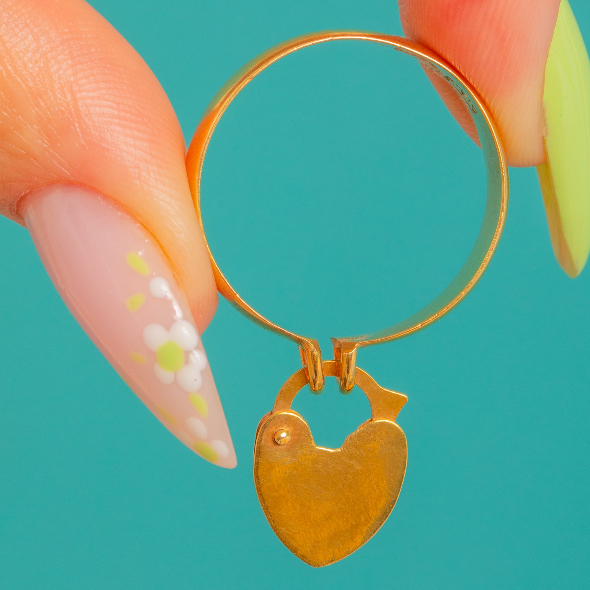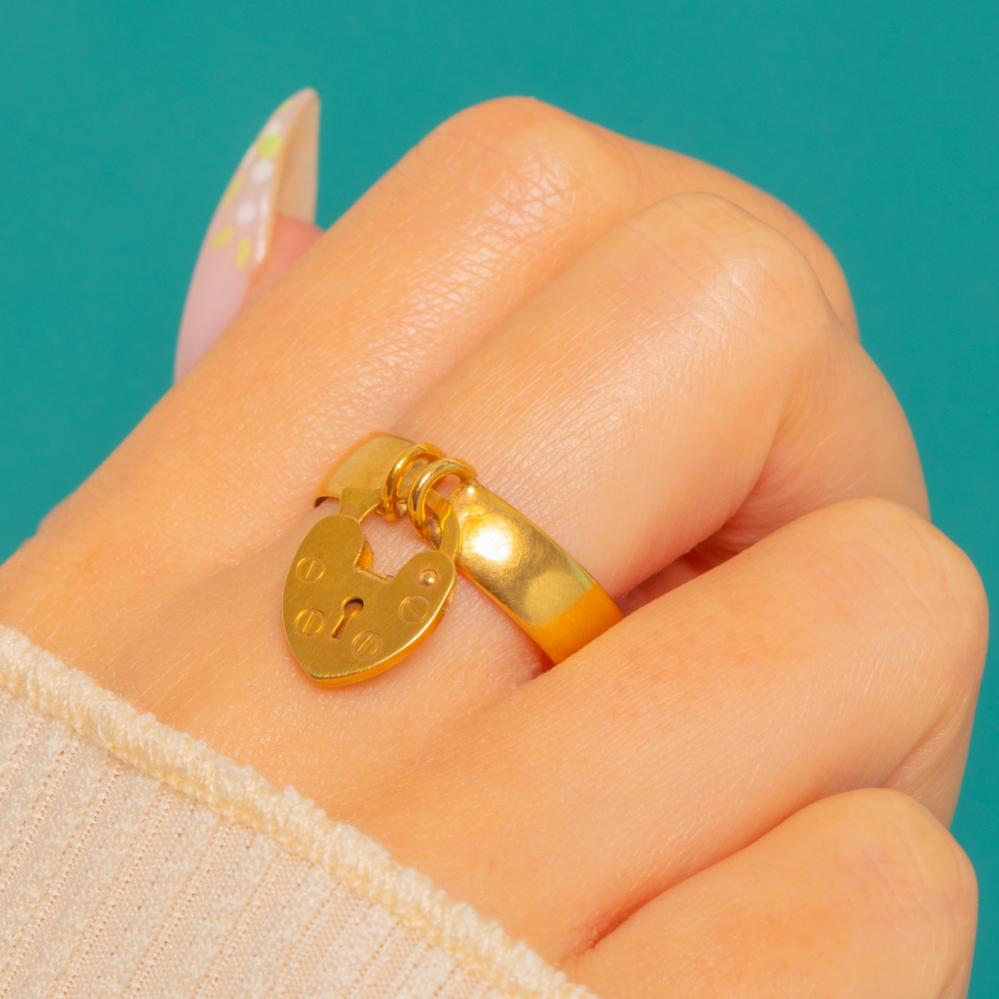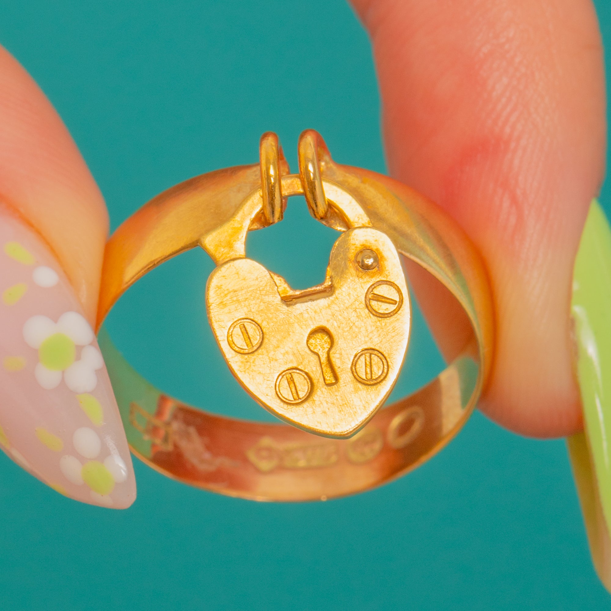 A darling Edwardian 9ct Gold padlock ring, dating to 1901. The heart-shaped padlock charm swings sweetly from a polished Gold band, its face detailed with a stylised keyhole and tiny “rivet” dots for that quintessential love-lock motif.