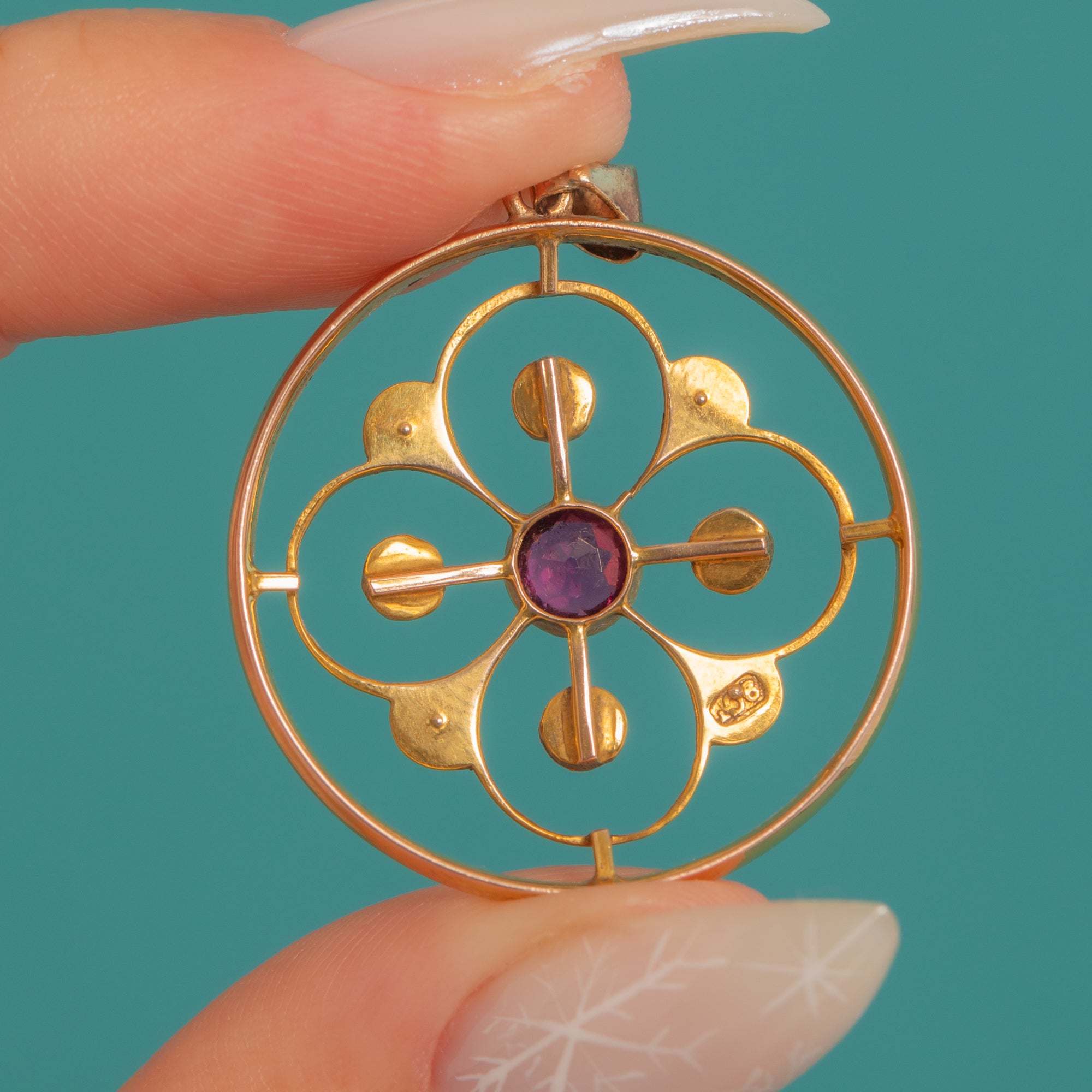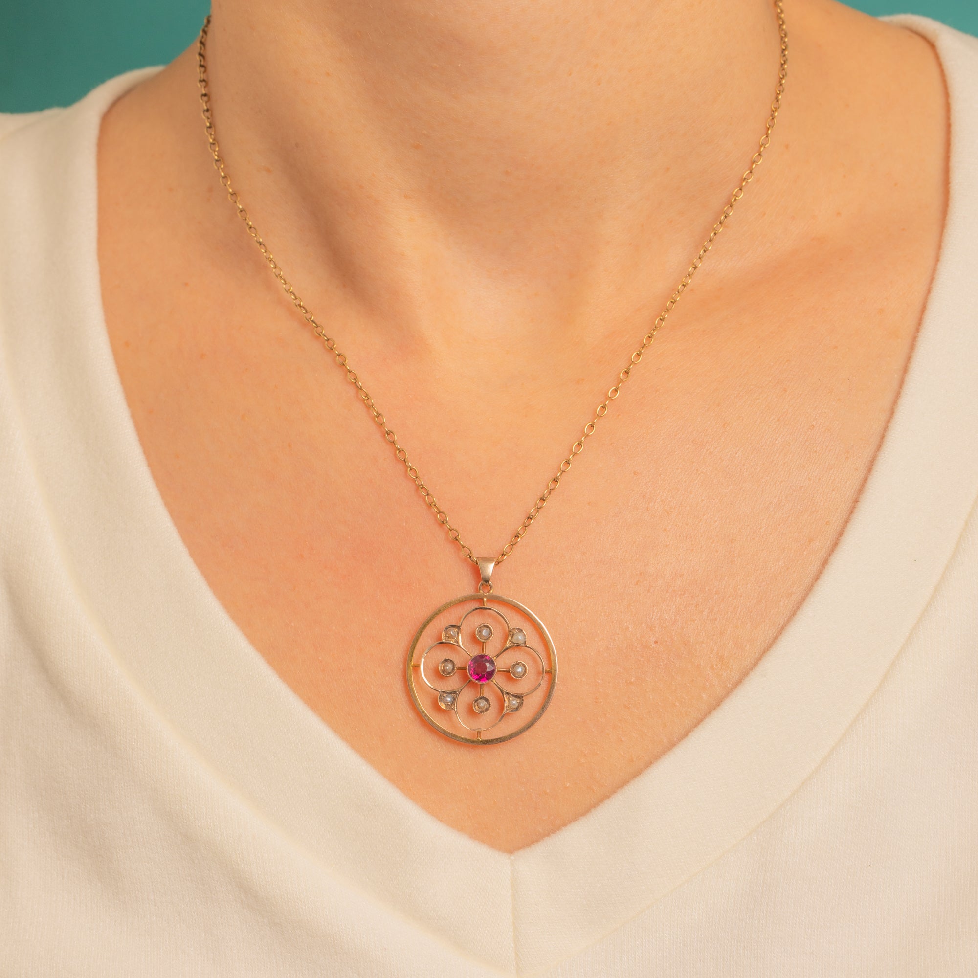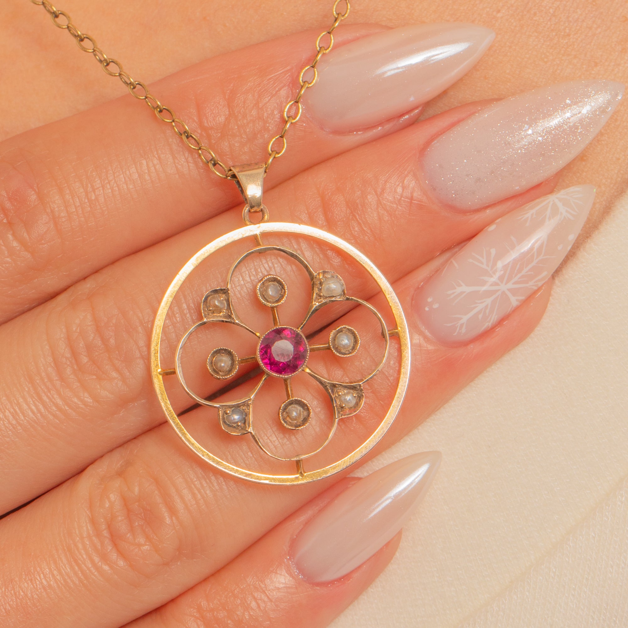 A luminous Edwardian circle charm in 9ct Gold, its airy openwork rosette centred by a vivid Pink Garnet and accented with pretty Seed Pearls. The floral motif sits within a smooth hoop, creating a delicate piece with effortless Edwardian poise.