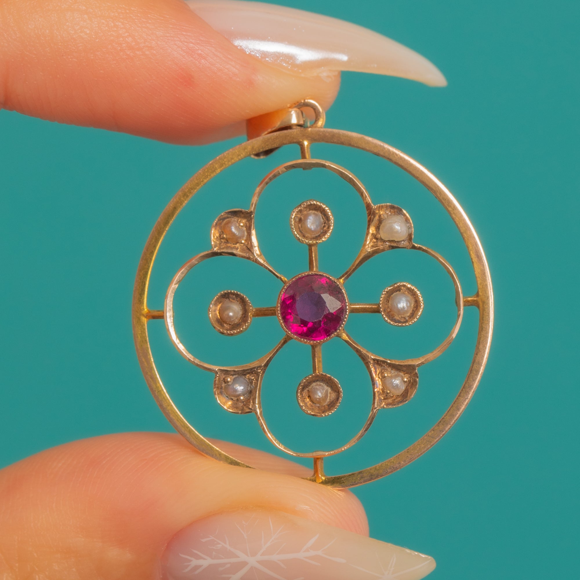 Edwardian 9ct Gold Pink Garnet Seed Pearl Circle Charm