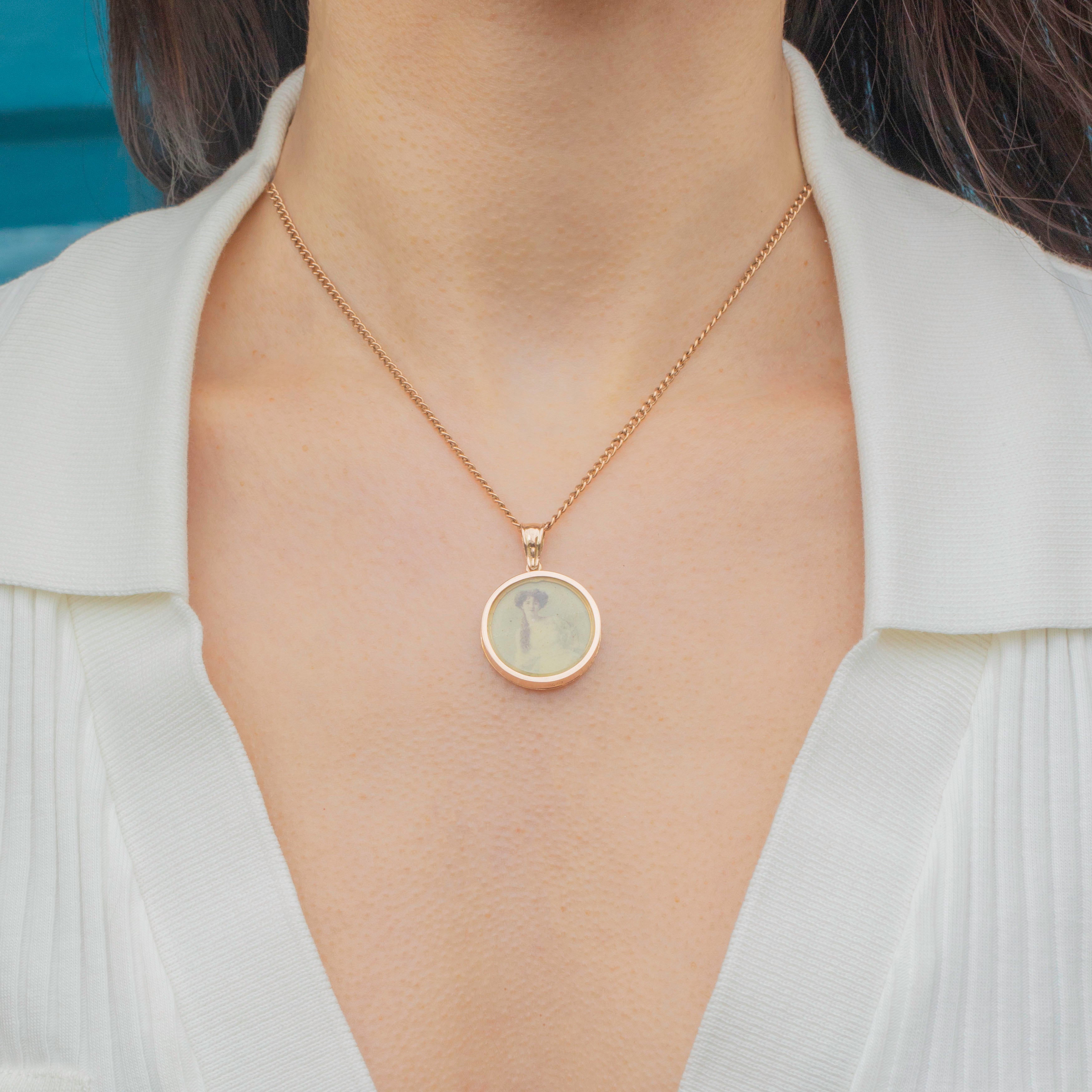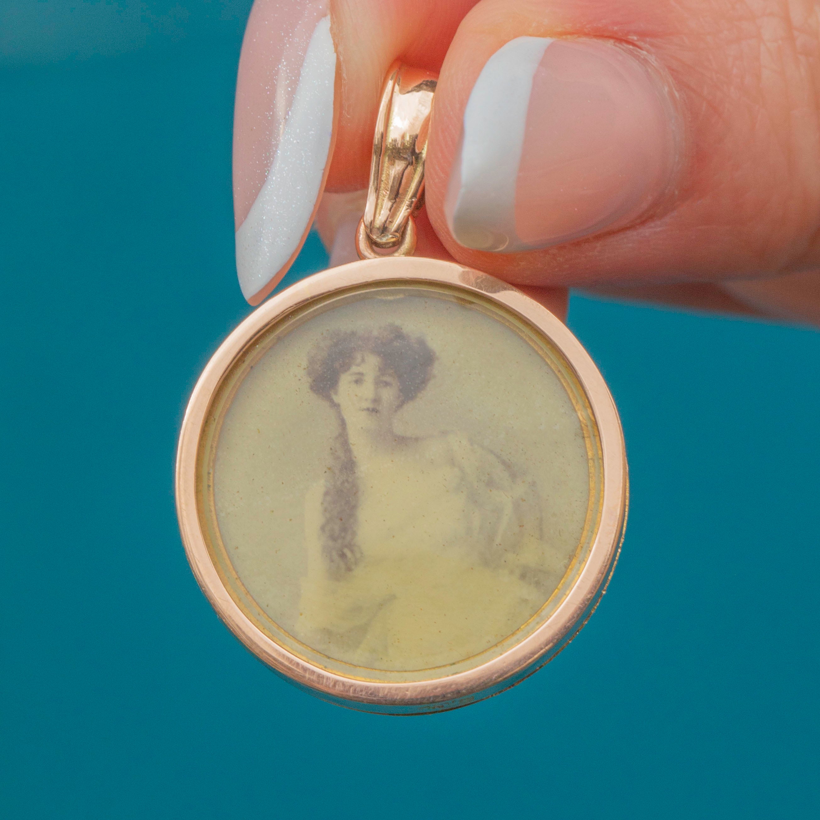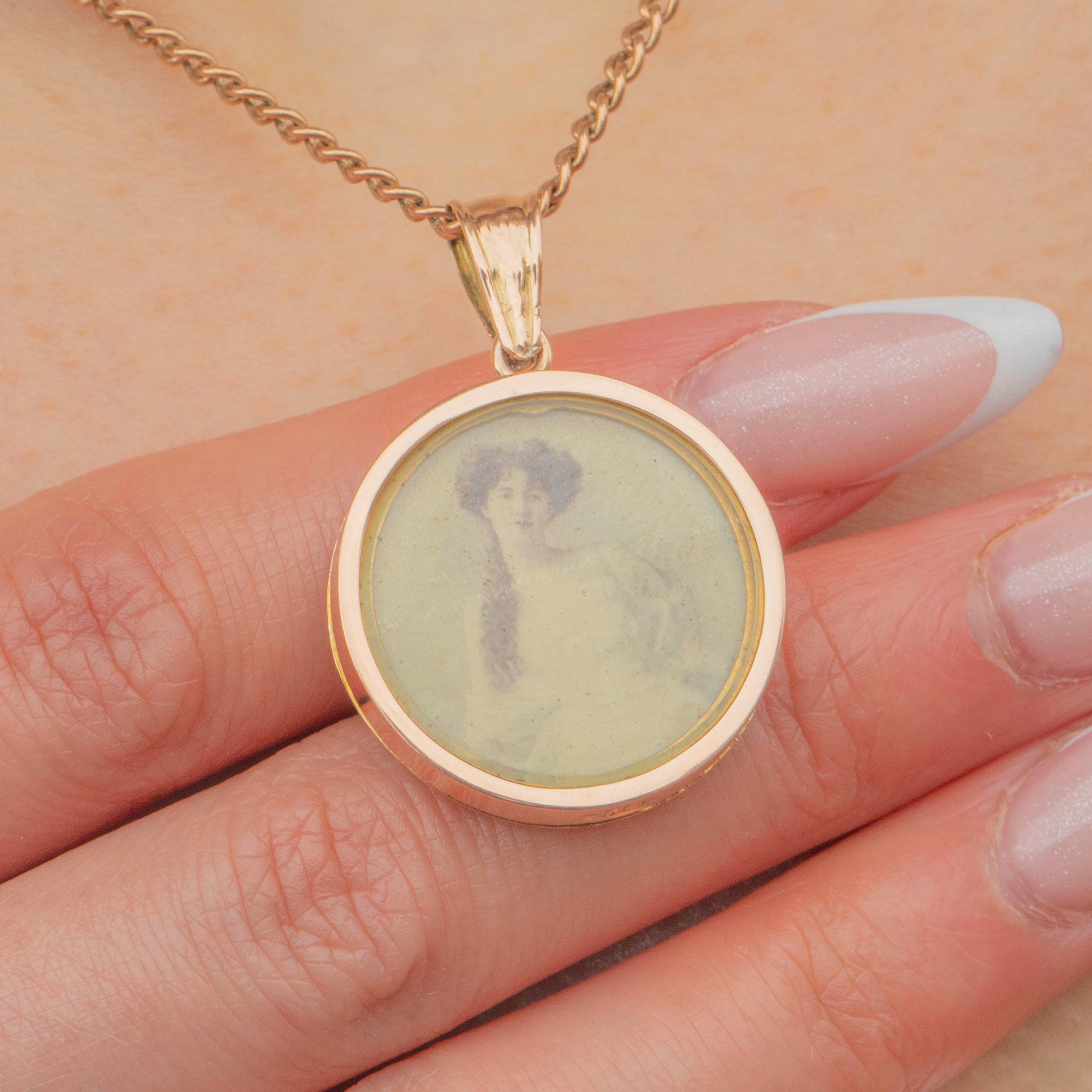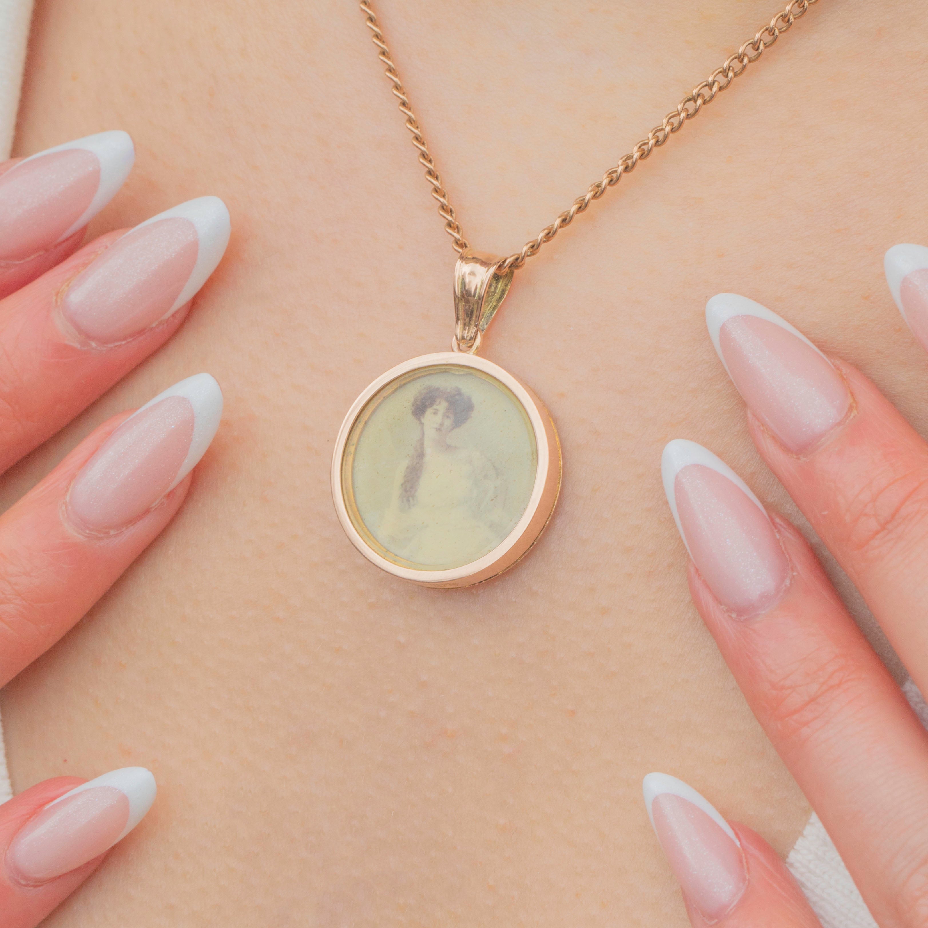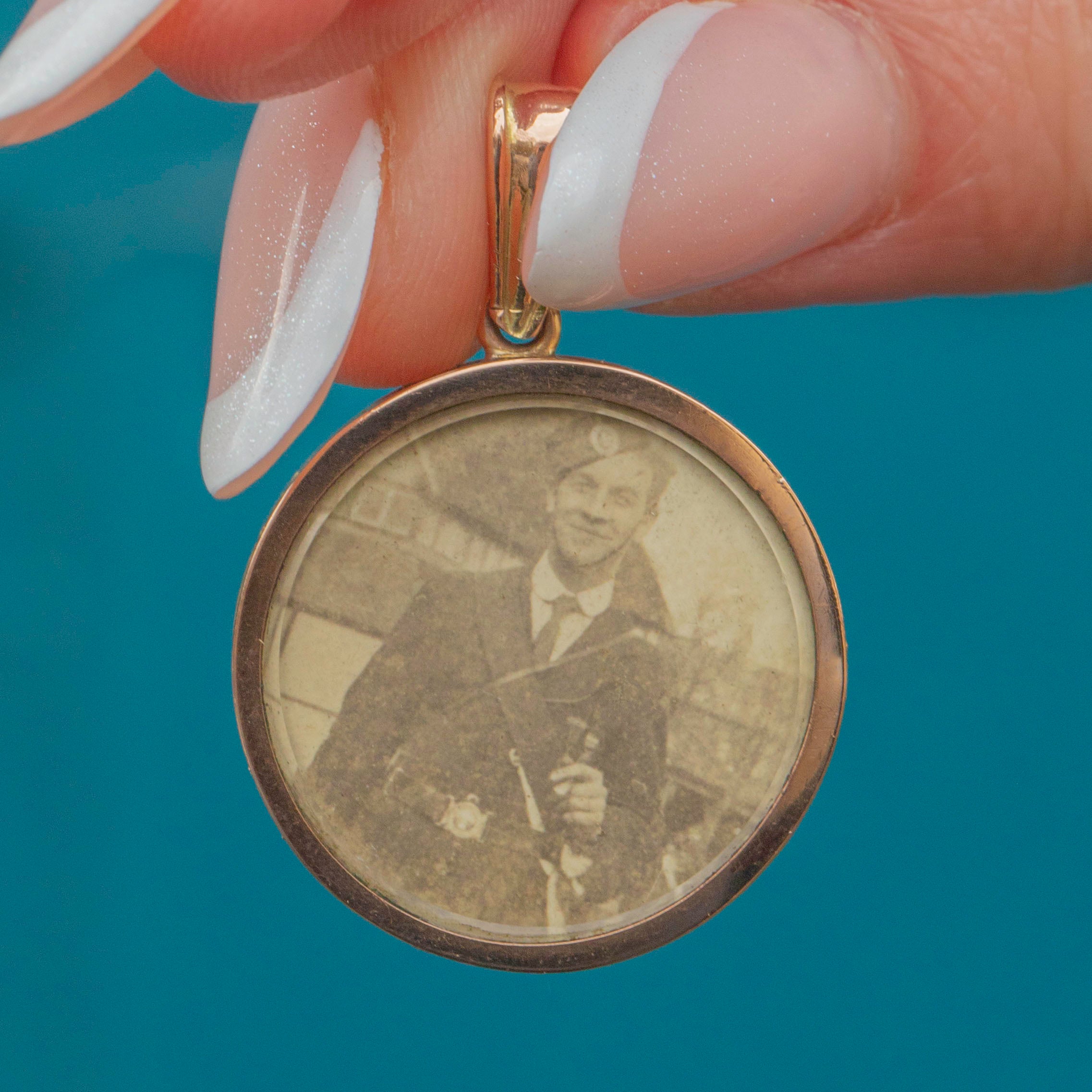 This Edwardian 9ct Gold round picture locket is an intriguing piece! Crafted from solid 9ct Gold, this antique locket still homes its original photographs beneath glass frames. On one side, a man dressed in uniform, and on the other, a woman wearing a delicate dress with the most exquisite hair-do; we can only begin to imagine the story behind this historical piece!