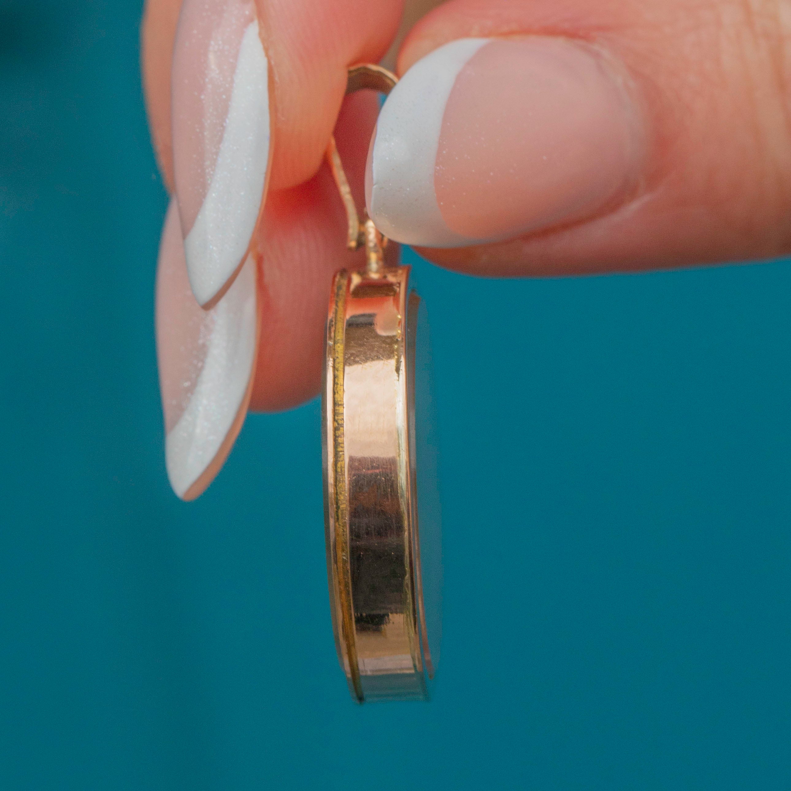 VERY GOOD: This Edwardian 9ct Gold round picture locket is in very good condition. The Gold is buttery and smooth, securely holding the frames in place. There is some mild age-related wear throughout, including some speckles visible on the glass panes, which is not surprising considering the age of the piece. The bale is securely affixed allowing you to suspend it form a skinny Gold chain with confidence!
