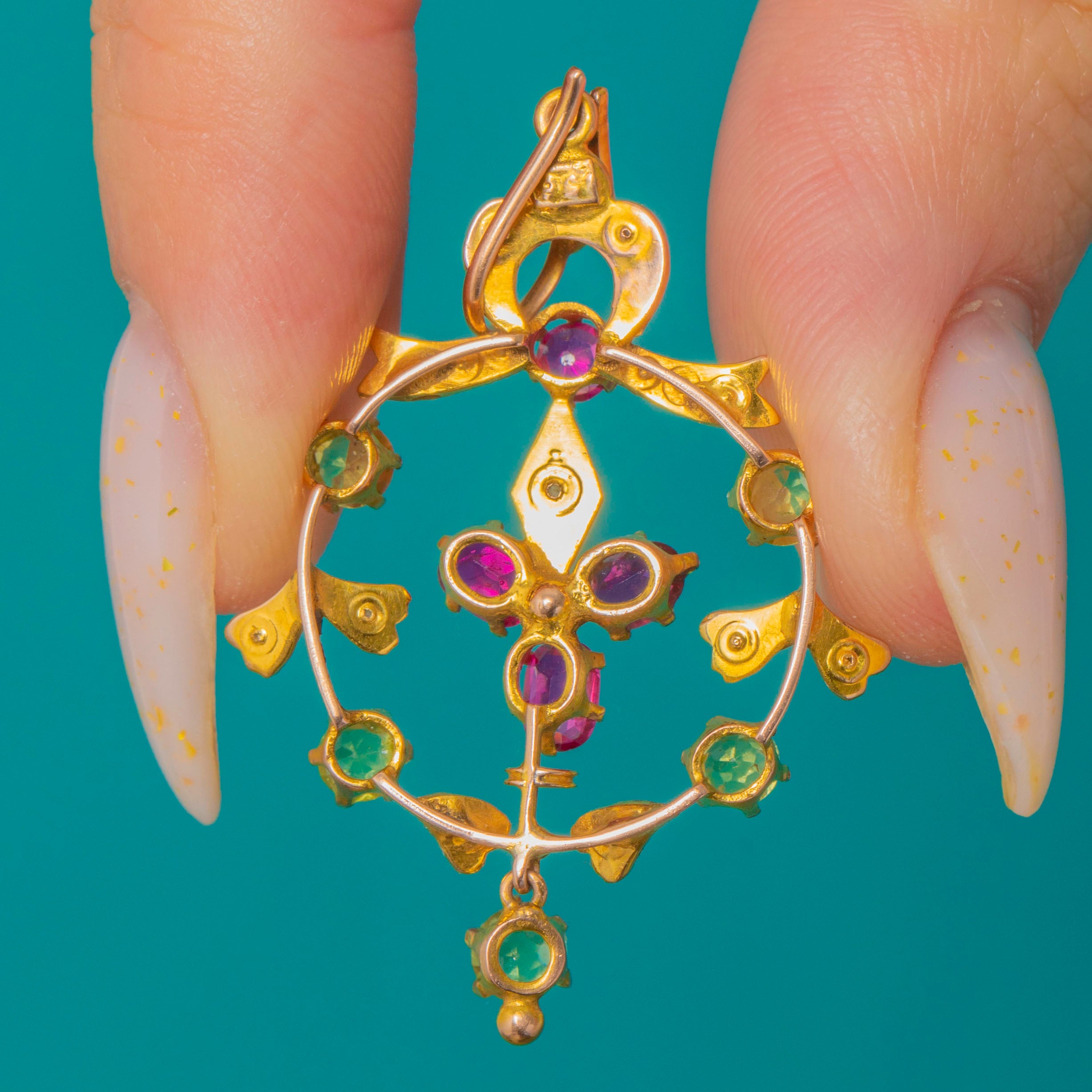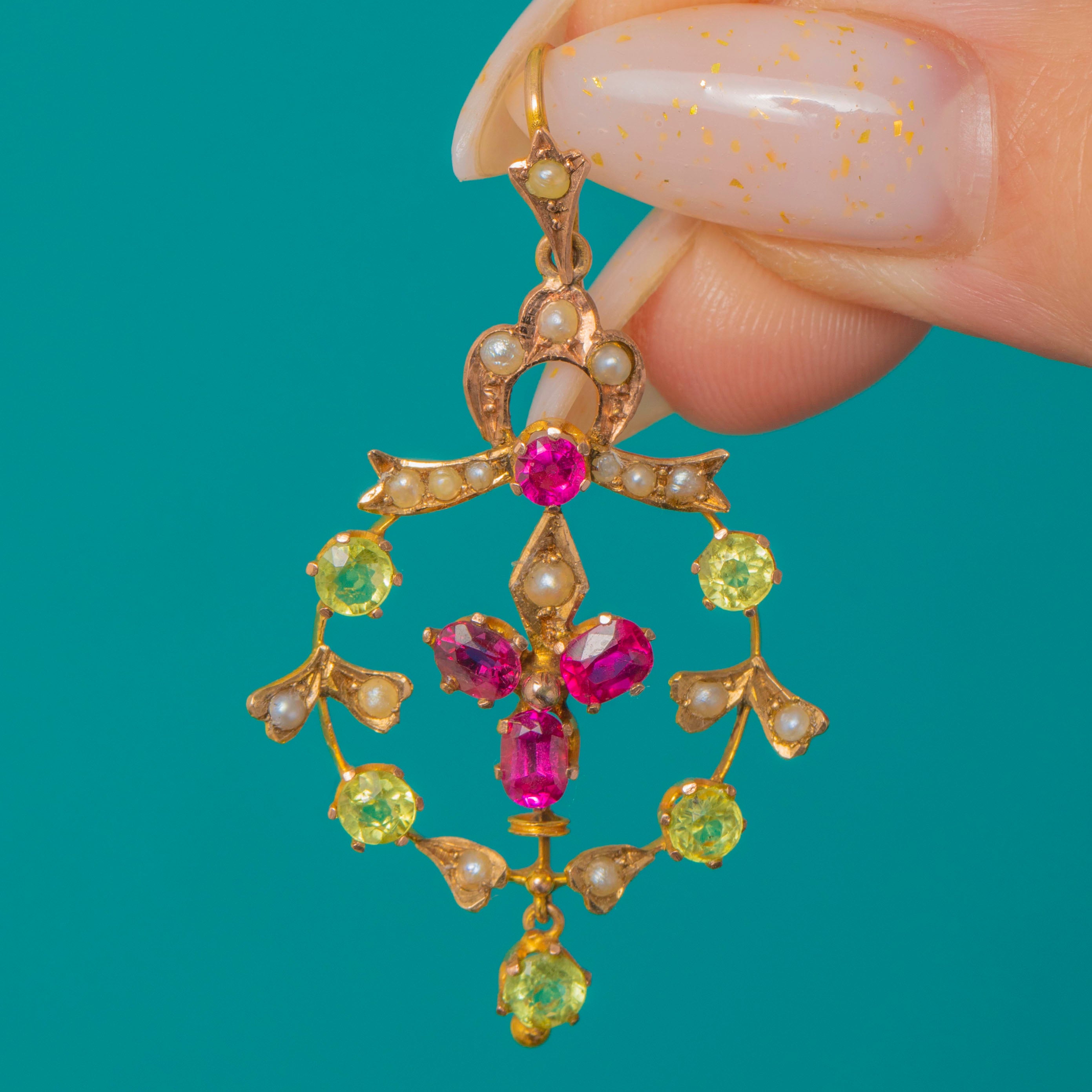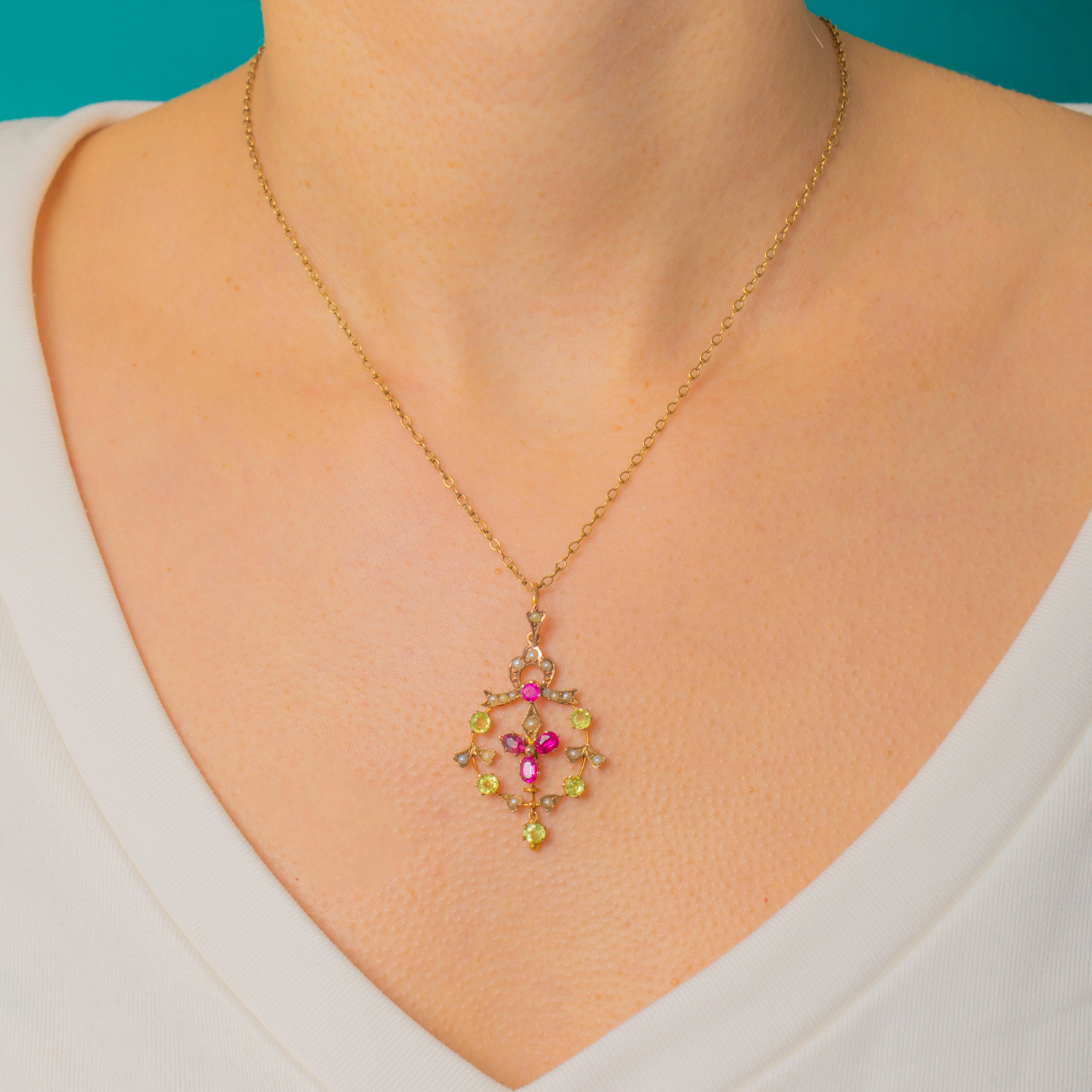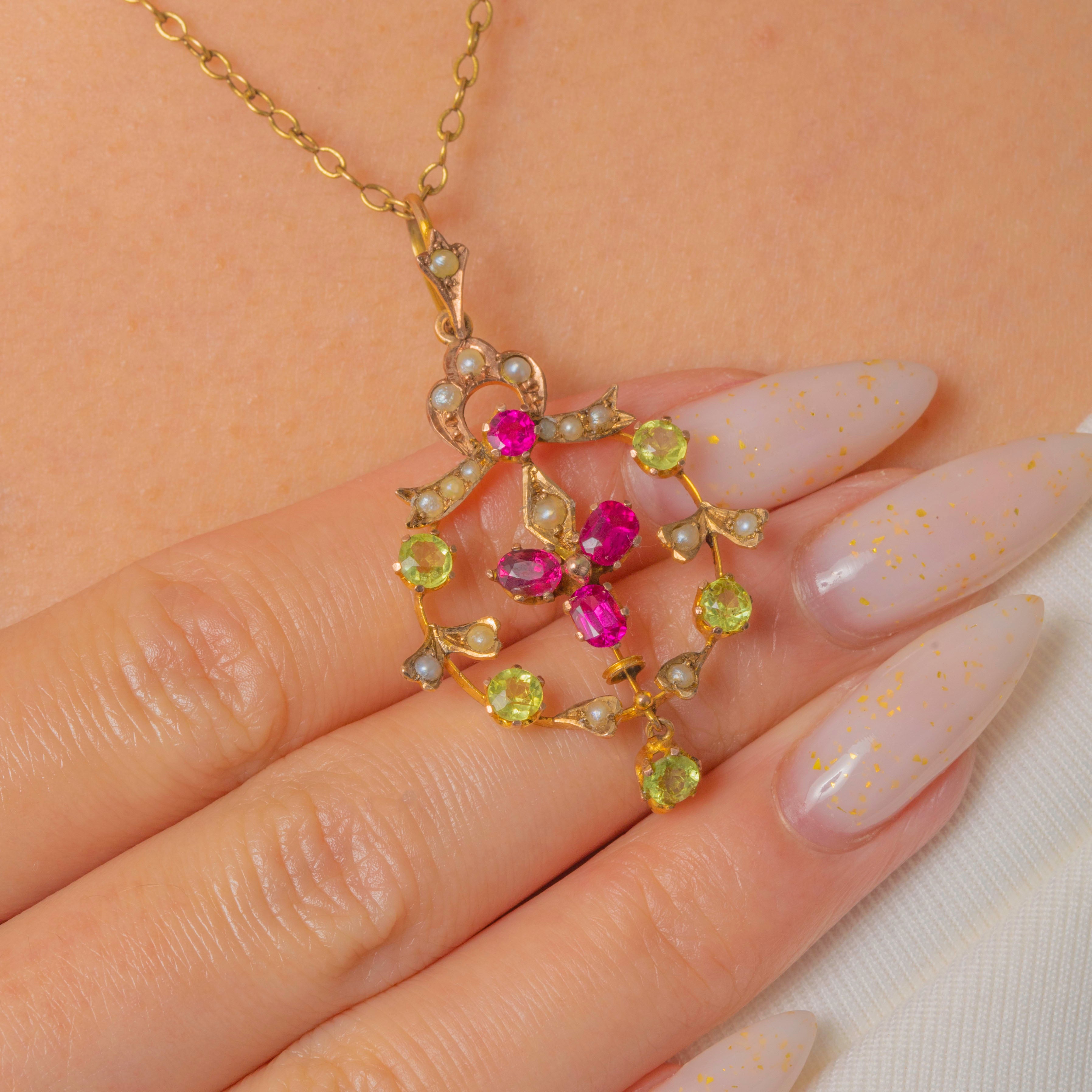 Graceful and romantic, this Edwardian pendant unfurls in sinuous foliate openwork, its warm 15ct Gold lending a soft antique glow. A lively arrangement of Synthetic Rubies and a bright Peridot is accented with delicate Pearls, while the articulated drop adds a flutter of movement with every step.