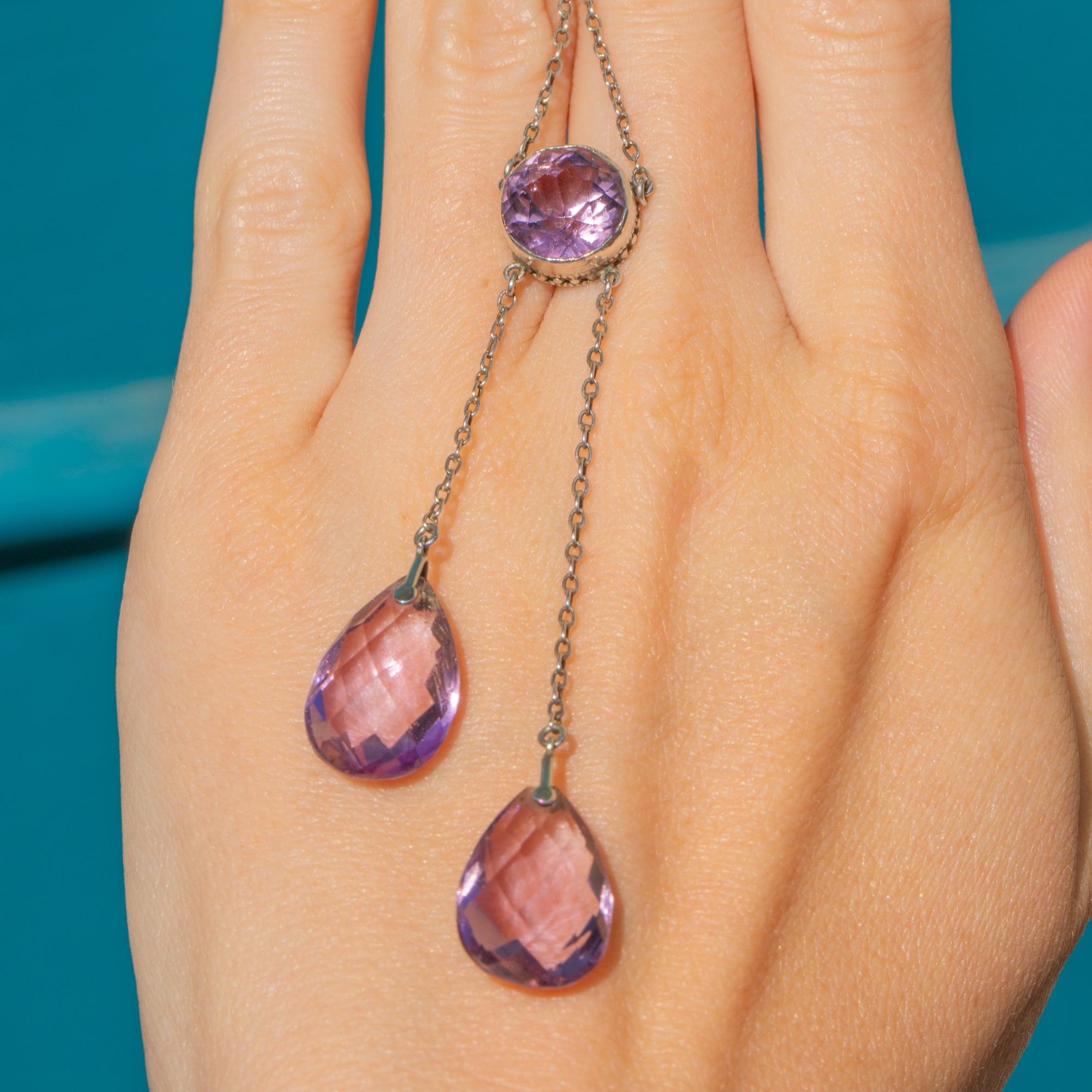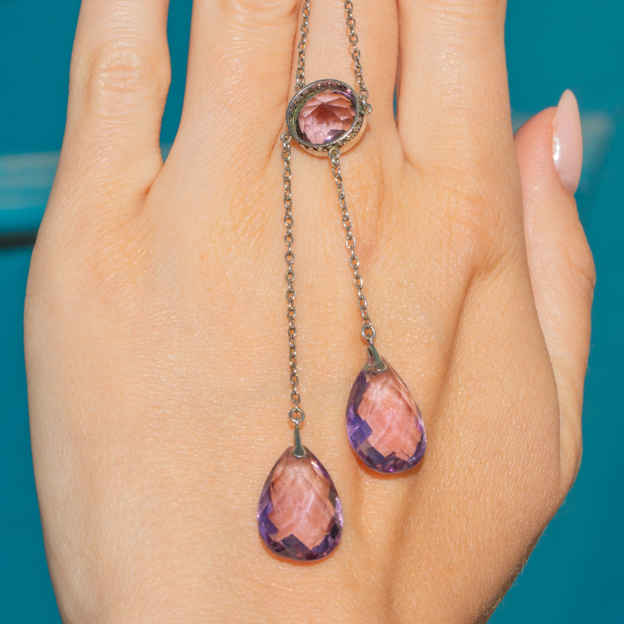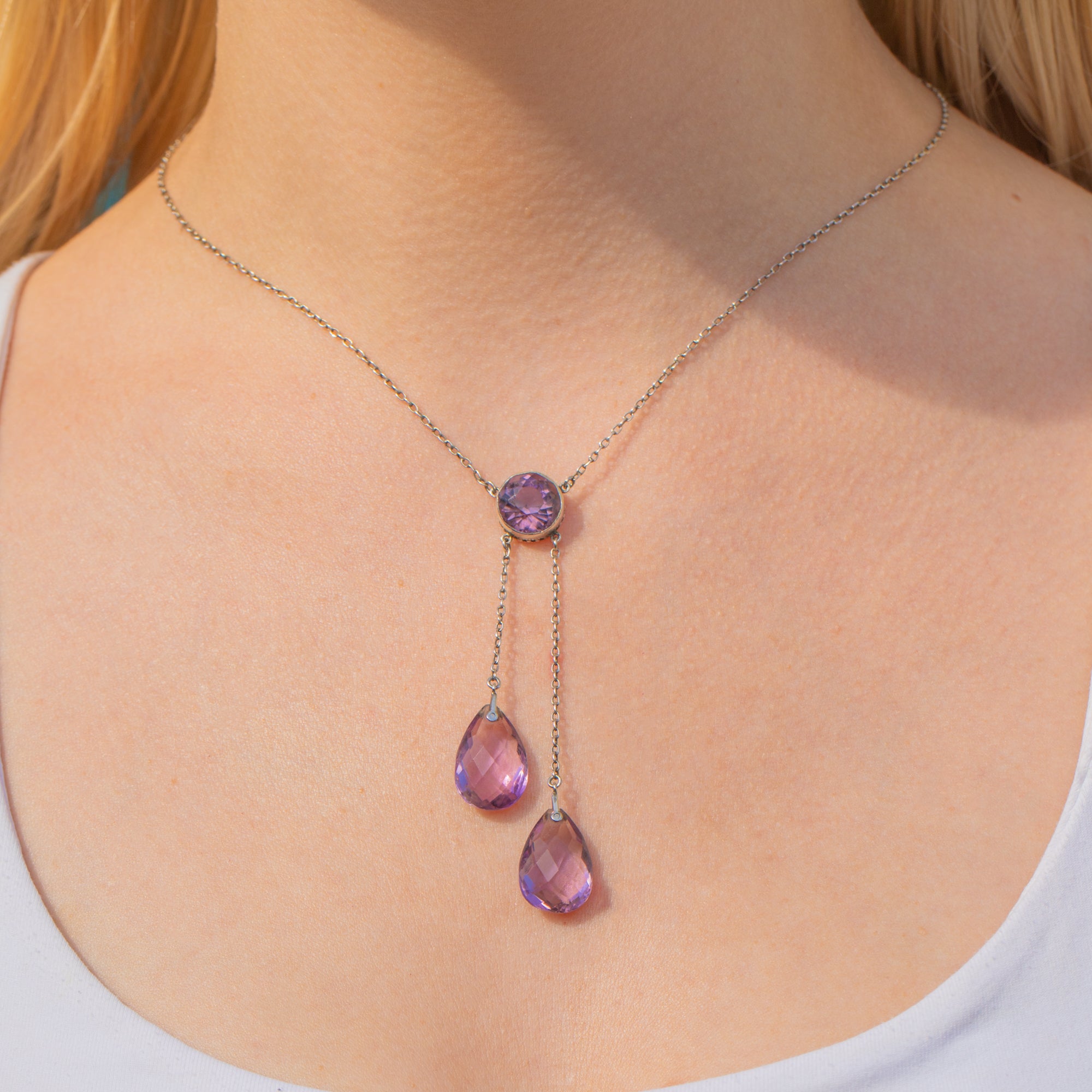 A true delight, this Edwardian Silver Amethyst negligee necklace is majestic! Her lavender hued Amethysts, with a combined carat weight of 16.85ct, are perfectly matched and the cool tones of her Silver that run through her chain and settings compleiemt them beautifully.