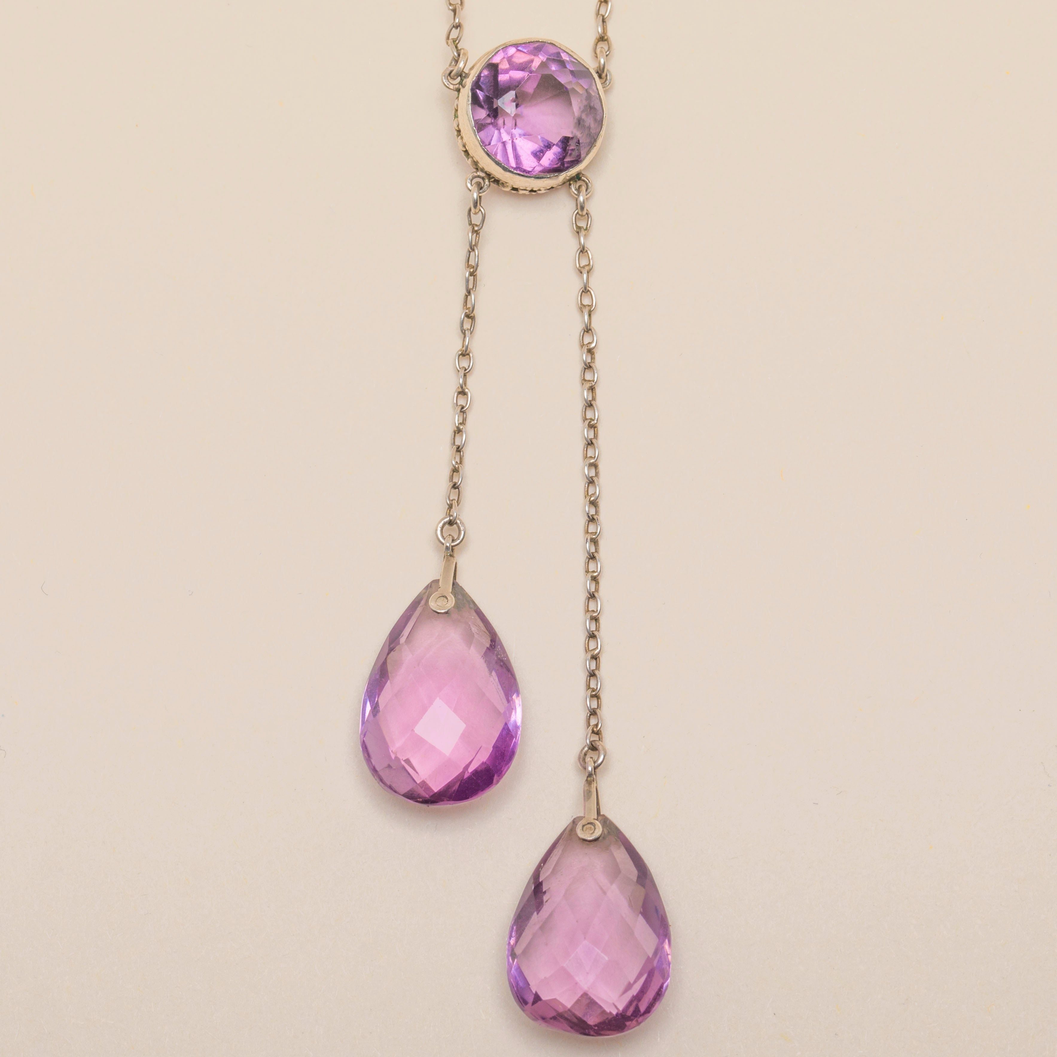 VERY GOOD. This Edwardian Silver Amethyst negligee necklace is in very good condition. Each Amethyst is securely connected to the main body of the necklace and have a uniform hue throughout. To the culet of the central Amethyst there is a small amount of surface wear, but this cannot be seen when worn. With a nice and sturdy chain, he negligee design remains the centre of attention, secured around your neck by the fully functioning bolt ring.