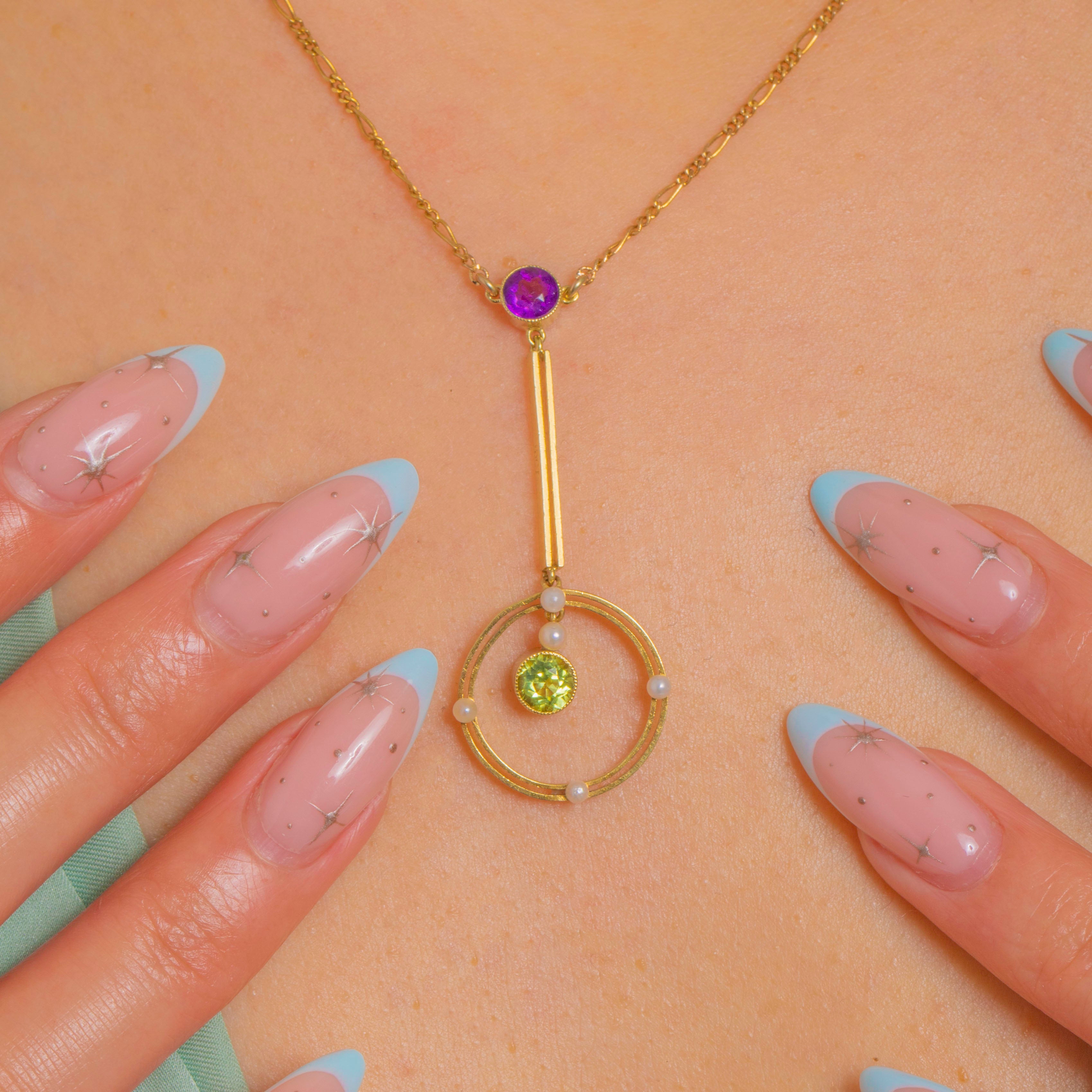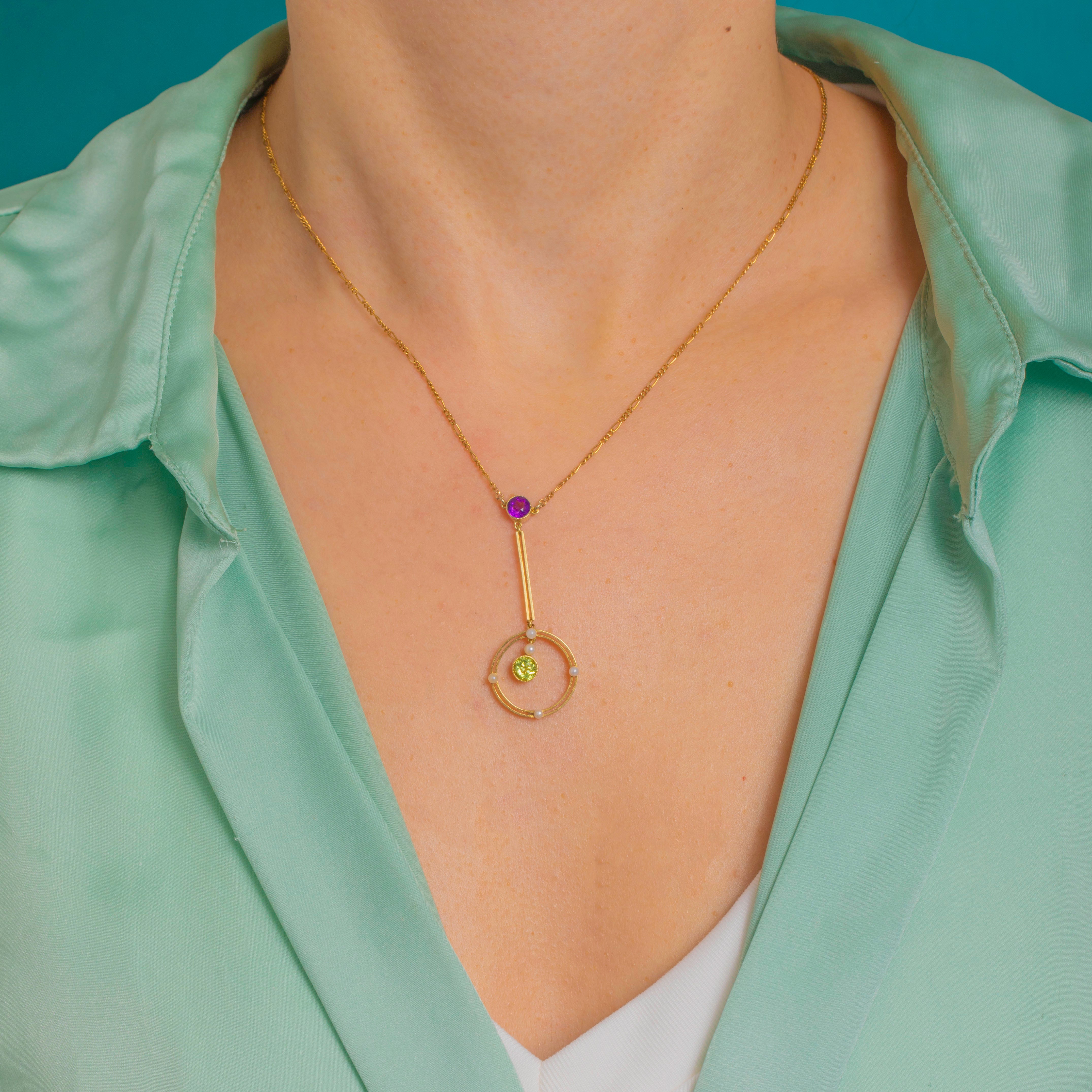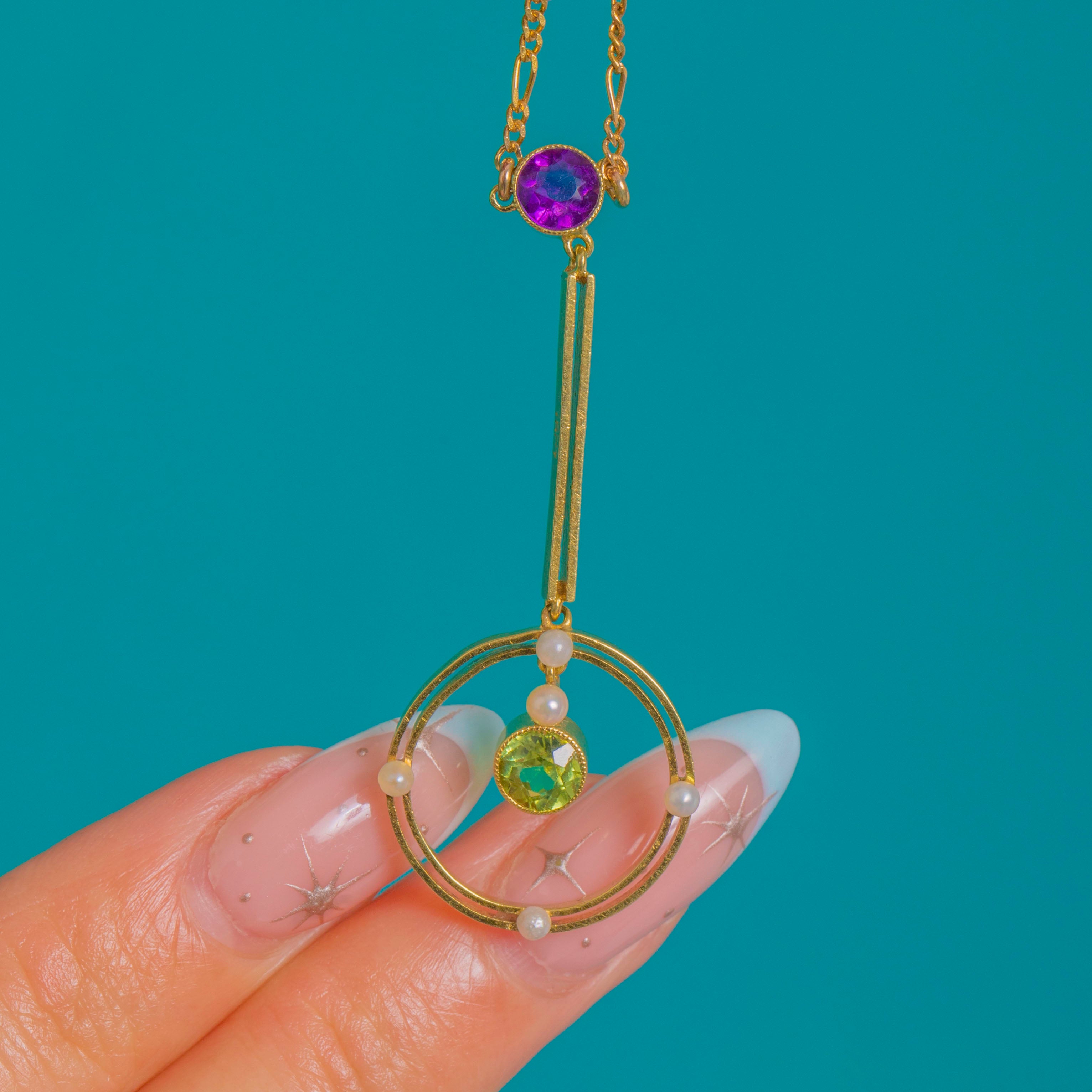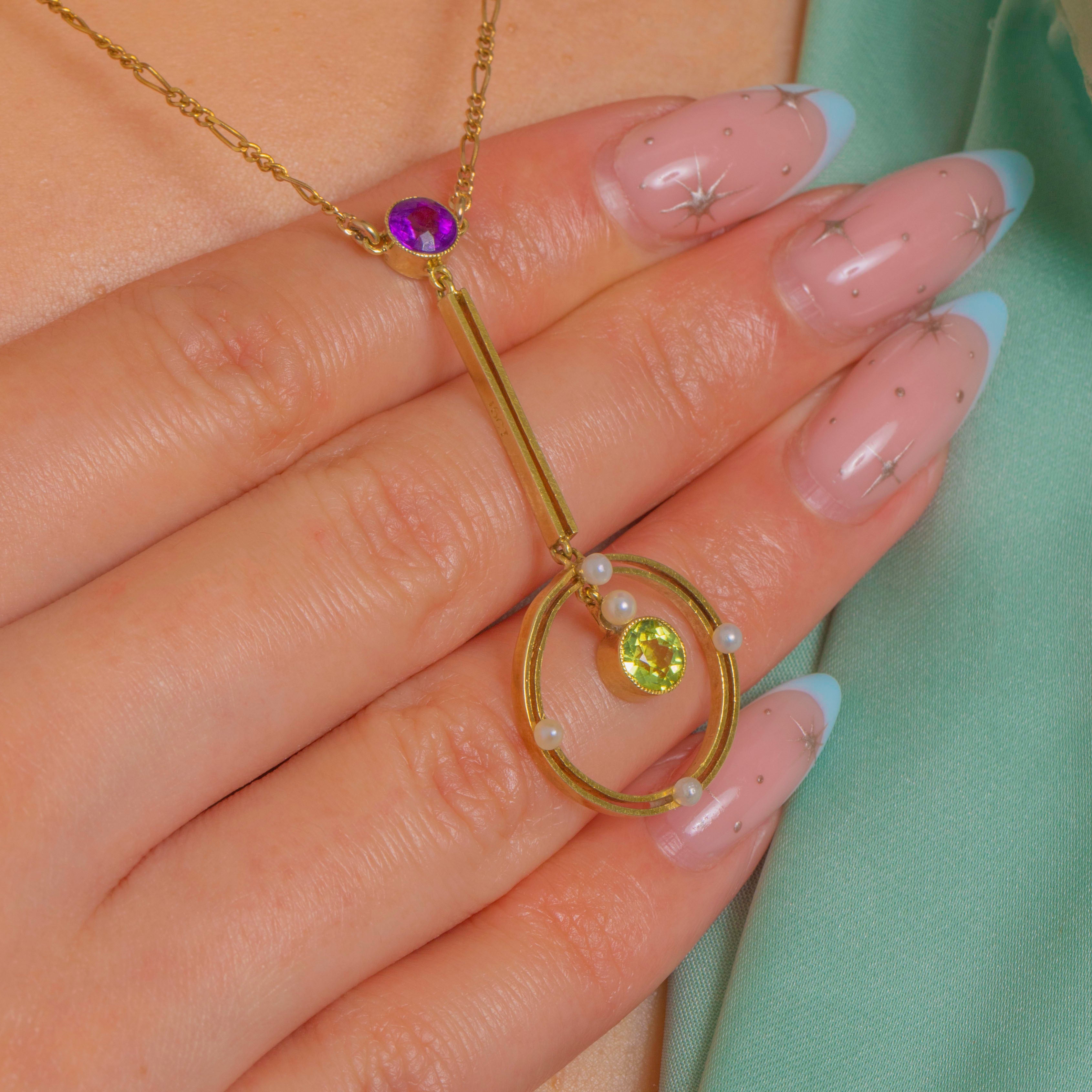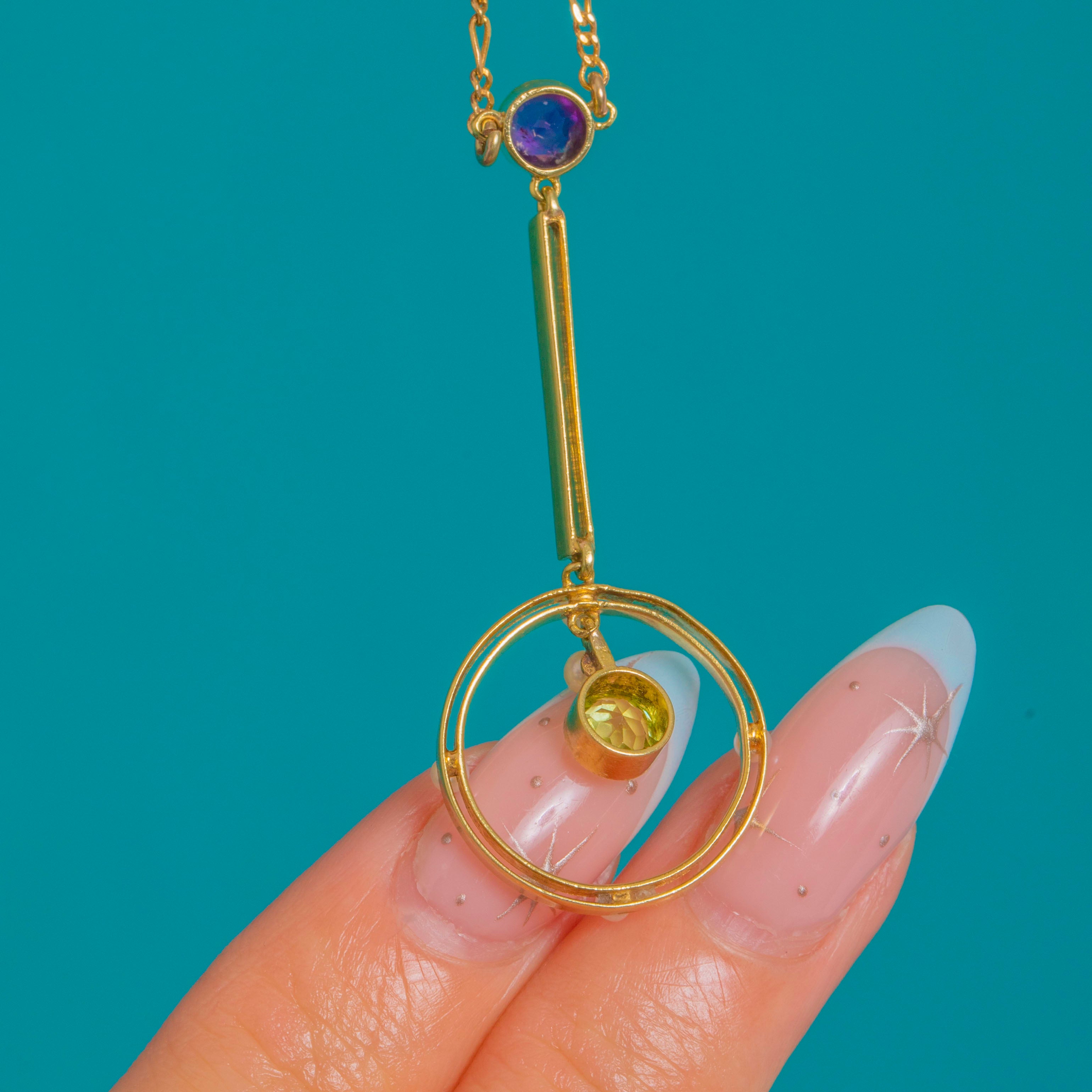 A graceful Edwardian necklace in softly glowing 15ct Gold, this articulated drop marries delicate geometry with a luminous Suffragette palette. A round Amethyst crowns a slender bar above a circular frame dotted with petite Seed Pearls, while a vivid Peridot is suspended at the centre, dancing with every movement. Open-backed, bezel settings invite the light to flow through the stones, enhancing their colour and sparkle.