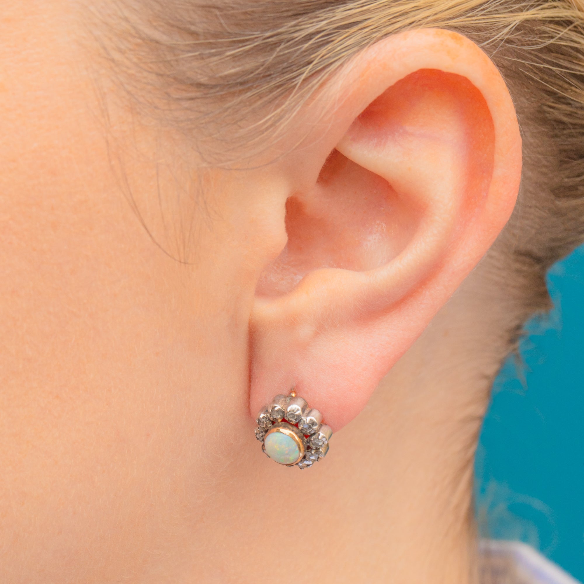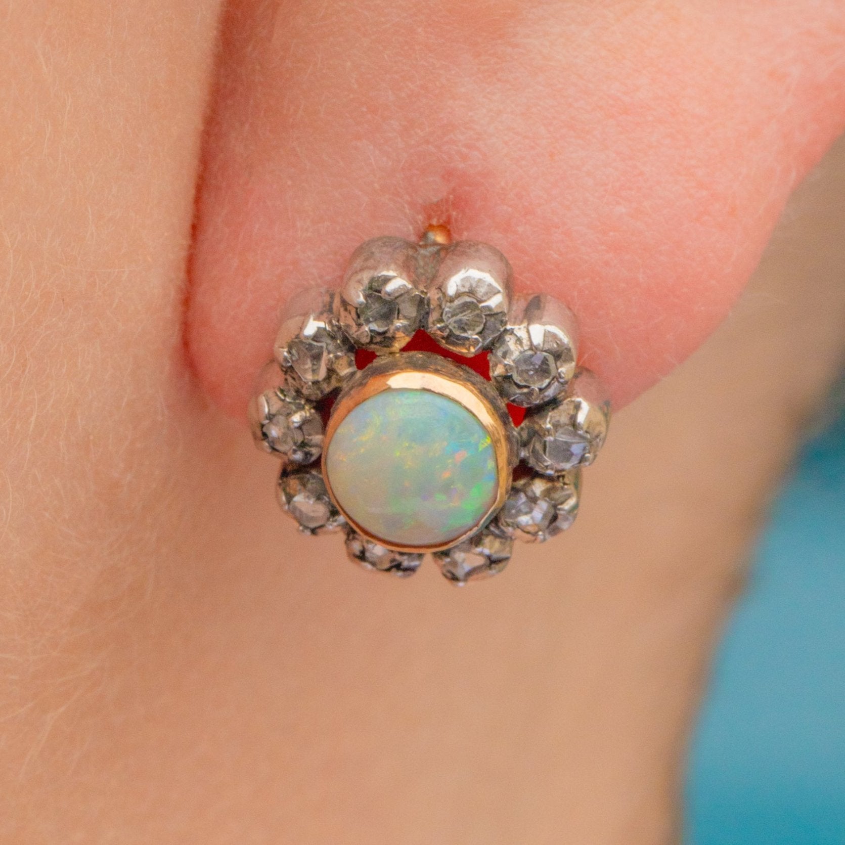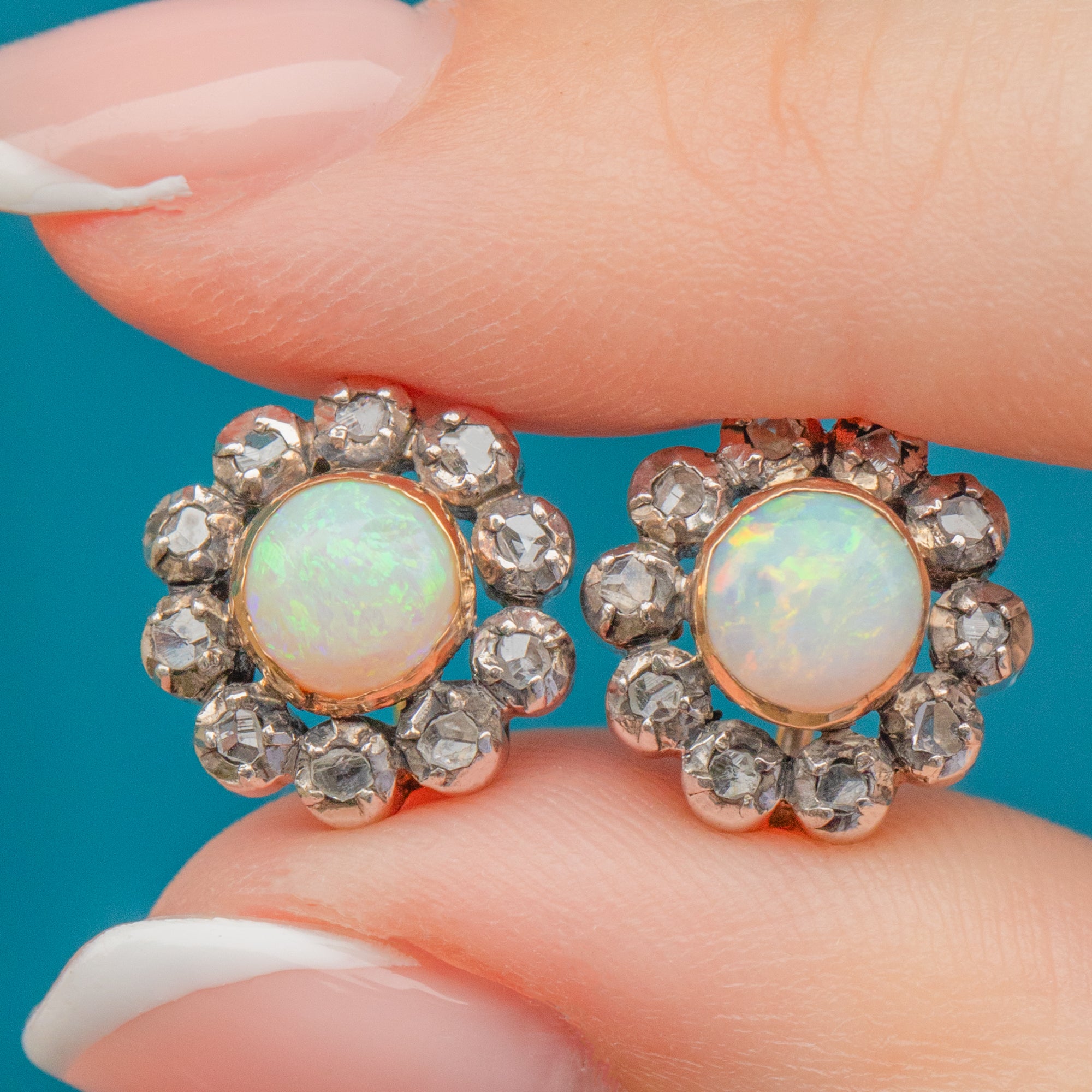 These enchanting Edwardian Opal Diamond flower cluster earrings are exquisite. Their hypnotising multi-coloured Opals are haloed by a cluster of glistening rose-cut diamonds, they are positively mesmerising.