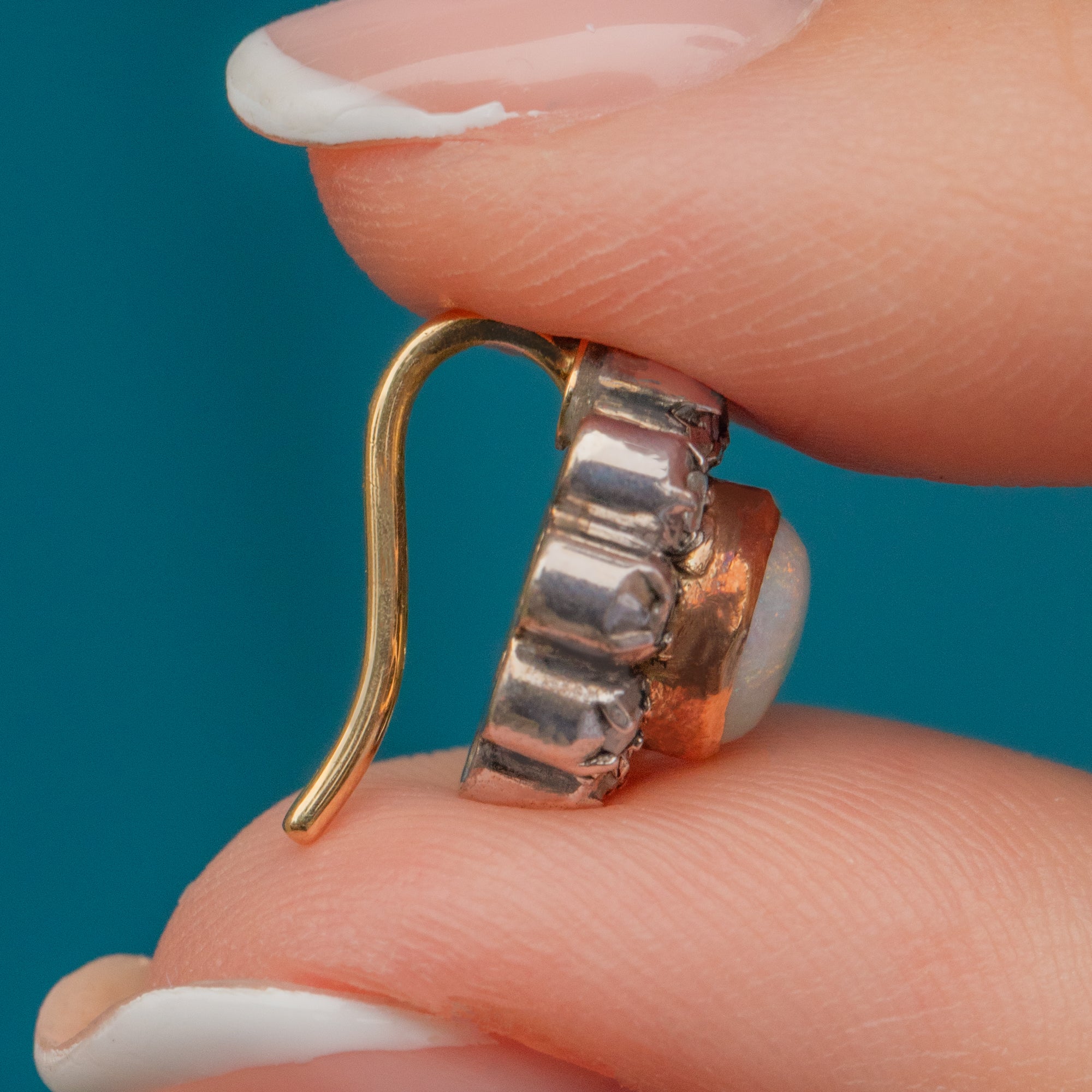 MATERIALS: Tests as 18ct Gold hooks with Platinum settings, Opal (0.60ct), Rose-Cut Diamond (0.30ct)