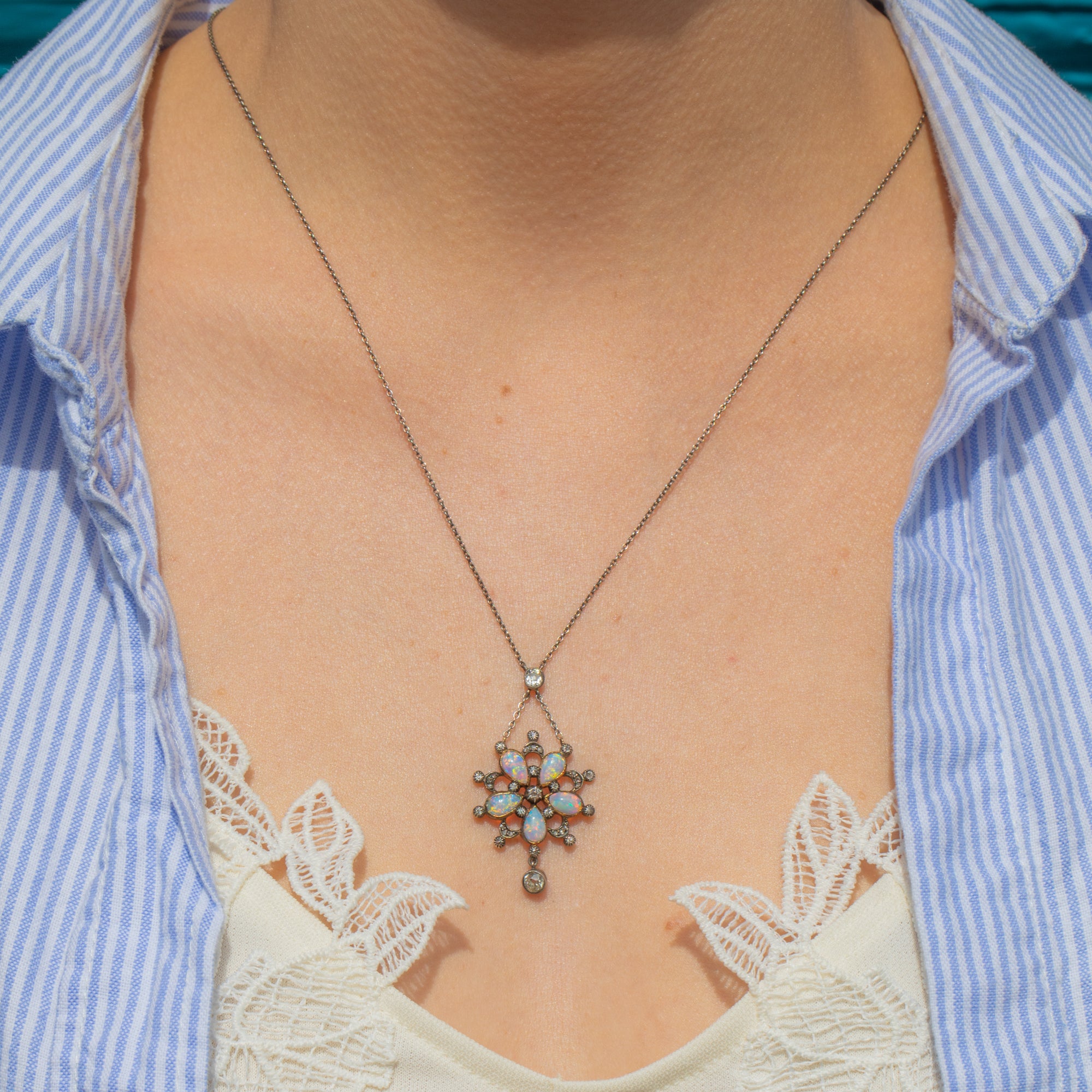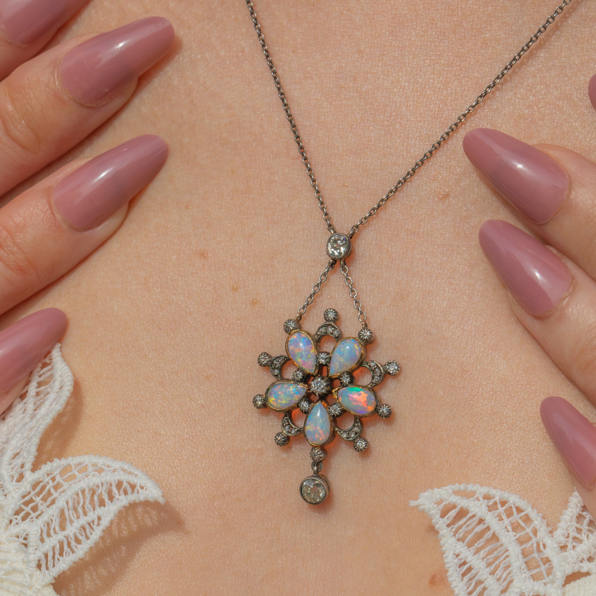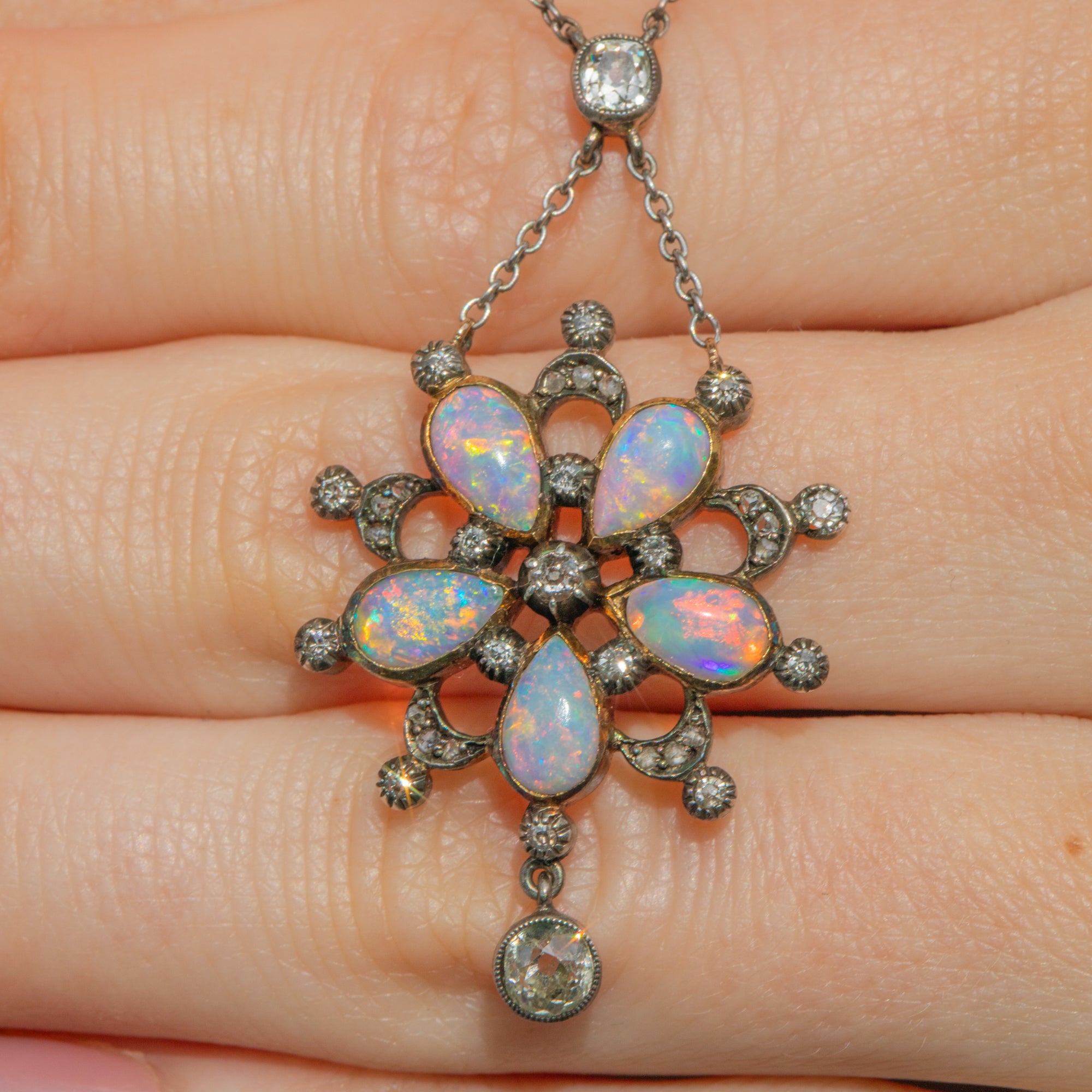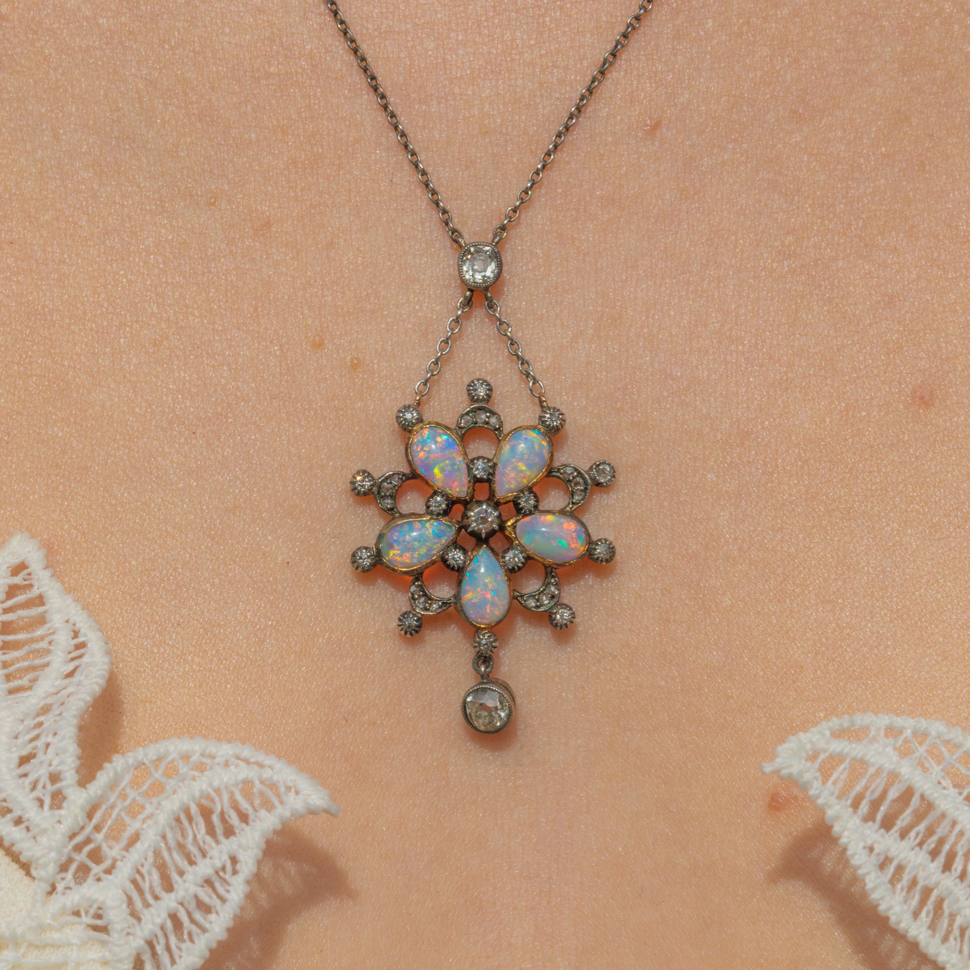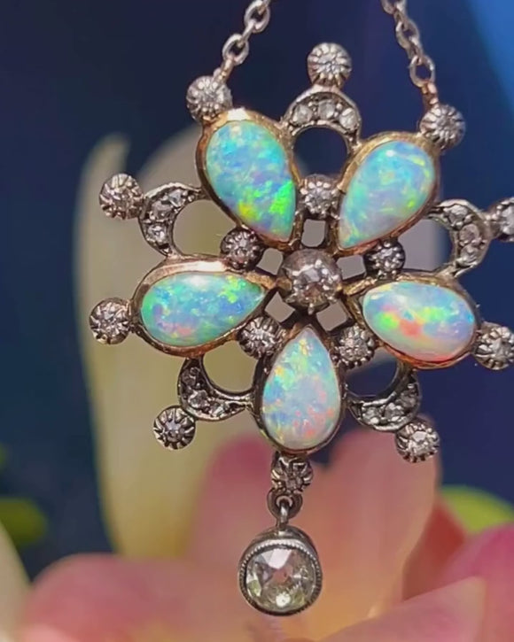 Edwardian Opal & Diamond Flower Drop Necklace