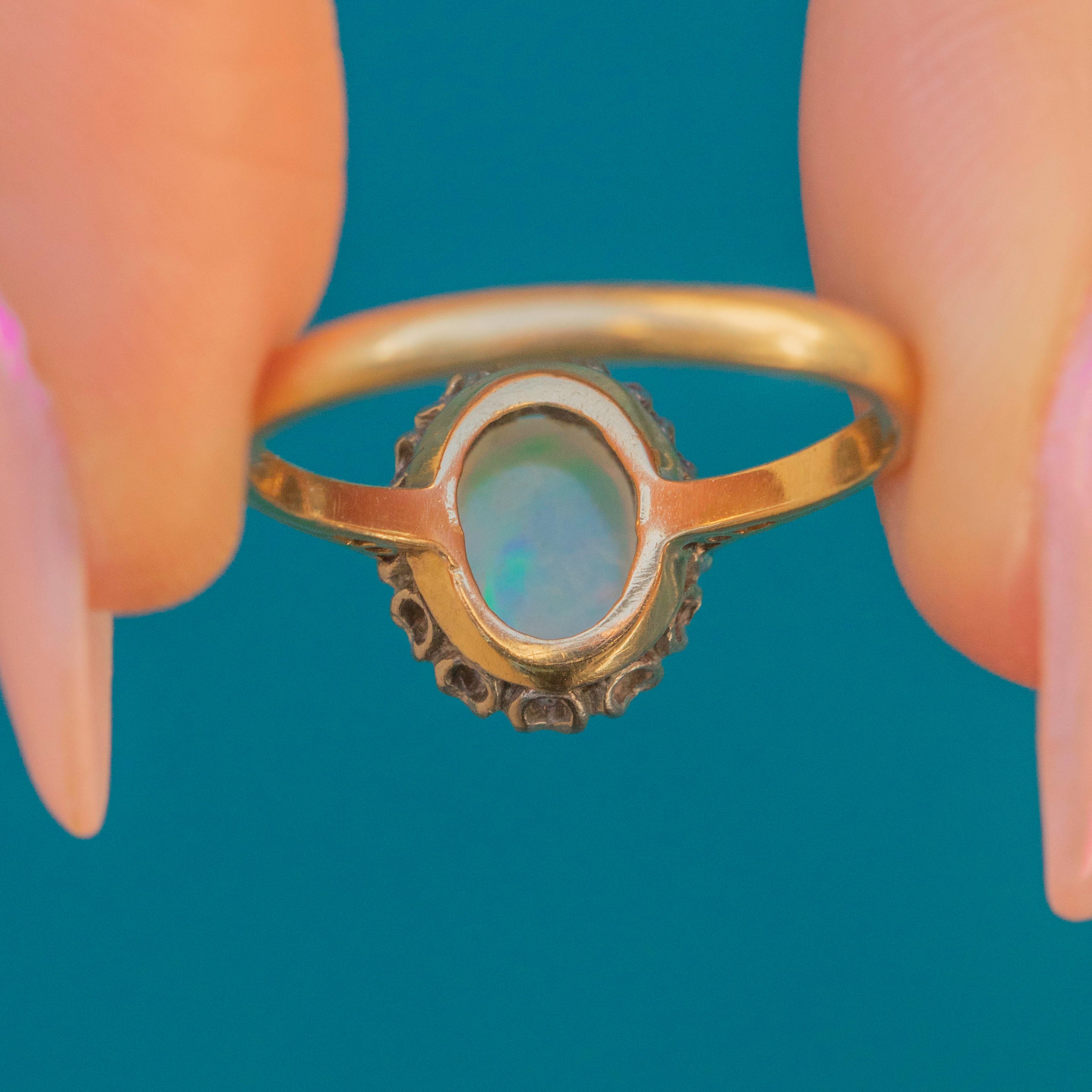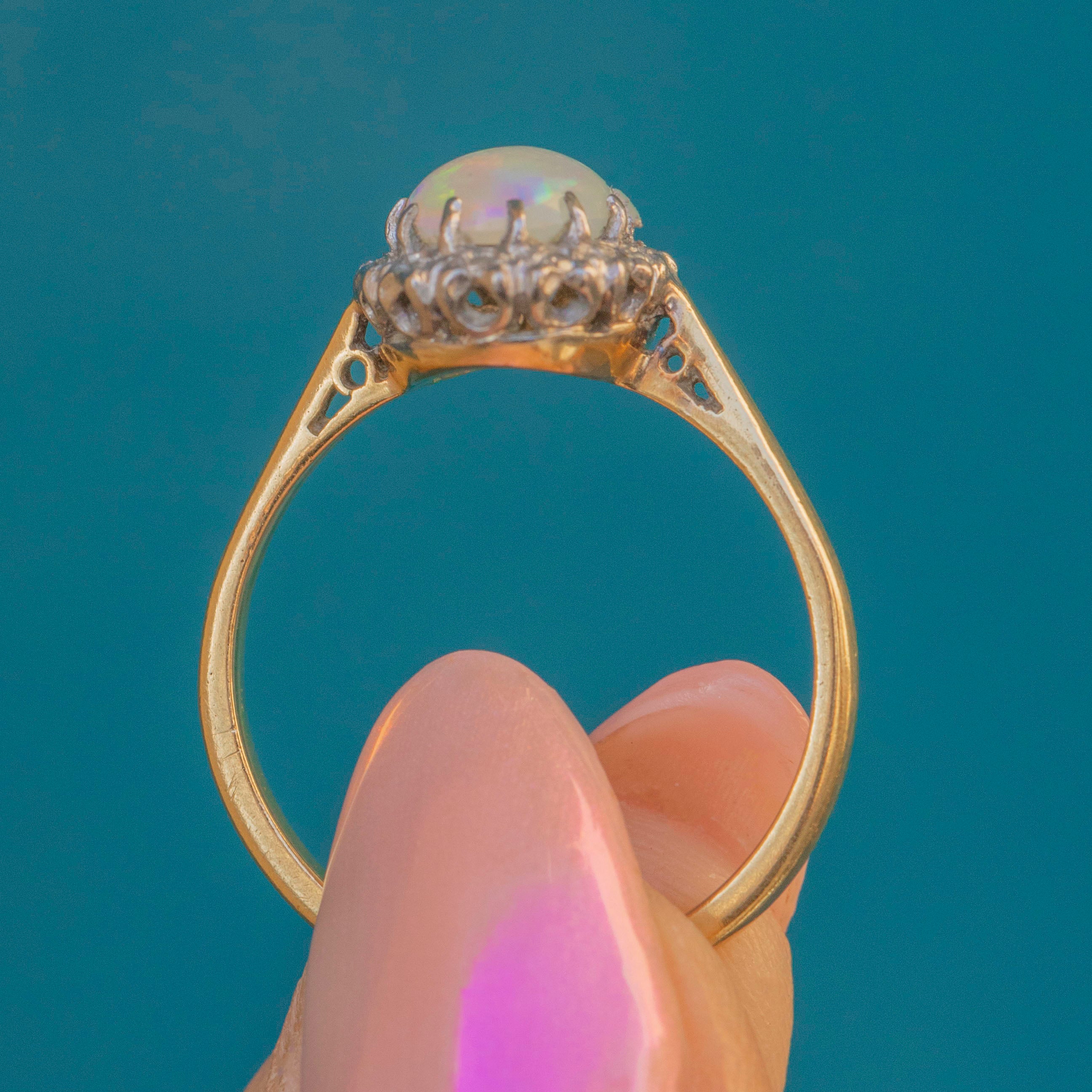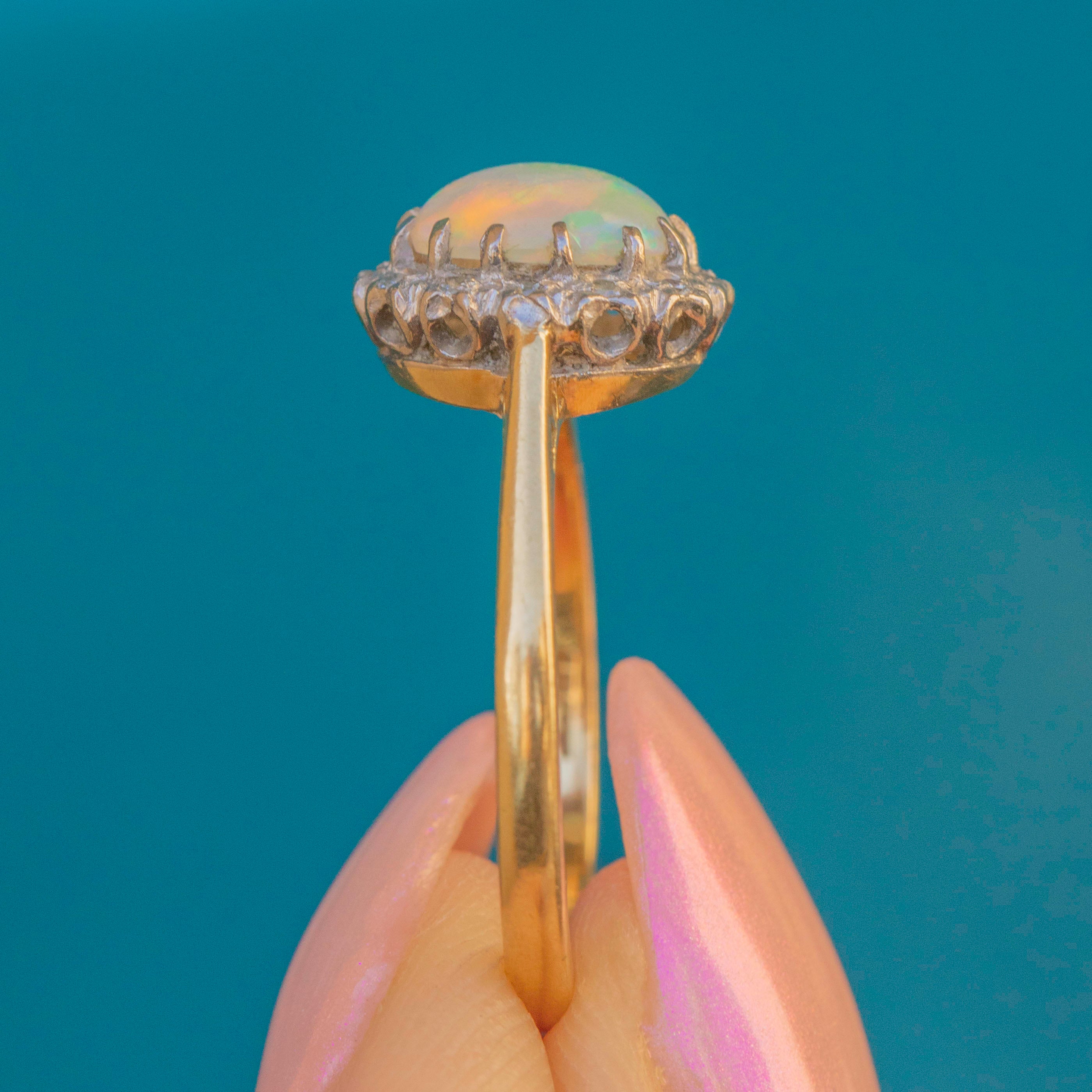 EXCELLENT. This antique 18ct Gold Opal Diamond ring is in excellent condition. The Opal is securely set and free from any scuffs or surface wear. The Diamonds are gorgeous and sparkle beautifully. With little else to note, she is in wonderful condition!