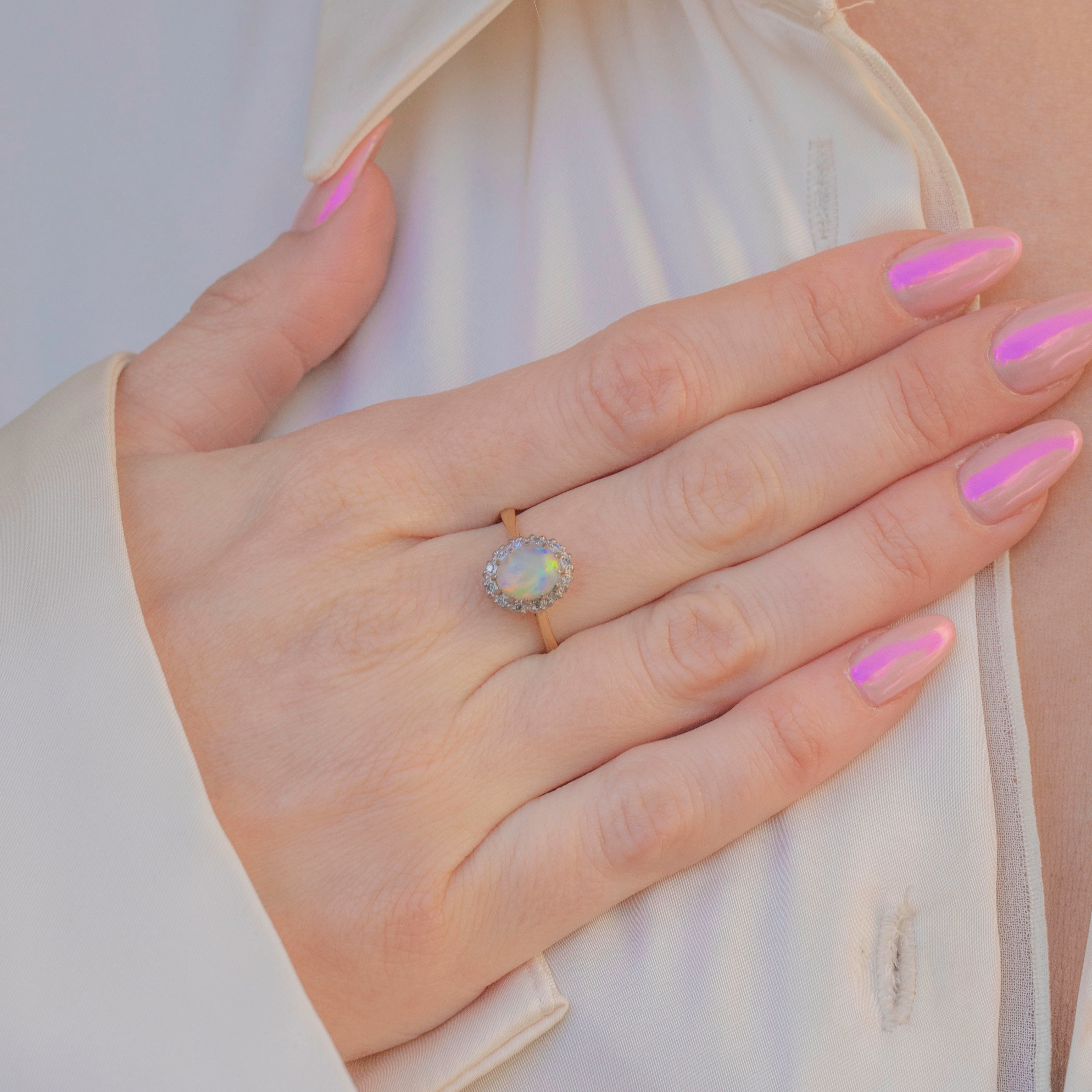 This exquisite Edwardian 18ct Gold Opal Diamond ring is the perfect balance of luxury and elegance to add to your collection! A stunning iridescent Opal, with plenty of fire, billows the light wonderfully and displays an array of blues, yellows, and oranges to feast your eyes on!