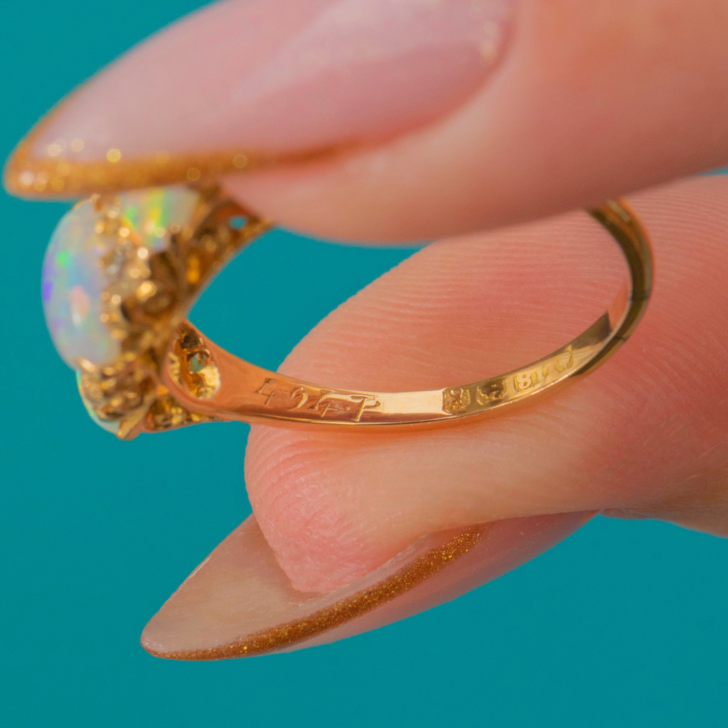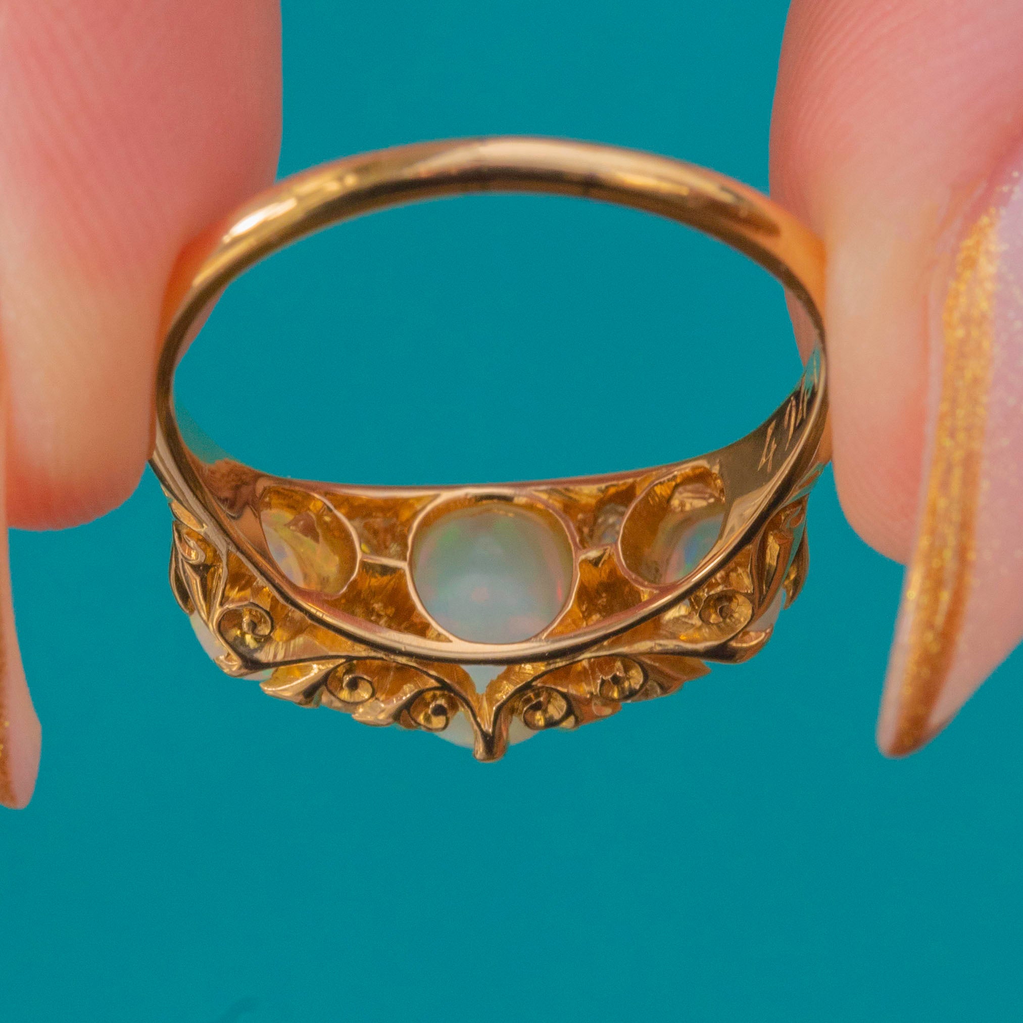 VERY GOOD: The Opals are bright and secure, showing beautiful play-of-colour across all three stones, and the Diamonds are well-set with lively sparkle. The 18ct Gold band shows two old resizing marks to the reverse, commensurate with age, otherwise beautifully preserved with only light antique wear.