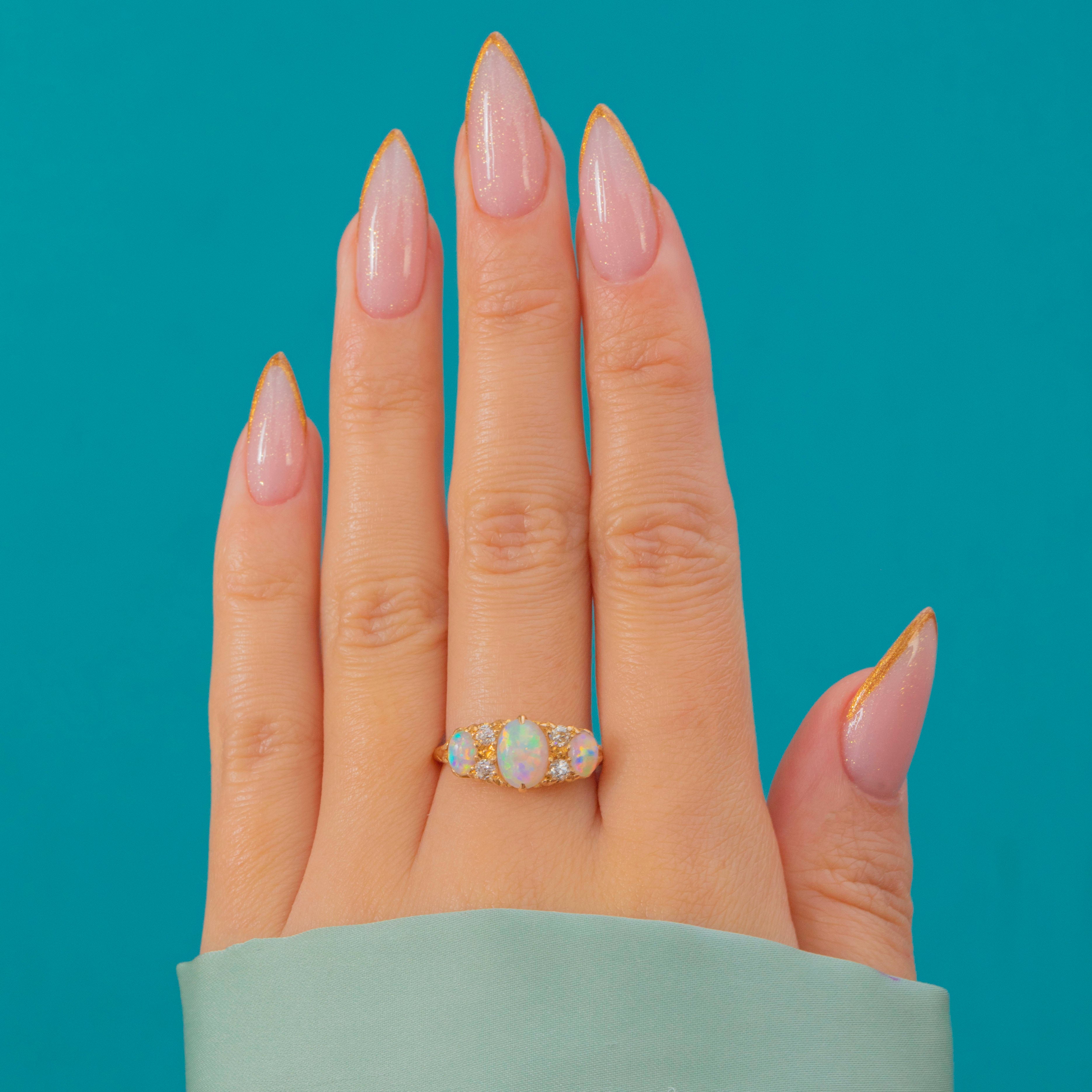 An exquisite Edwardian Opal trilogy ring, fully hallmarked for the year 1906. This romantic antique design features a luminous trio of Opals displaying bright rainbow flashes of green, turquoise, and orange, accented by four sparkling old-cut Diamonds nestled between.