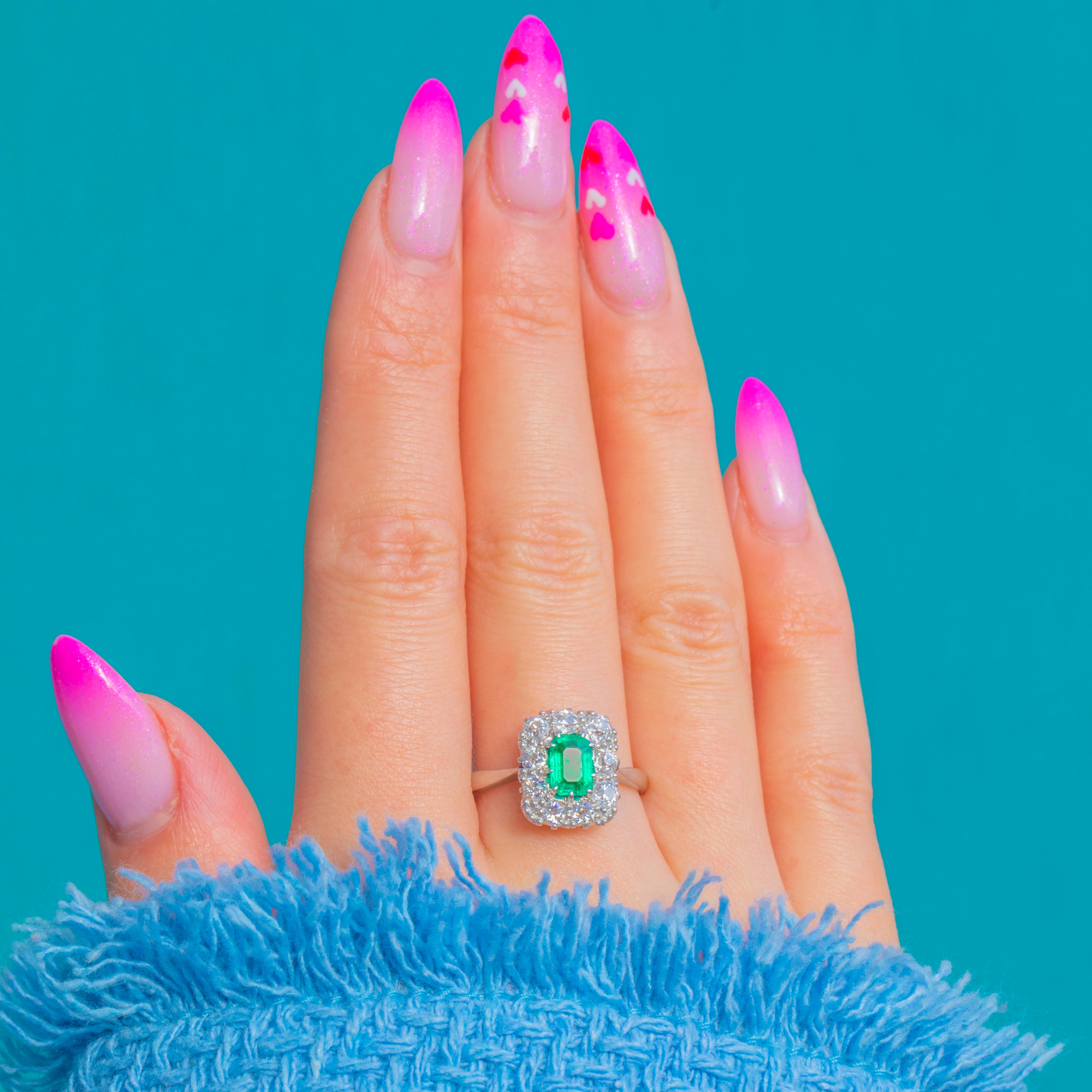 A luminous Edwardian Platinum cluster ring centred by a vivid rectangular step-cut Emerald, framed by a sparkling halo of bright, white Diamonds. The geometric halo and beautifully pierced openwork gallery bring a refined elegance to the piece, while the cool sheen of Platinum accentuates the crisp lines and scintillation of the Diamonds (approx. 0.70ct total).