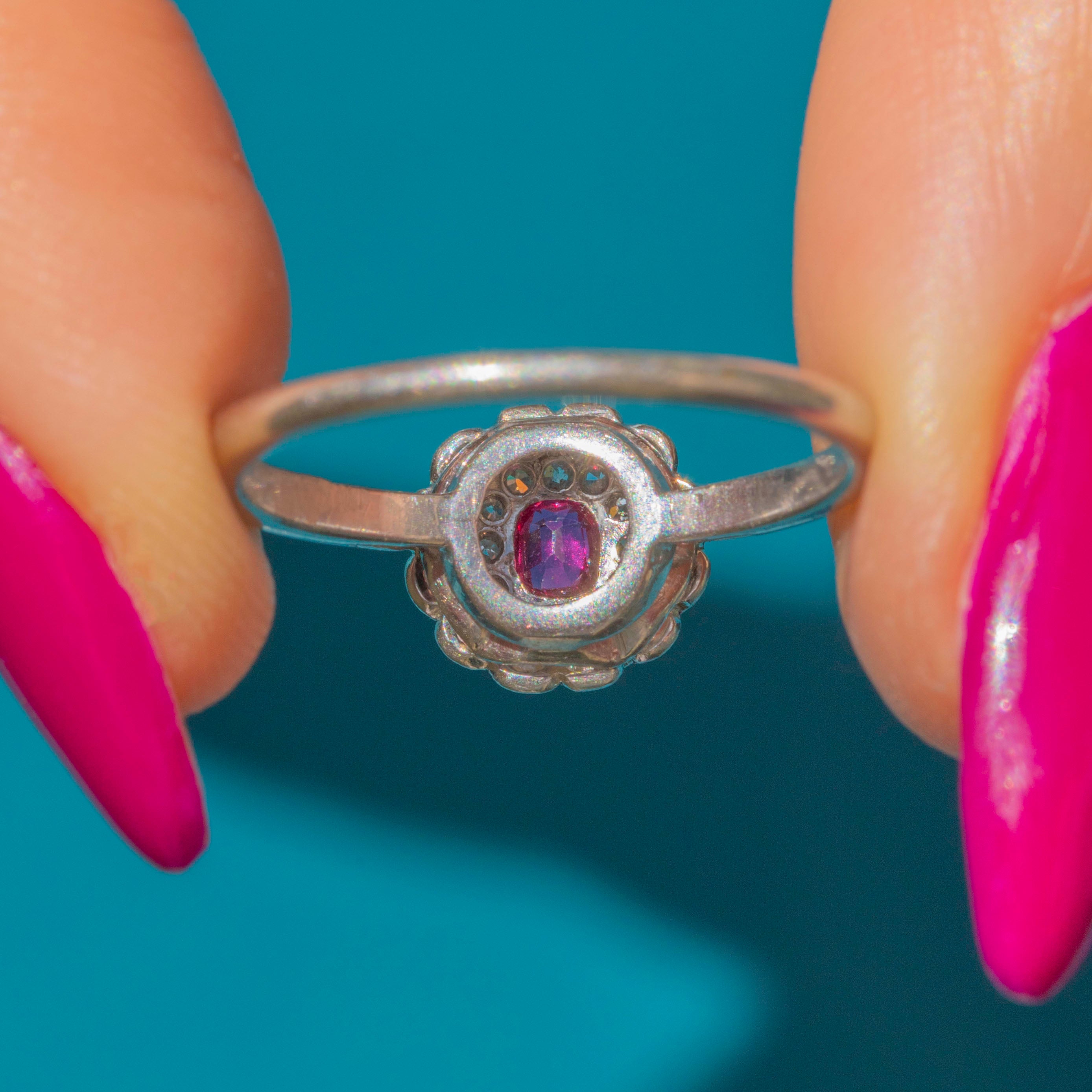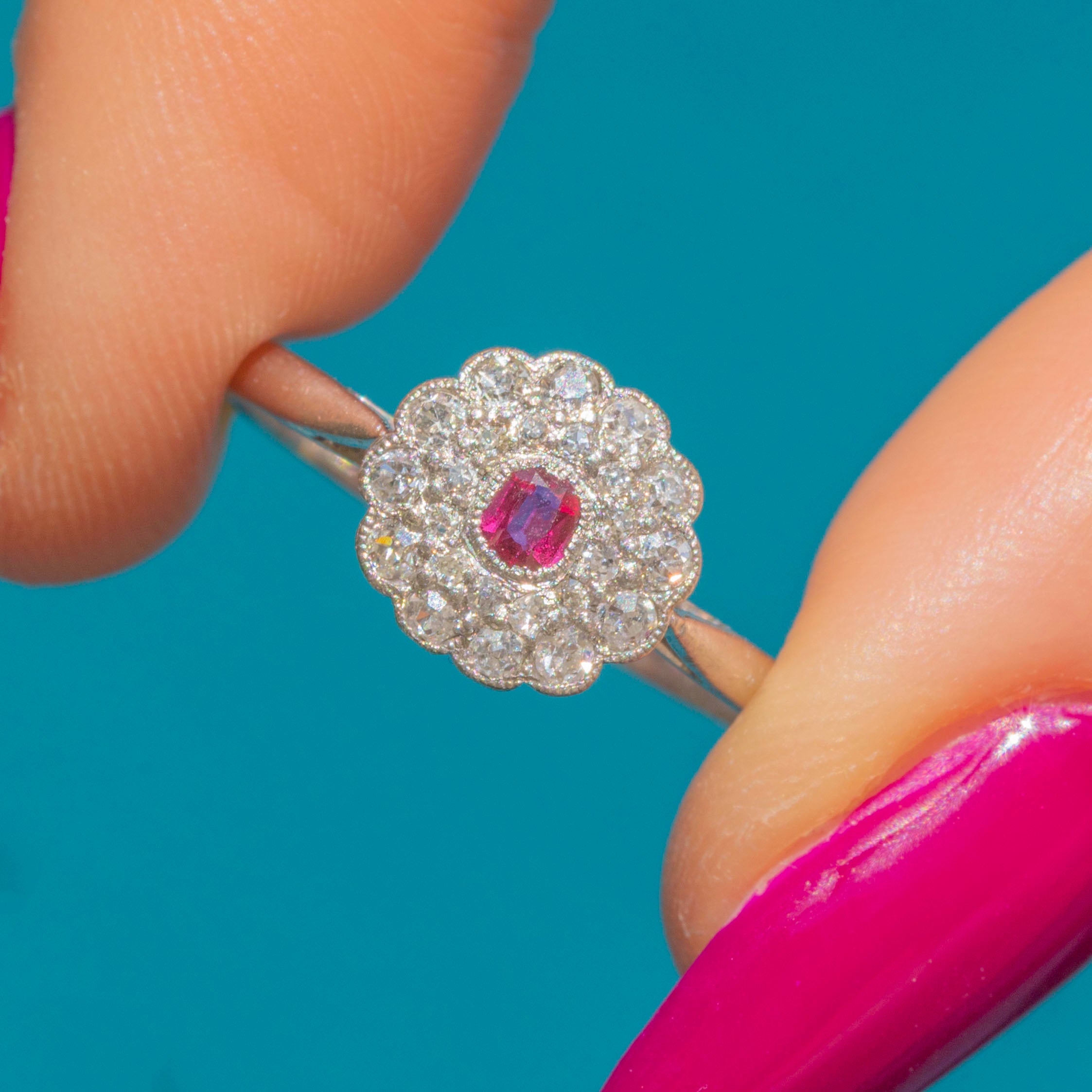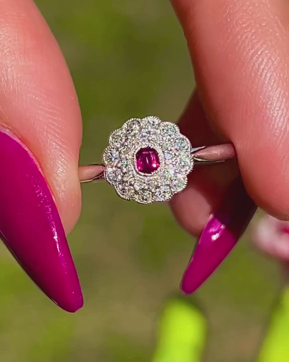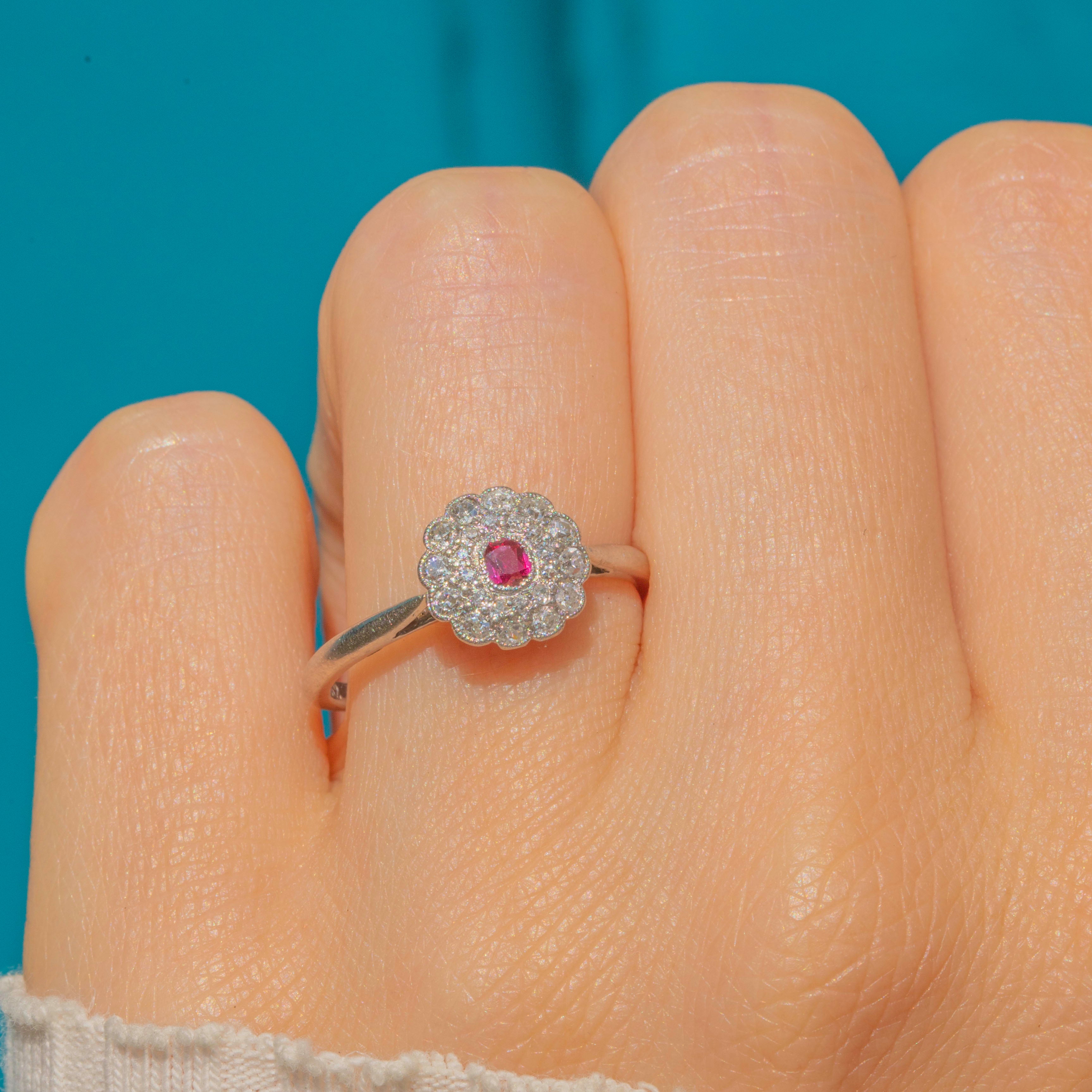 A gorgeous treasure from the Edwardian era, this solid Platinum ring displays a bright fuchsia 0.12ct Ruby haloed by 0.18cts of scintillating Diamonds, forming an elegant flower cluster.