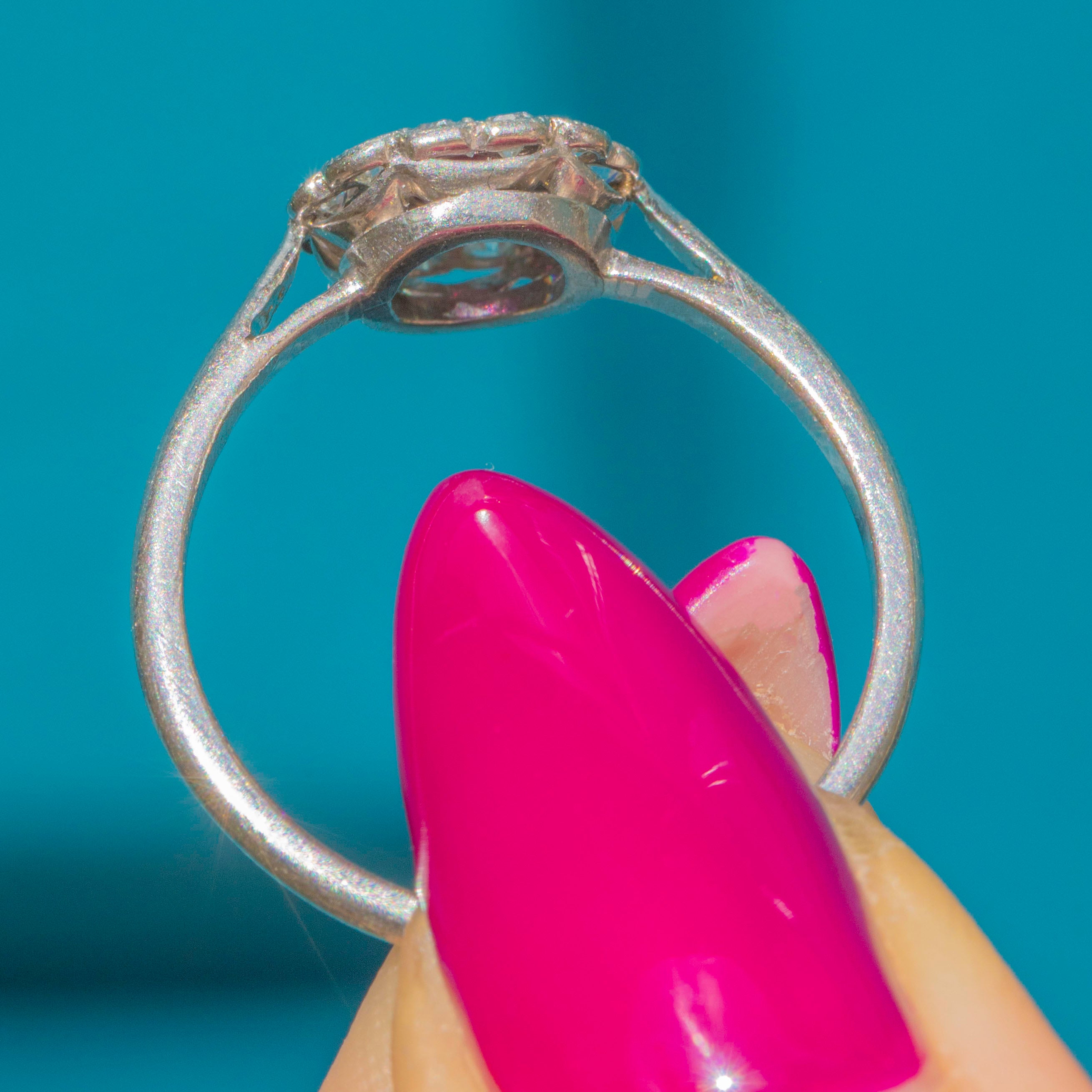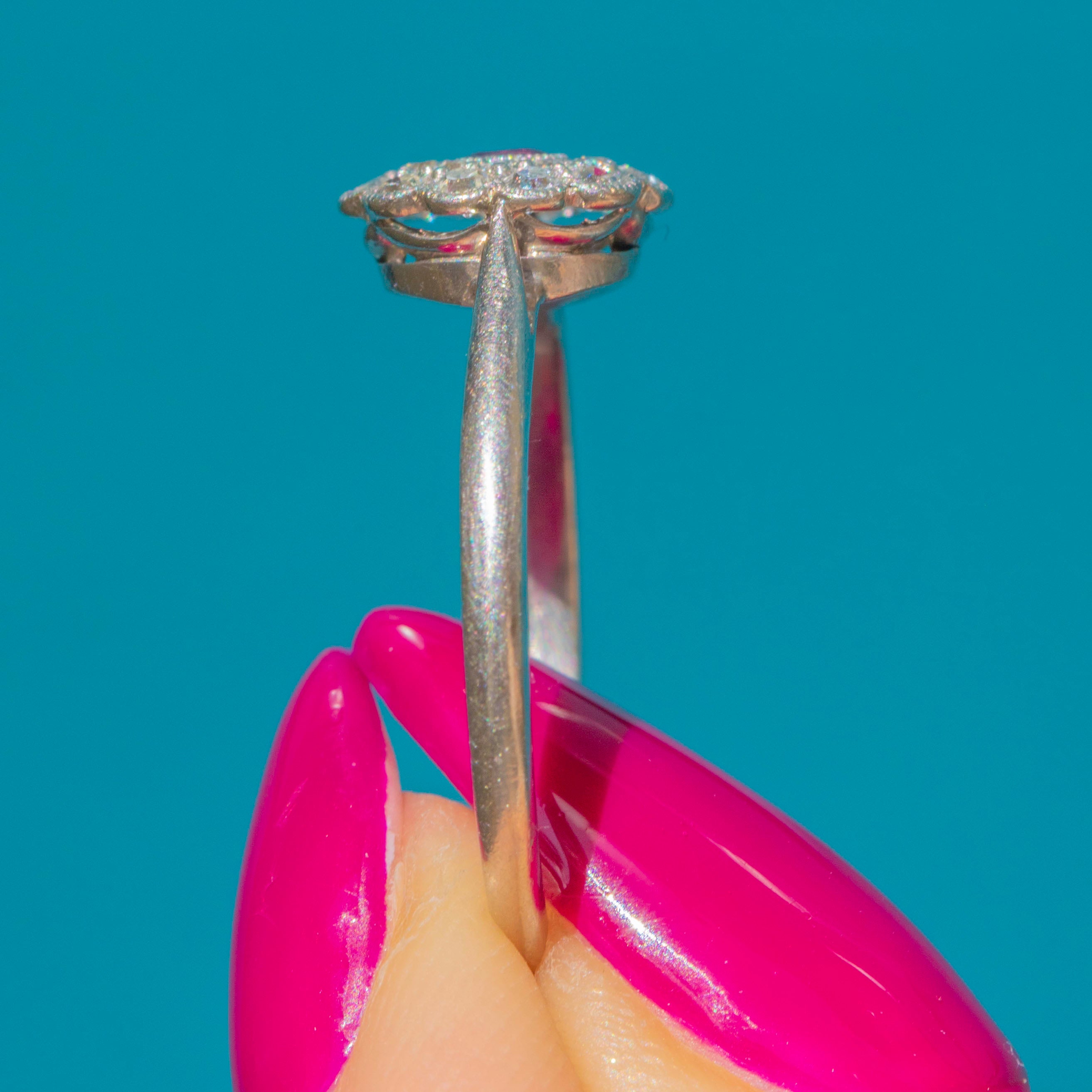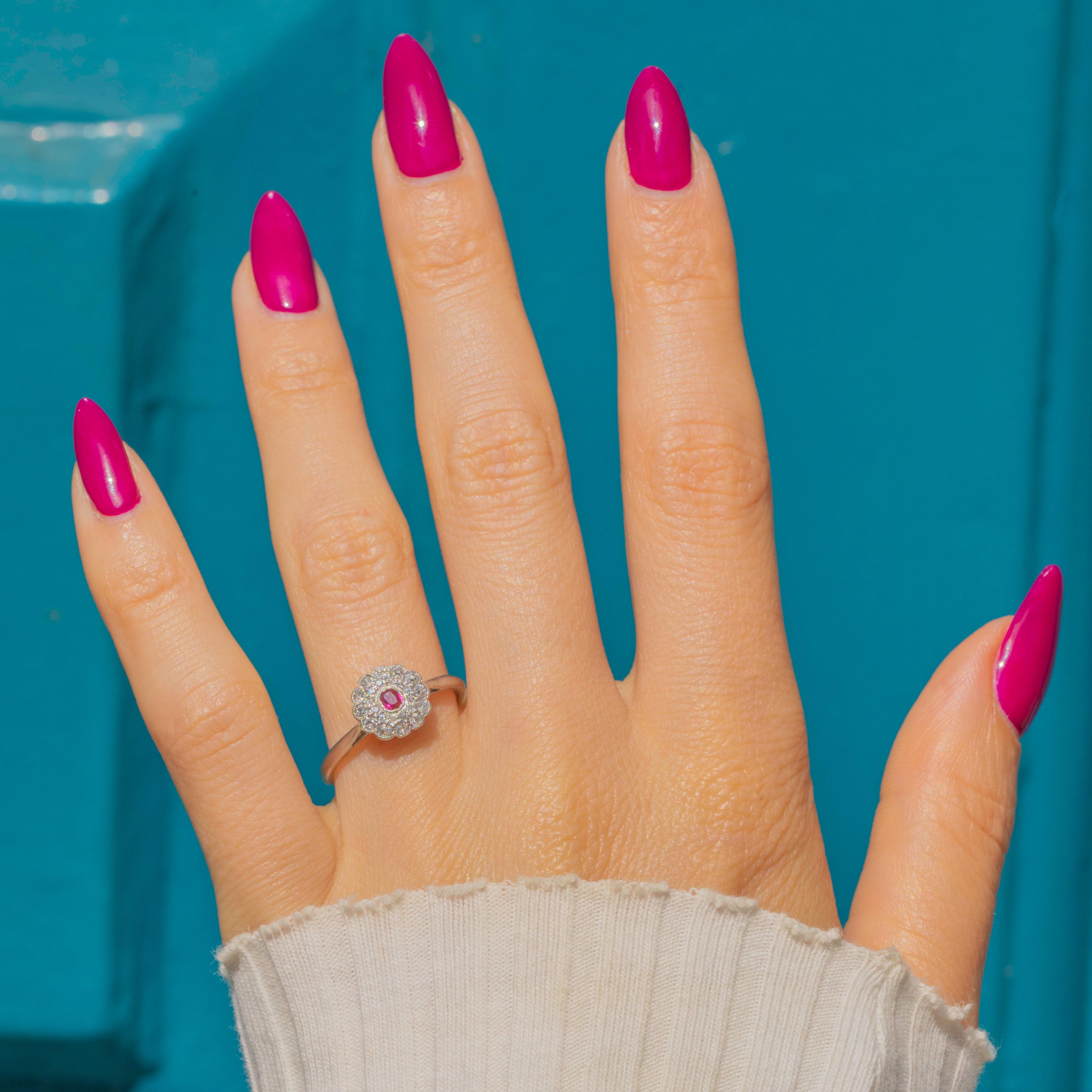 A gorgeous treasure from the Edwardian era, this solid Platinum ring displays a bright fuchsia 0.12ct Ruby haloed by 0.18cts of scintillating Diamonds, forming an elegant flower cluster.