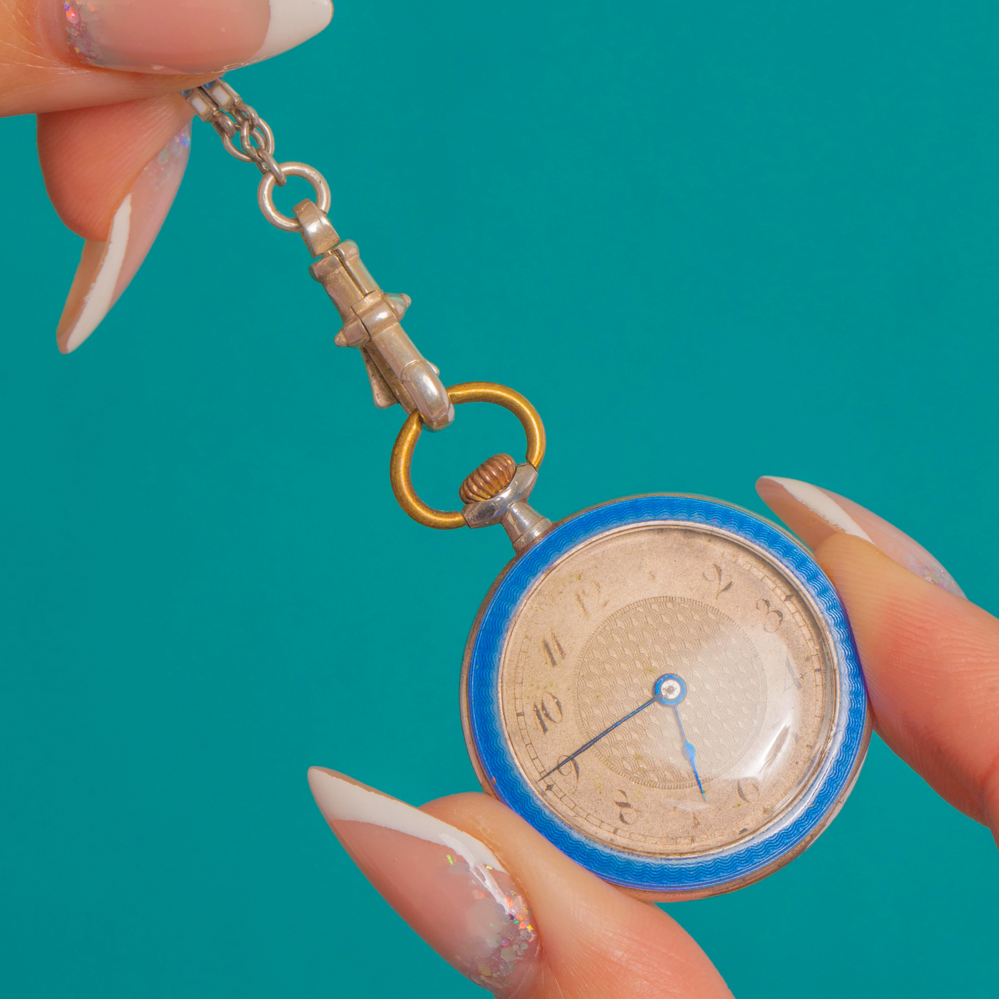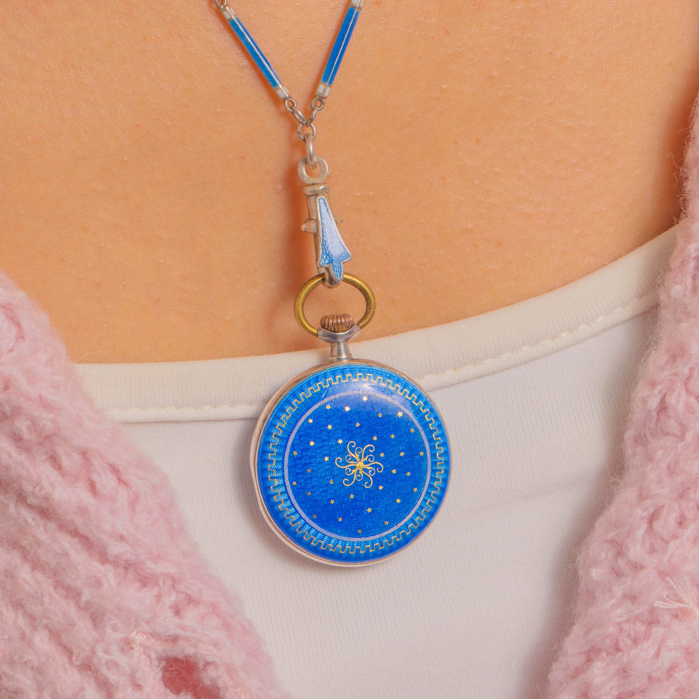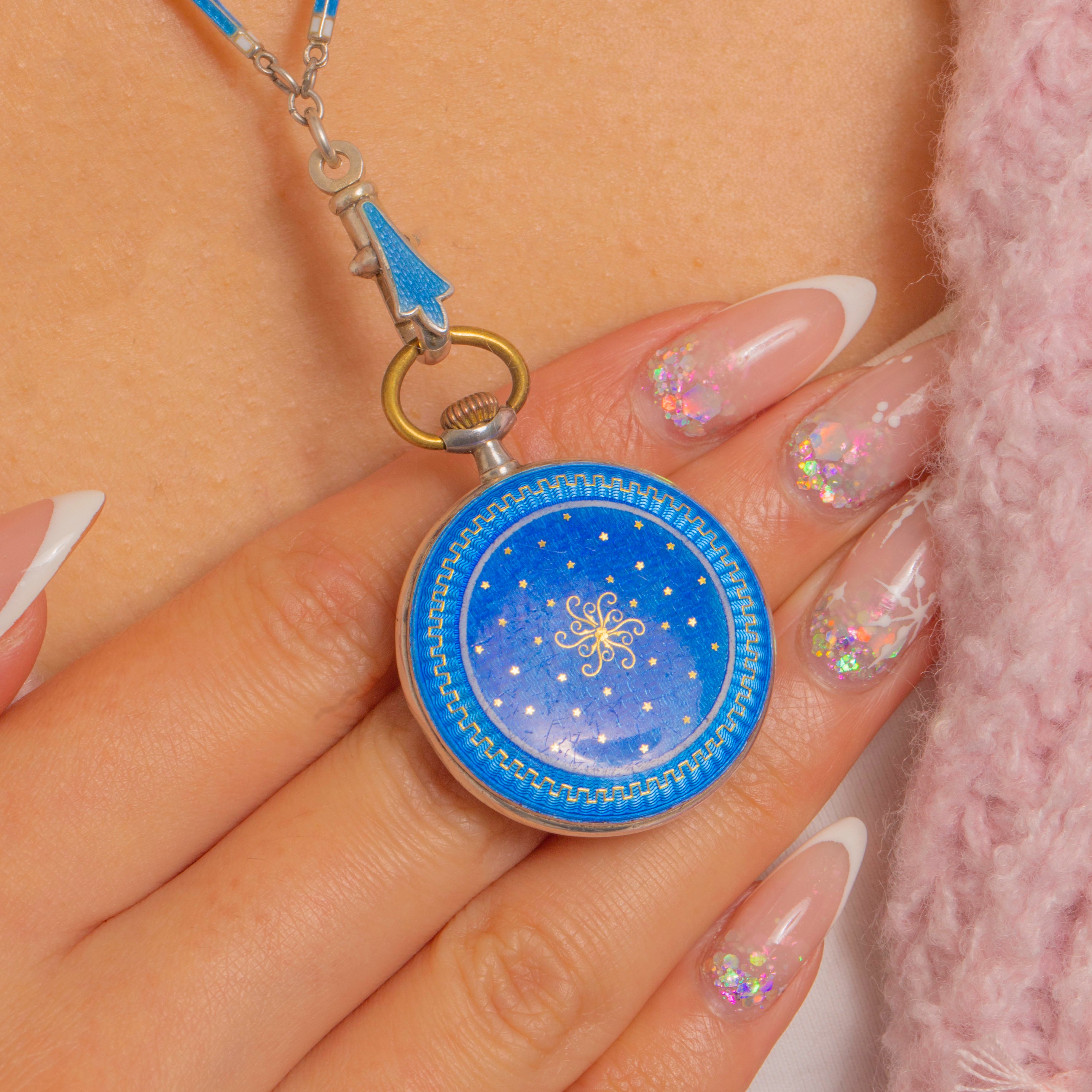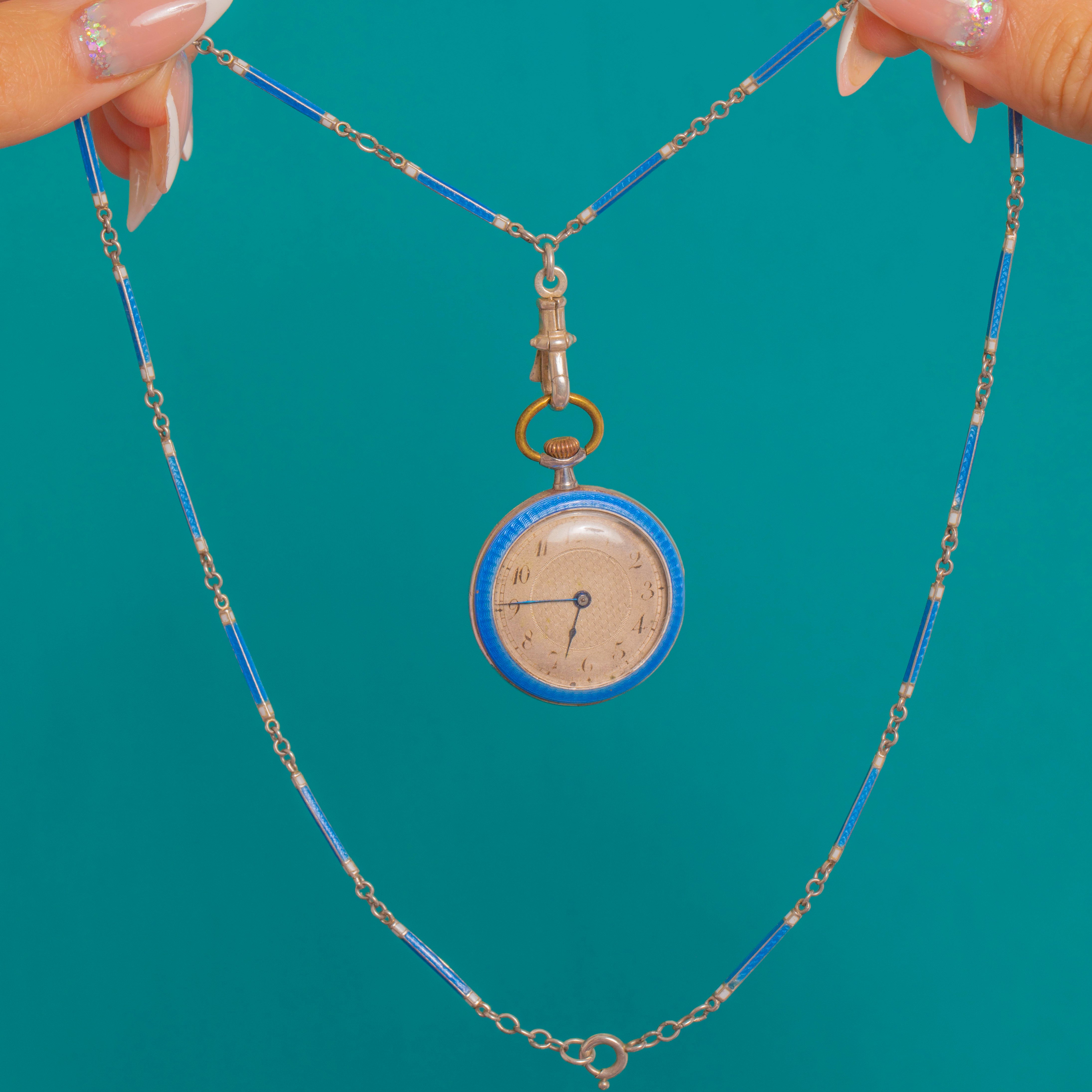 Edwardian Silver Blue Enamel Guilloche Pocket Watch with Removable Enamel Chain