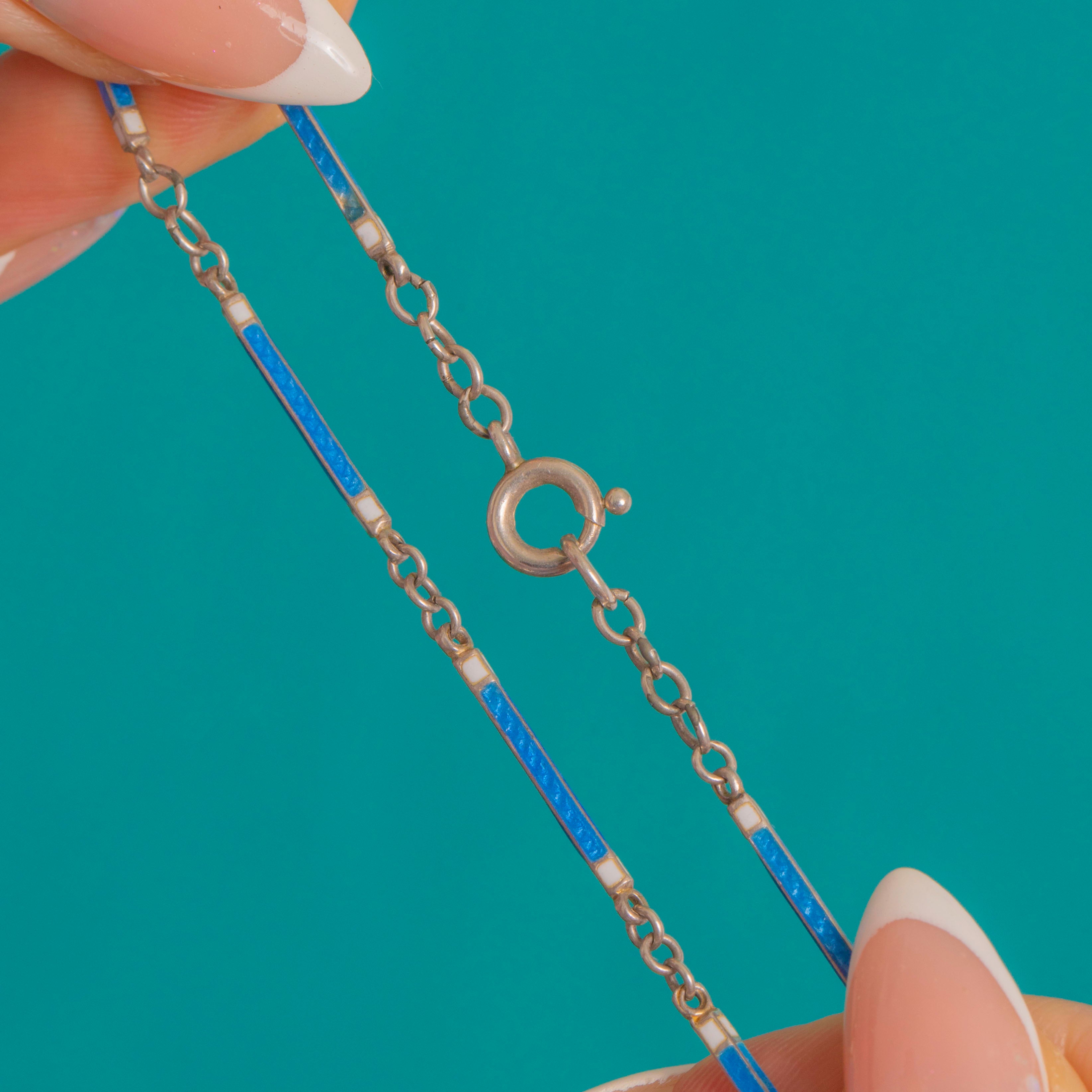 The chain alternates sleek oval links with slender blue Enamel baton links for a refined, graphic rhythm. At the front, an arrow-form, Enamelled dog-clip connects the watch and allows it to be removed so the chain can be worn alone. A beautiful meeting of Edwardian elegance with early geometric styling, in a colour that sings.