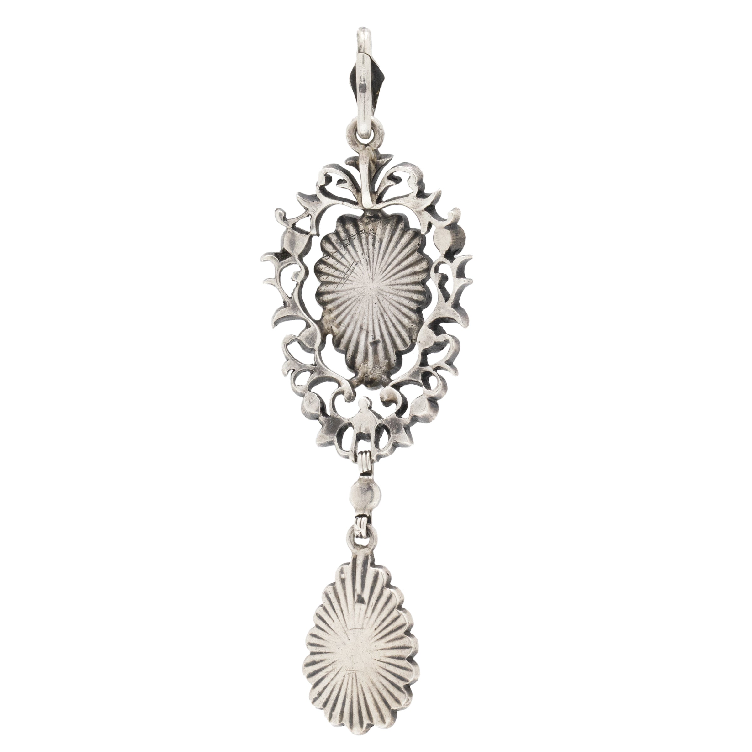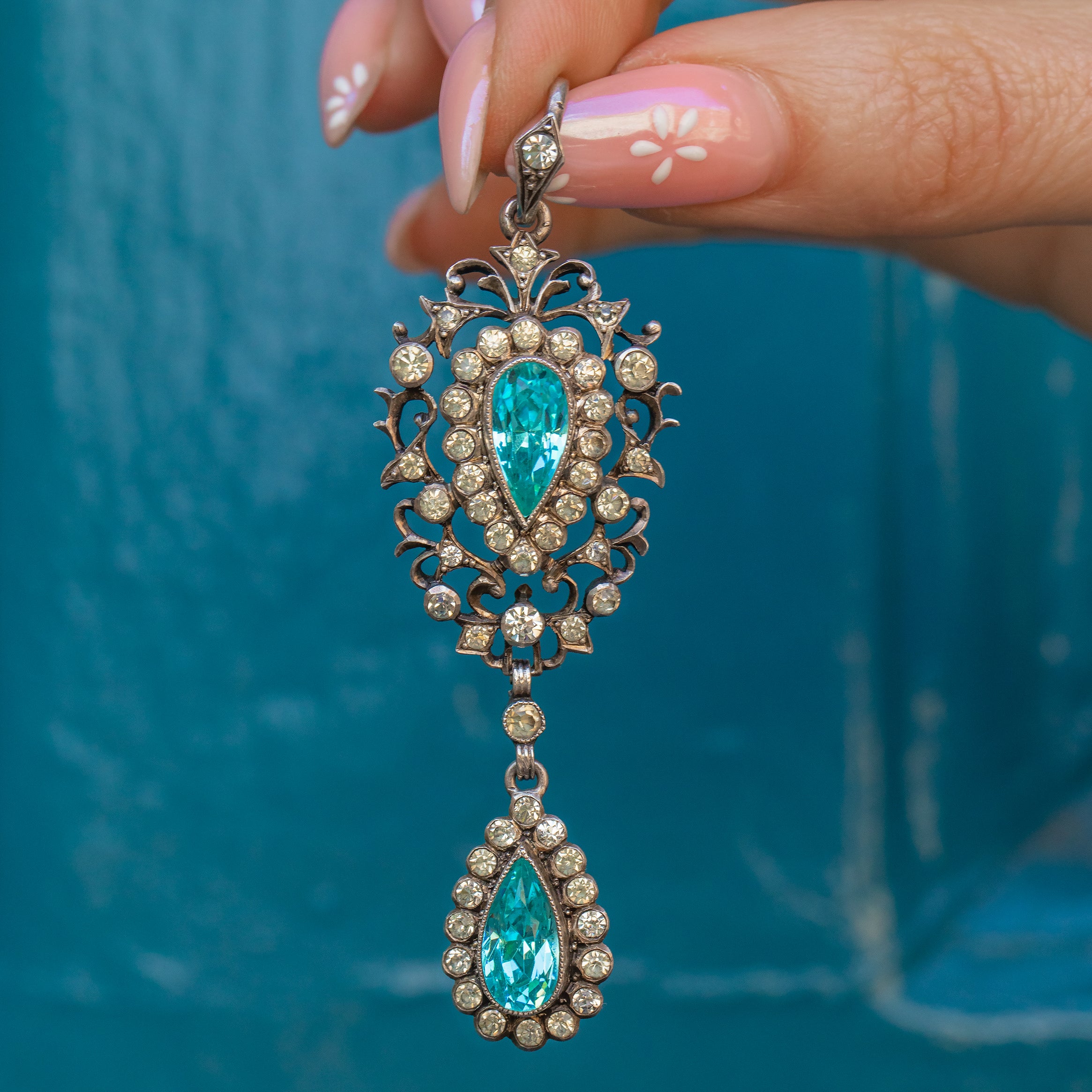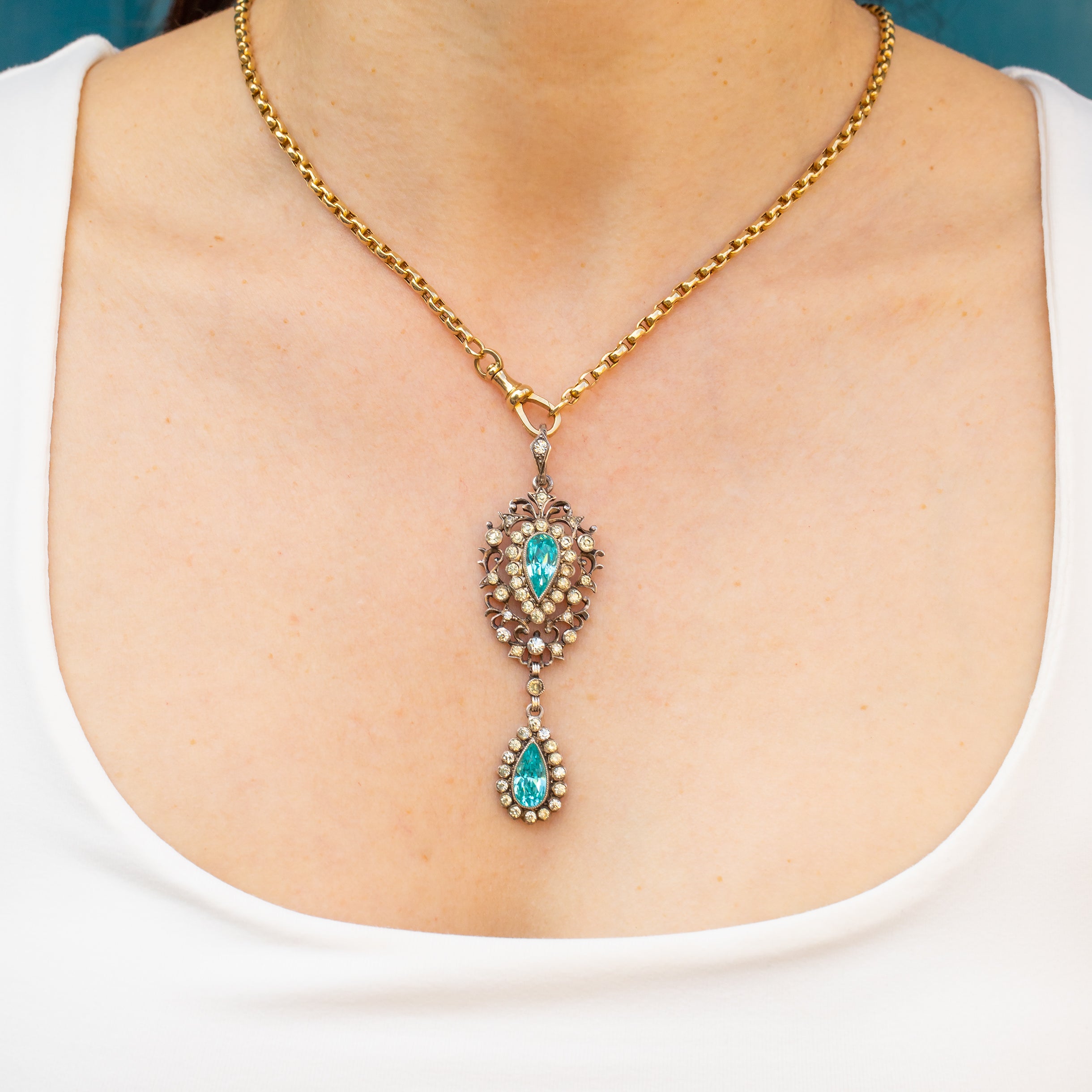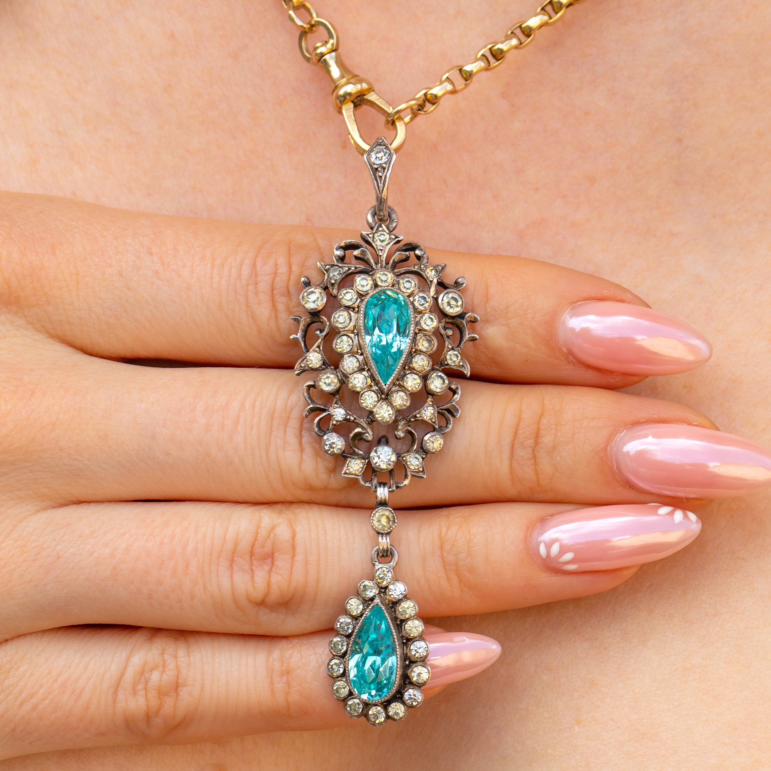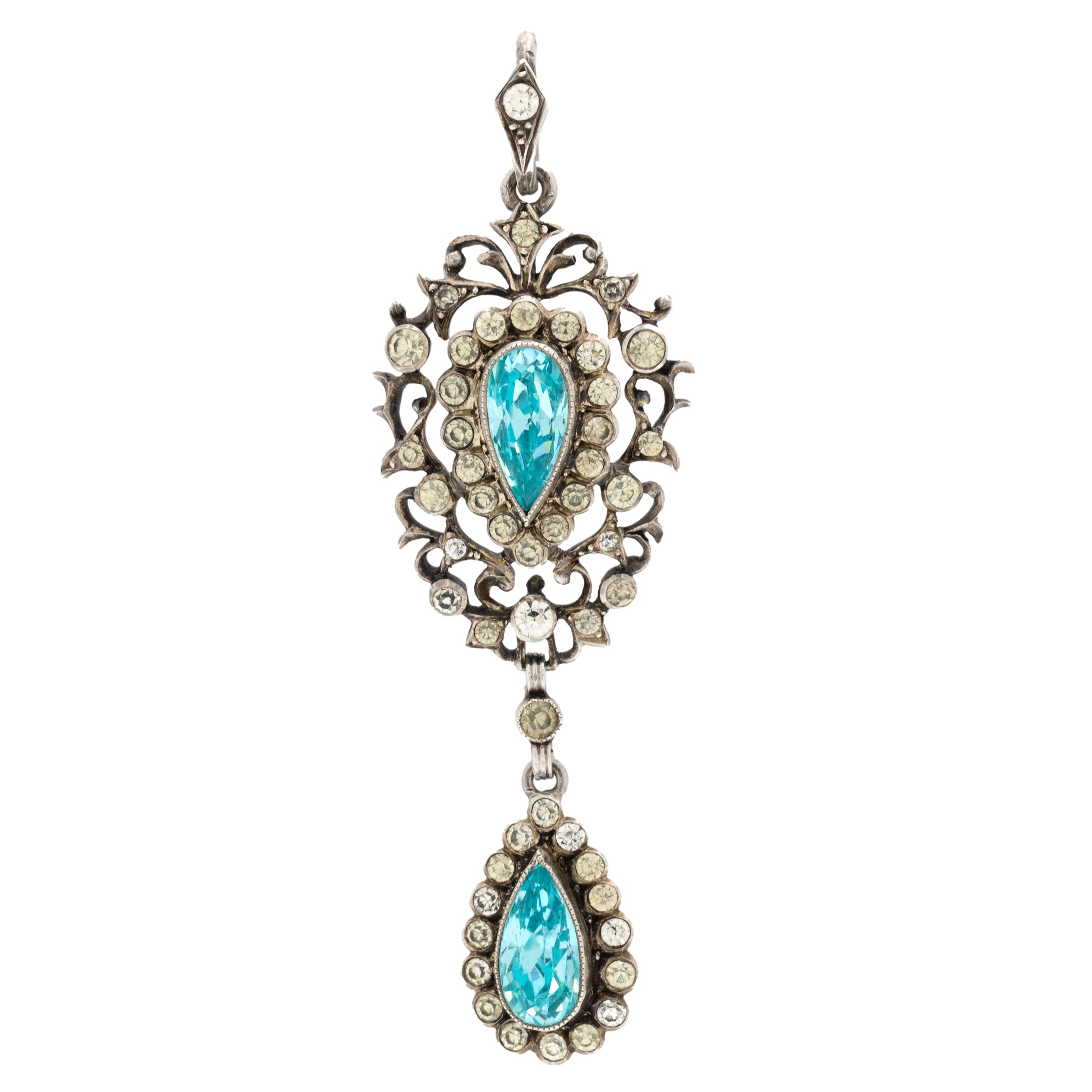 This Edwardian pendant is inlaid with a selection of crisp white Paste gemstones, alongside the most eye-catching foiled cerulean-hued Paste, giving it an alluring two-tone effect that changes colour! Wear this piece with one of your antique chains to ensure your collection stands out from the crowd.