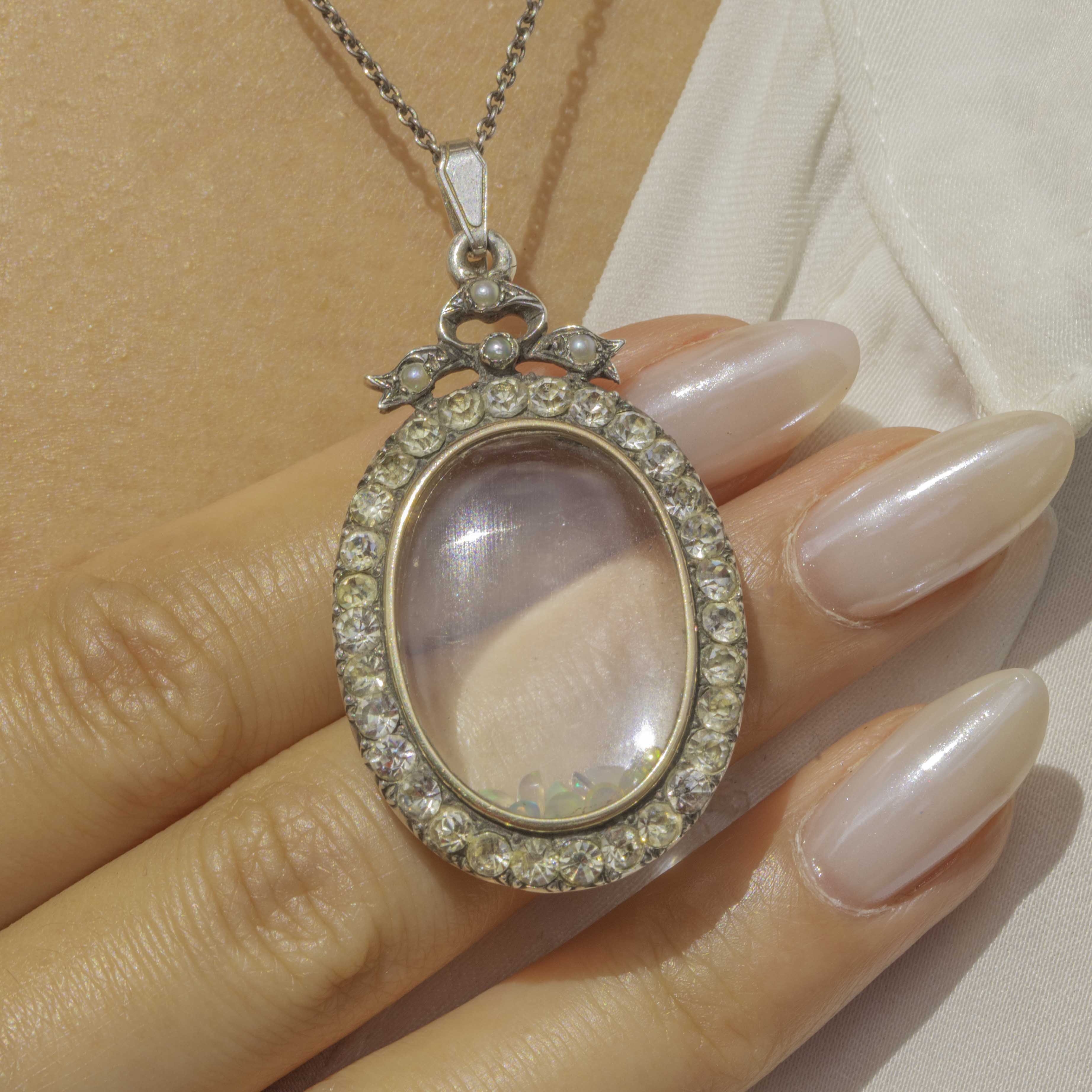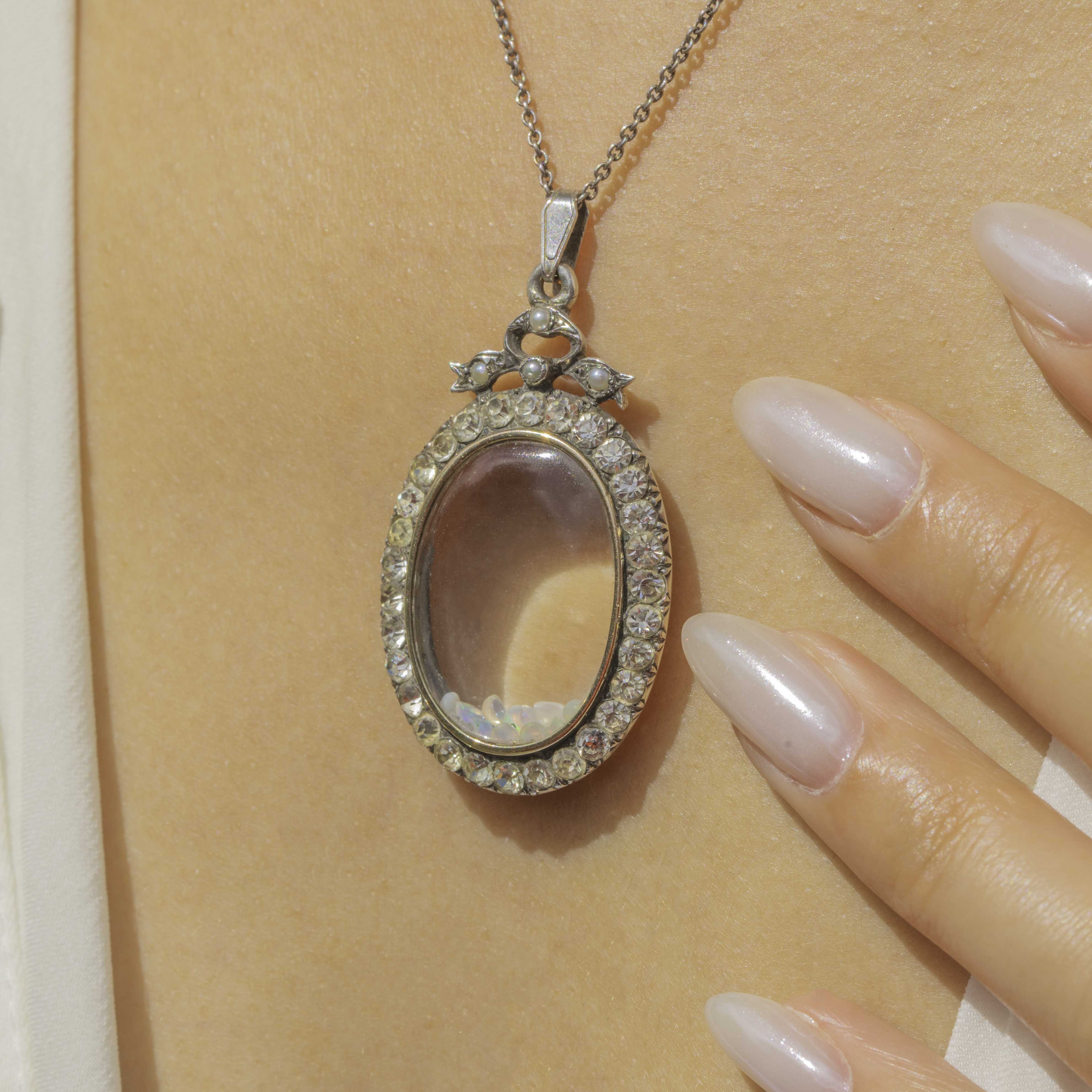 This exquisite antique Silver locket is filled with vibrant Opals, creating a gorgeous shaker. Framed by a halo of twinkling Paste stones and topped by an ornately formed bow bale studded with Seed Pearls, this shaker locket is a true stand-out piece!