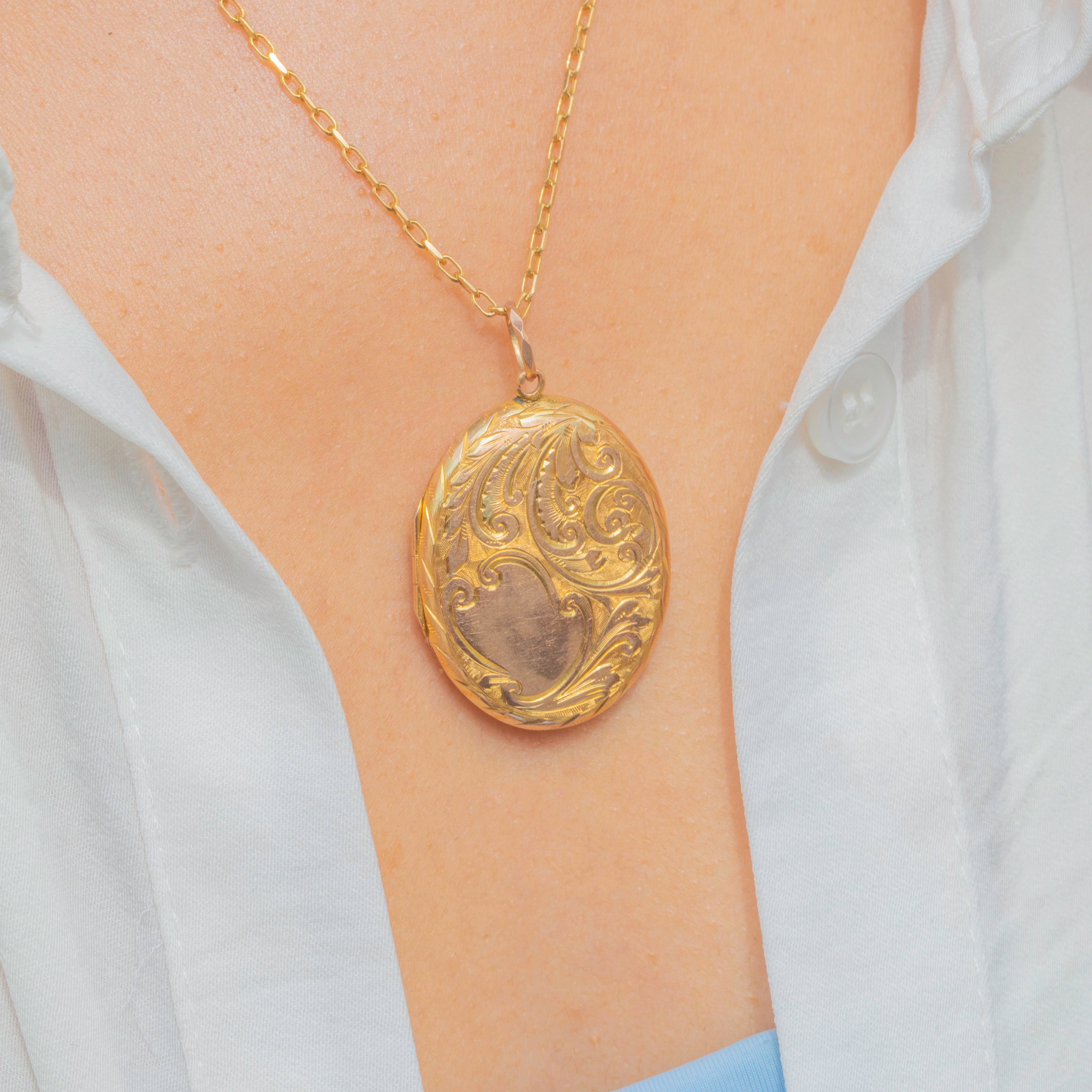 VERY GOOD-EXCELLENT: The Gold has a rich situation and the engraved details are pristine. There are no dings of scratches to the locket and both frames are intact. While the locket does not close with a click, she still closes securely keeping your photos safe for years to come.
