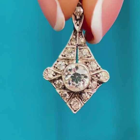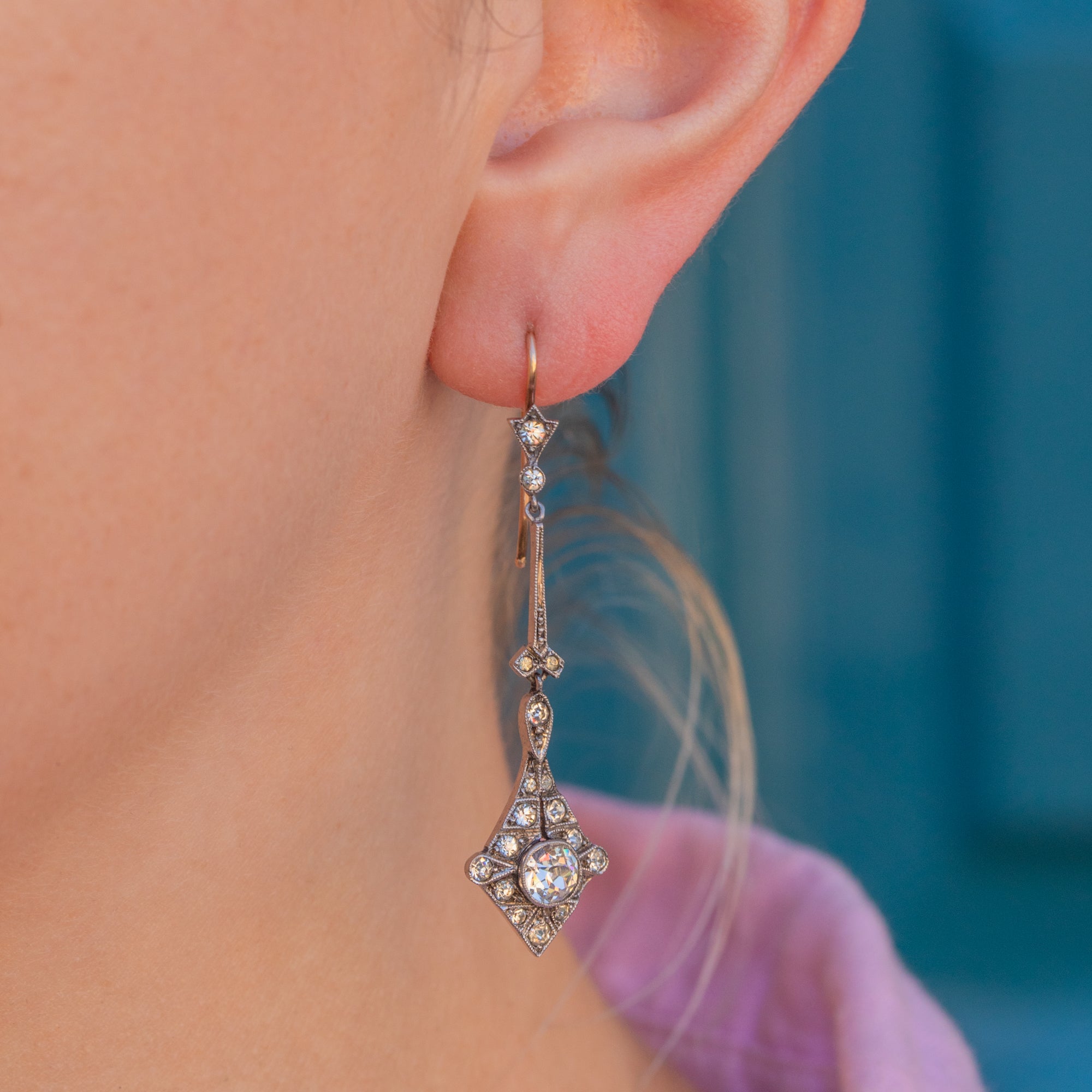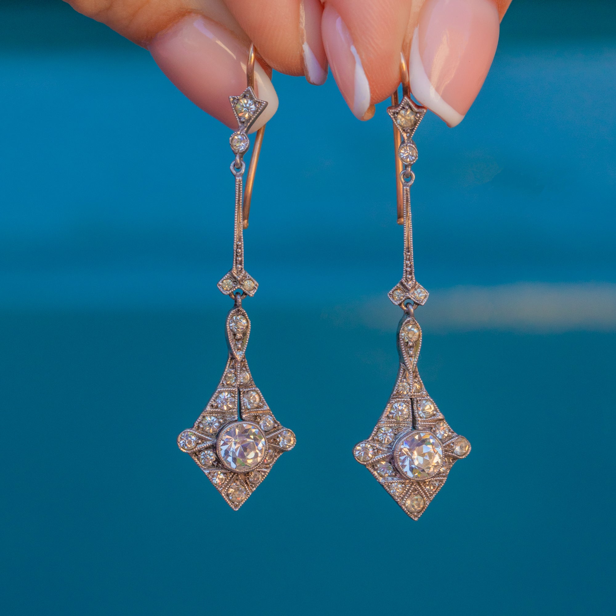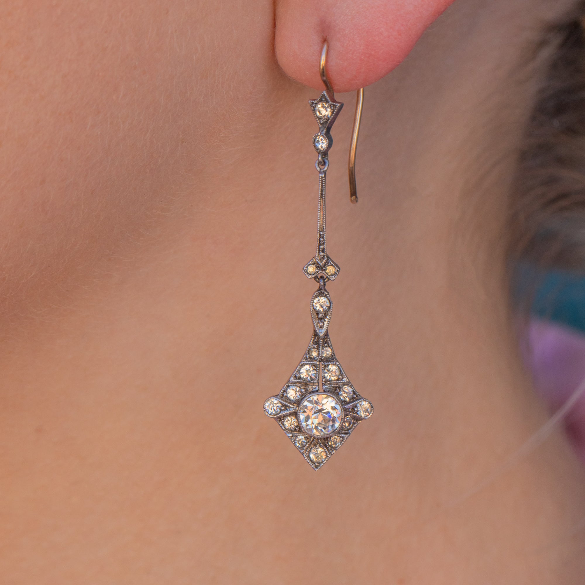 Akin to chandeliers falling beside your cheeks, these Art Deco Paste drop earrings exude elegance and sophistication. The epitome of Art Deco, their geometric Diamond drops are inlaid with a generous sprinkling of glistening Paste that would pair perfectly with any black evening dress.
