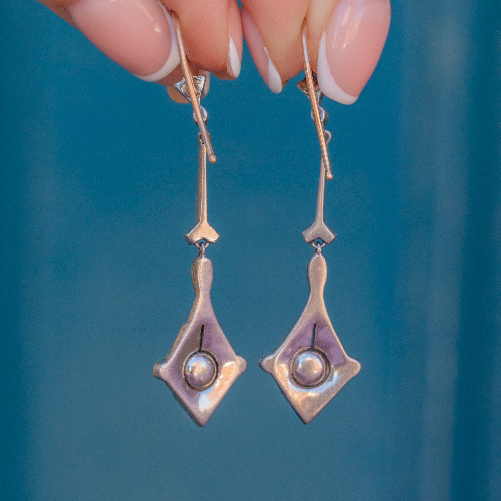 Secured into your lobes with 9ct Gold hooks, these Art Deco earrings having a wonderful fluidity, following your every swish and sway. Born to provide character and antique charm, these Silver Paste earrings will be bringing you attention wherever you wear them.