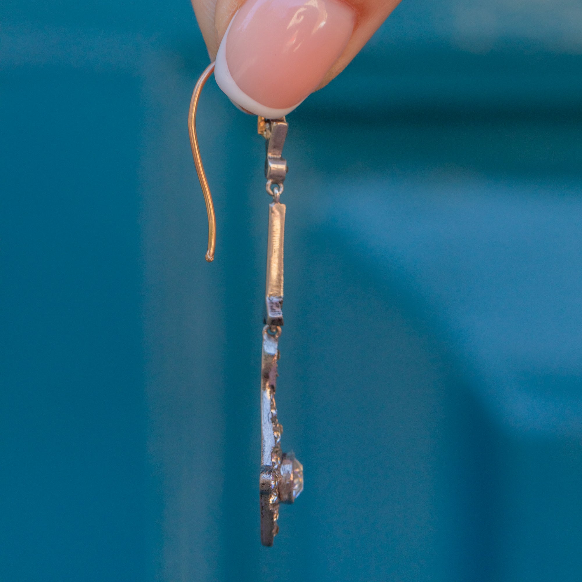 MATERIALS: Tests as Sterling Silver drops, 9ct Gold hooks, Paste.