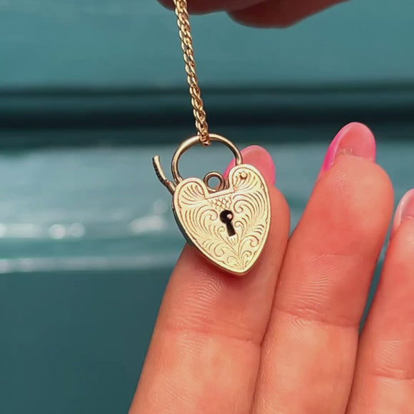EXCELLENT. This engraved 9ct Gold heart padlock pendant is in excellent condition! Aside from a few very light surface marks on the back, the engravings are crisp, the Gold is buttery and her hinge clicks perfectly into place!