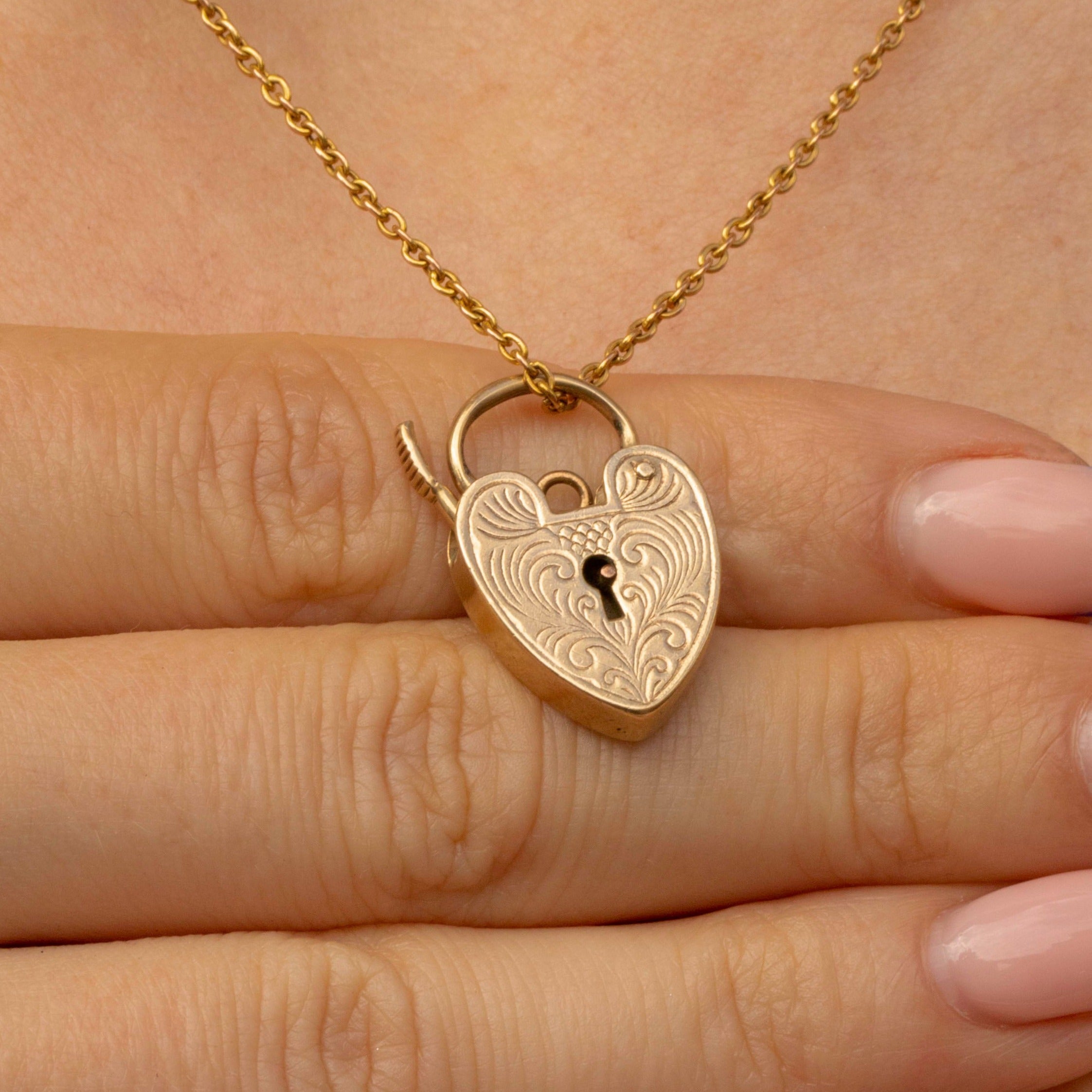 Inlaid with symmetrical, ornate engravings perfectly following the form of this curvaceous heart, nothing says love like this engraved 9ct Gold heart padlock pendant!