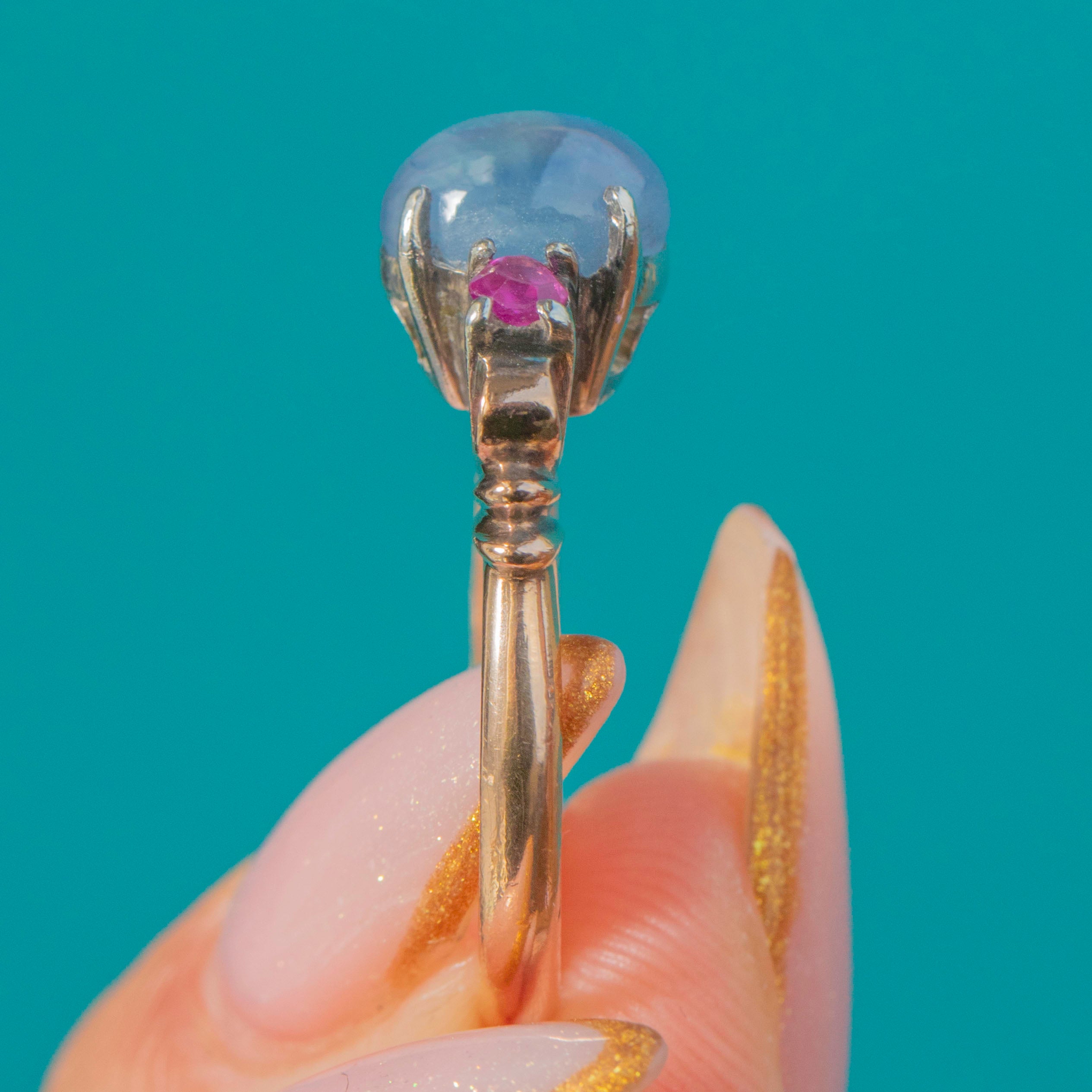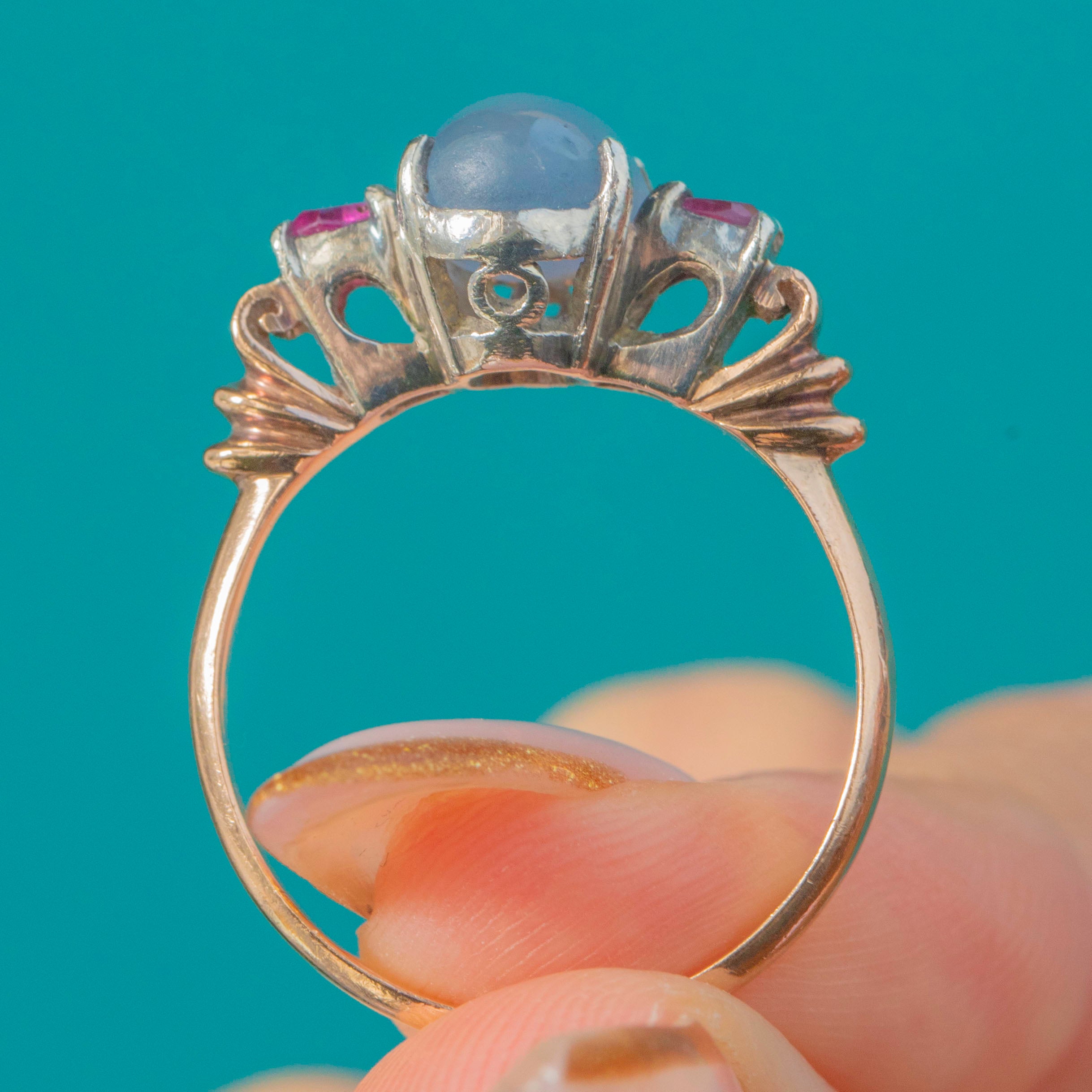 This European Art Deco ring, crafted c.1940, centres on a beautiful Star Sapphire cabochon displaying subtle asterism beneath its domed surface. The cool blue tone is complemented by vibrant Rubies set in Silver, creating a striking contrast characteristic of late Art Deco design.