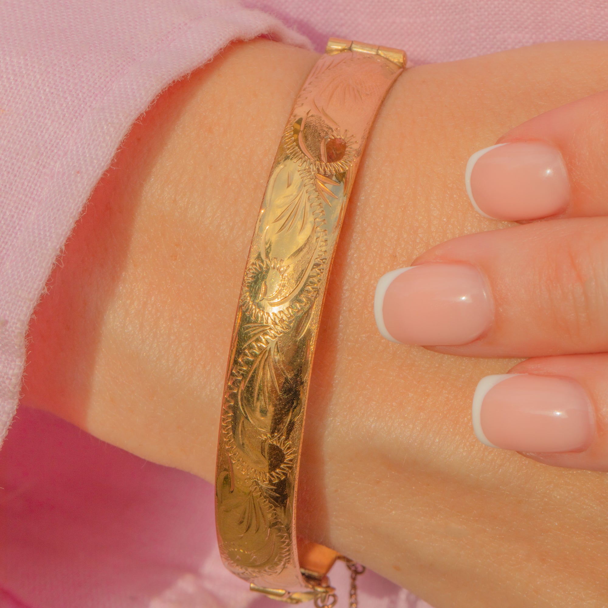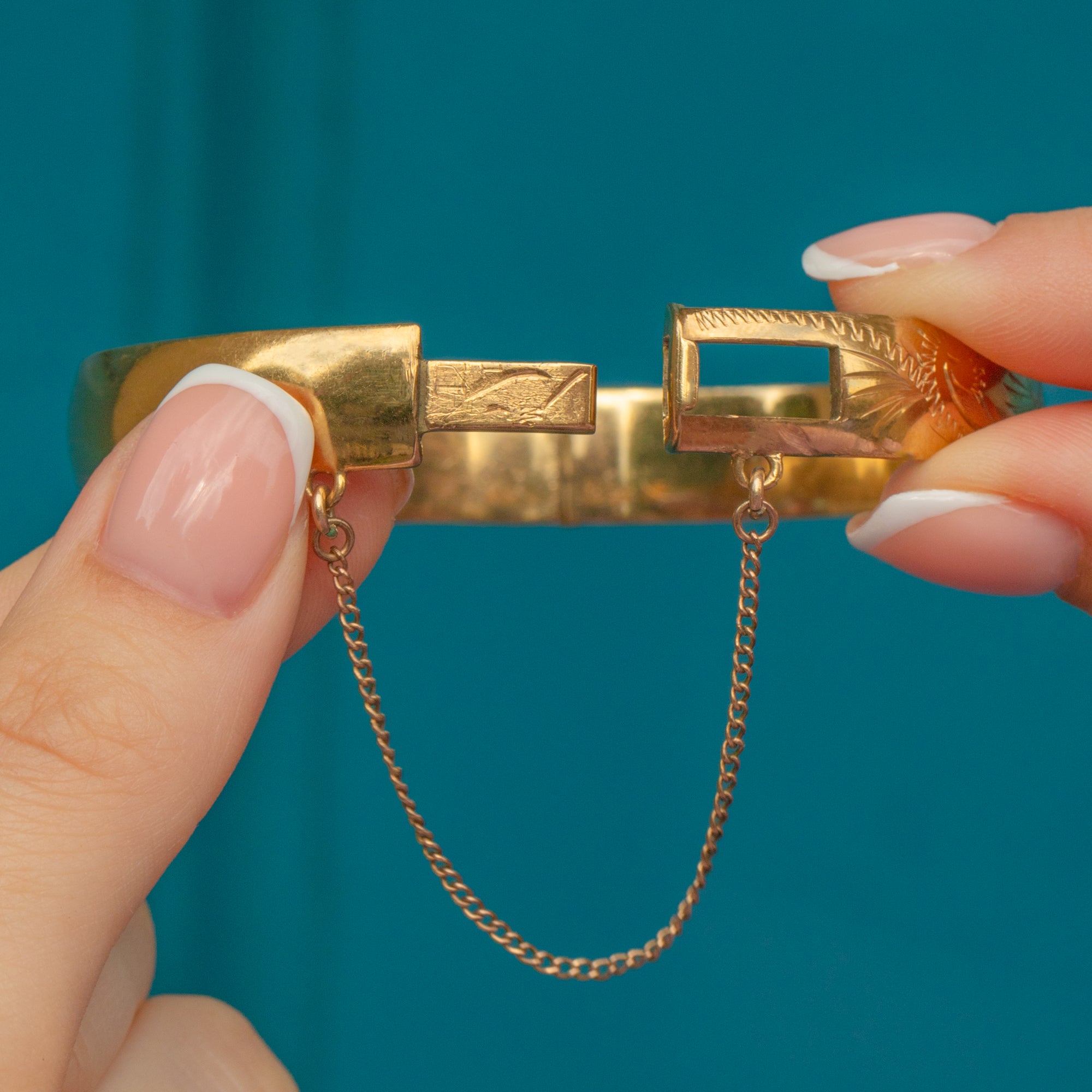VERY GOOD-EXCELLENT. This Excalibur 9ct rolled Gold engraved bangle is in wonderful condition. There are some surface marks on the tongue from her use over time, but this doesn't affect her functionality. This Gold bangle has a beautifully engraved front, a safety chain for secure wear, and a fully functioning clasp that allows you to wear it with confidence.