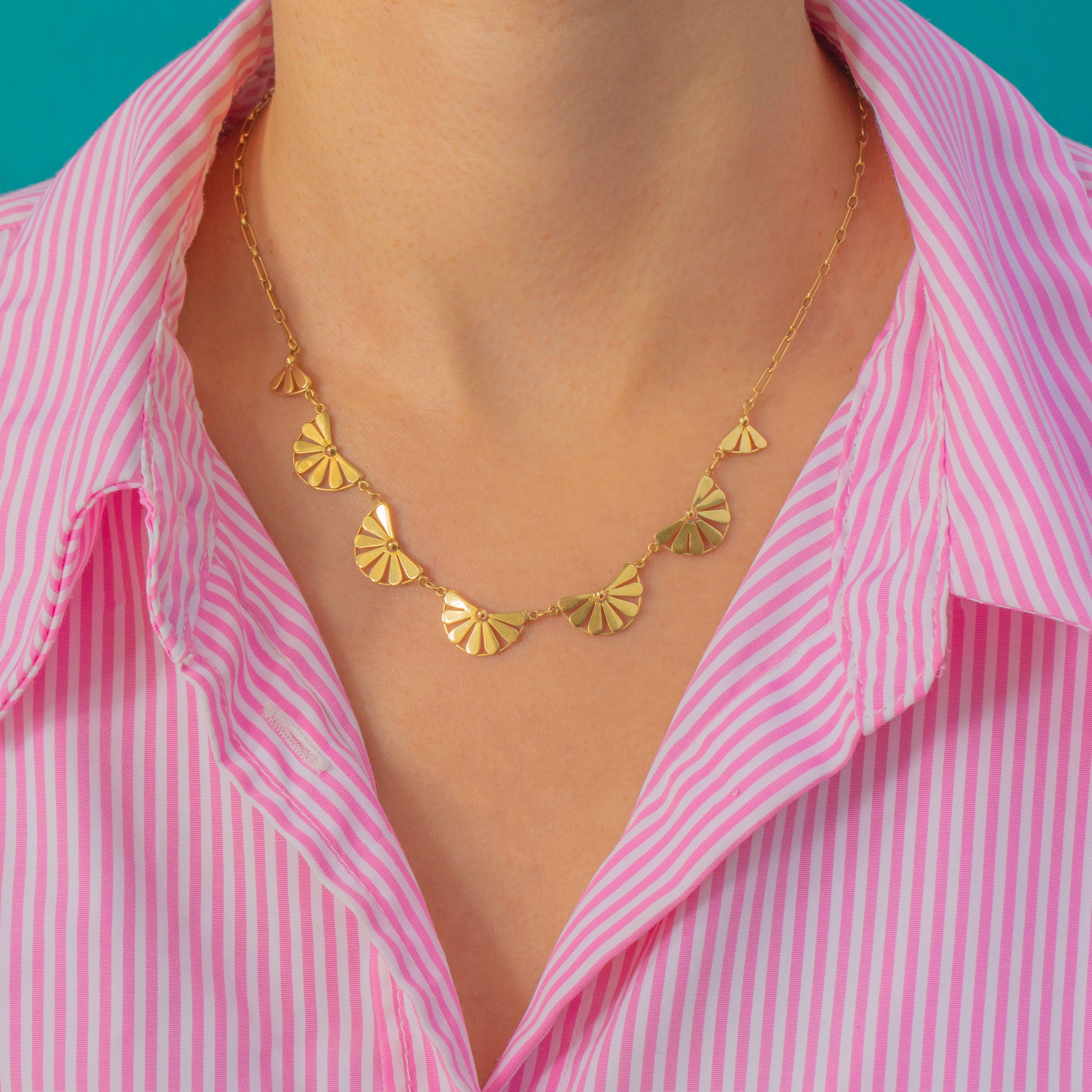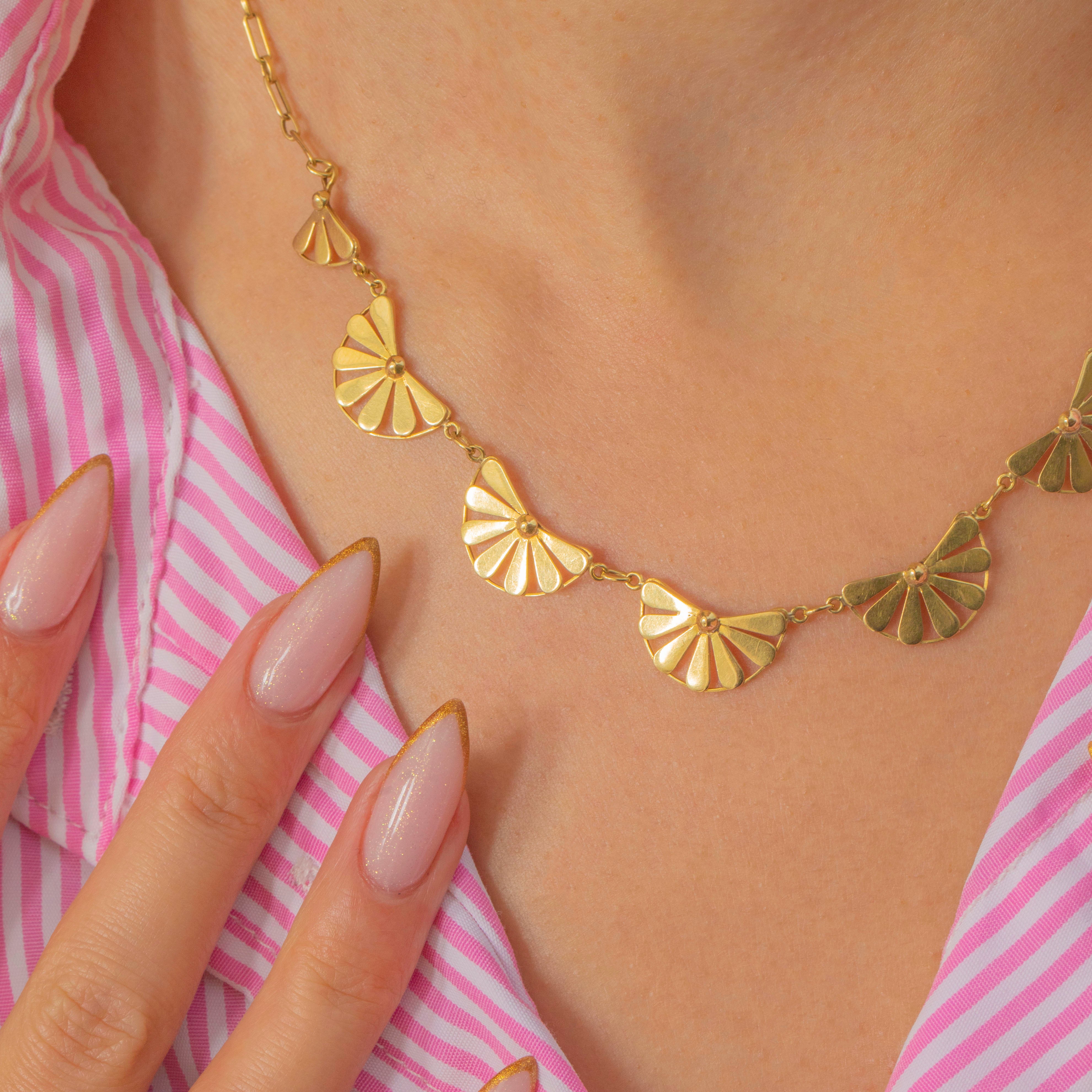 The design features a softly sculpted daisy motif at the centre, tapering to elegant miniature trombone links that lie flat and comfortably along the neckline. Radiating the joyful femininity of the Jazz Age, this piece combines craftsmanship and style in perfect measure, a rare and charming treasure from the height of French Art Deco design.
