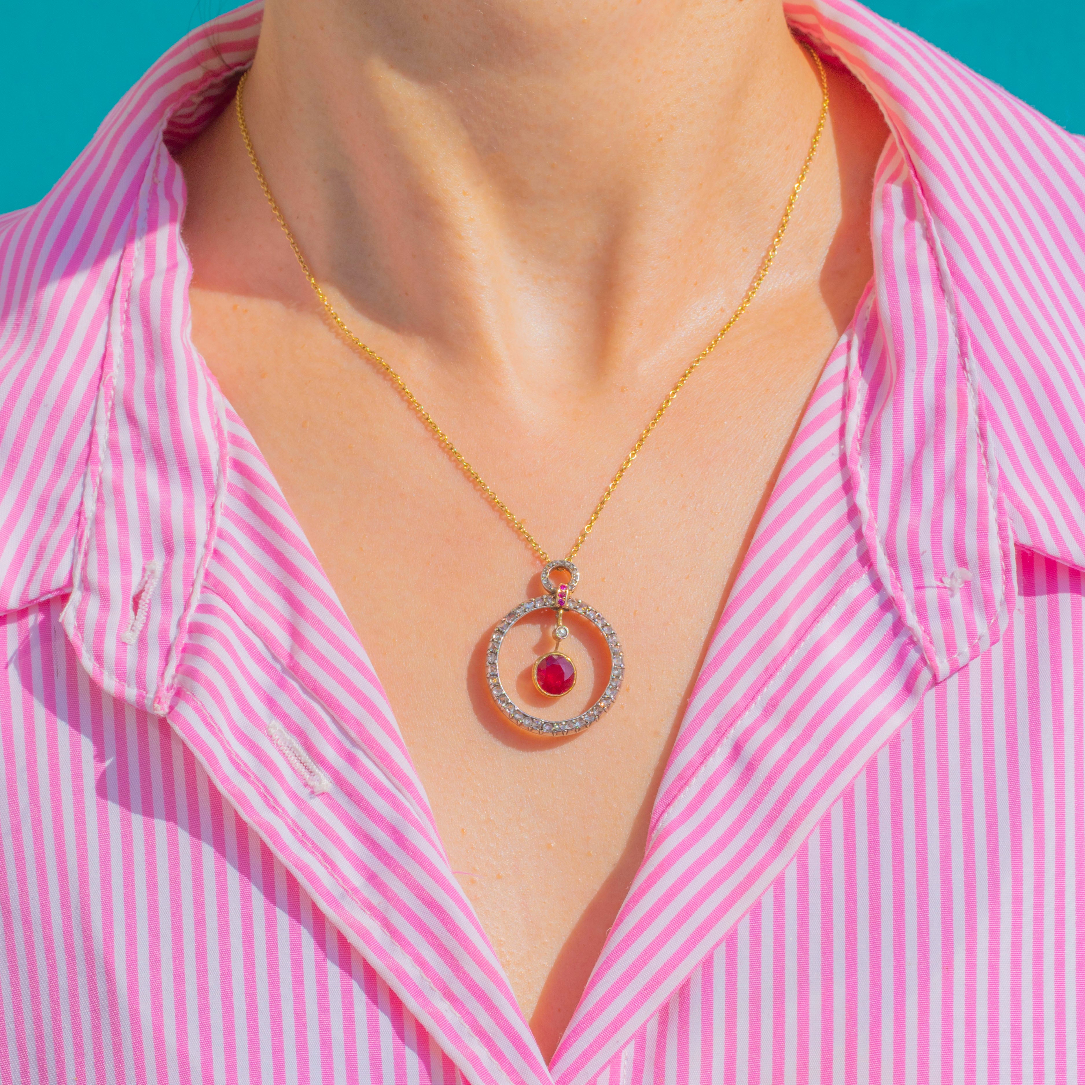The central Ruby’s rich crimson glow is beautifully complemented by the Diamond-set open hoop, creating a refined play of colour and sparkle. Subtle movement from the articulated elements brings the gems to life on the neckline, making this an exquisite choice for special occasions and everyday indulgence alike. The accompanying chain bears the French Eagle Head stamp for 18ct, a chic finishing touch to a truly timeless pendant.