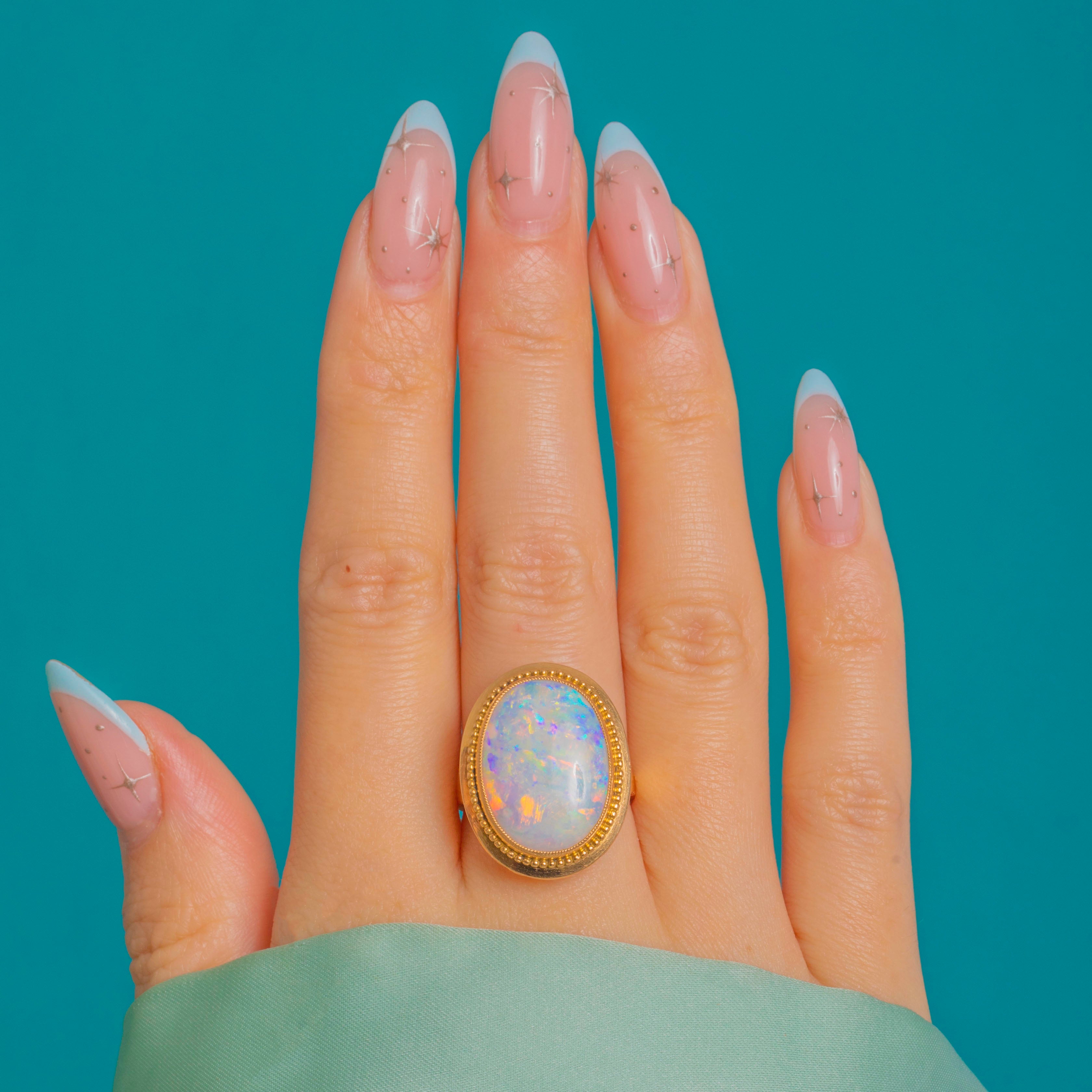 A luminous celebration of colour and craft, this French 18ct Gold cocktail ring showcases a captivating Solid Opal of approximately 4.50ct. The oval cabochon shimmers with vivid play-of-colour—flashes of blue, green, orange, and lilac dance across the gemstone, creating a mesmerising, ever-changing display.