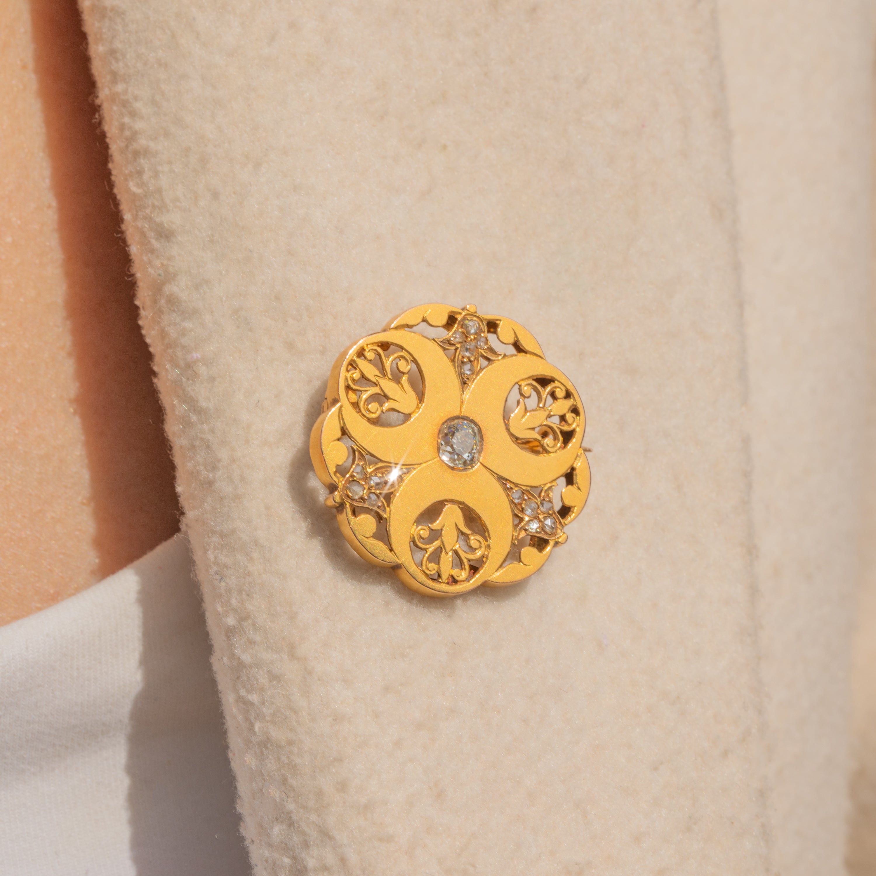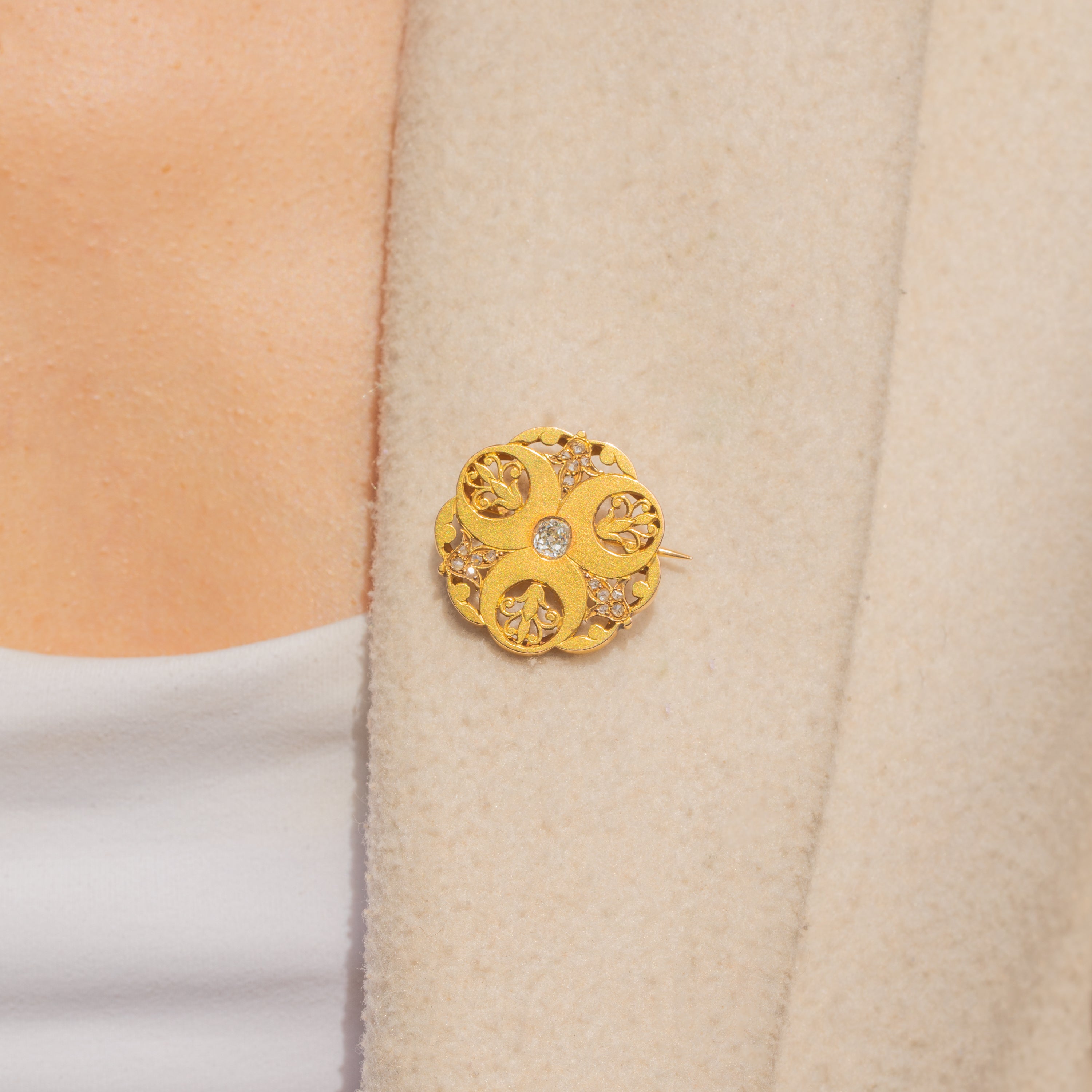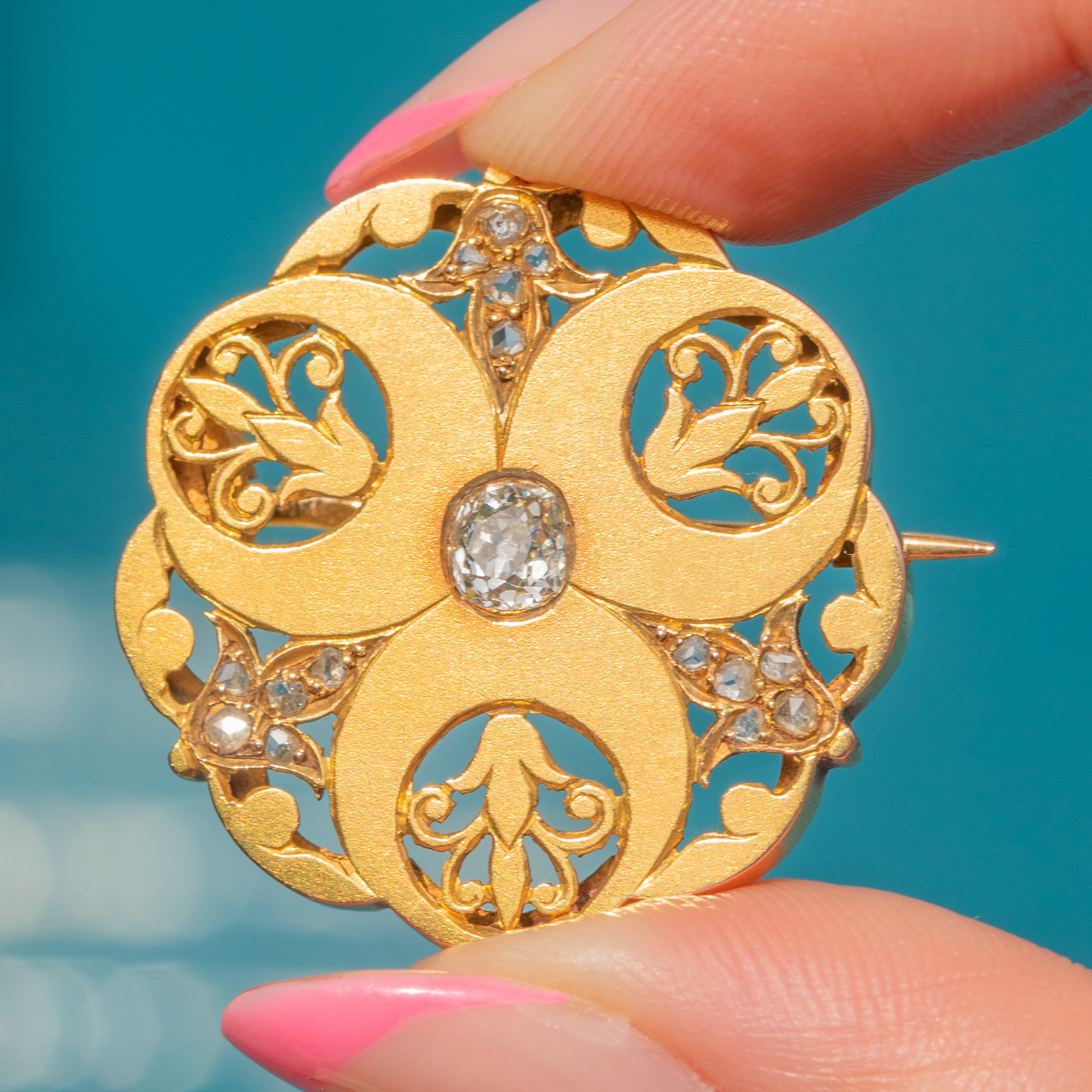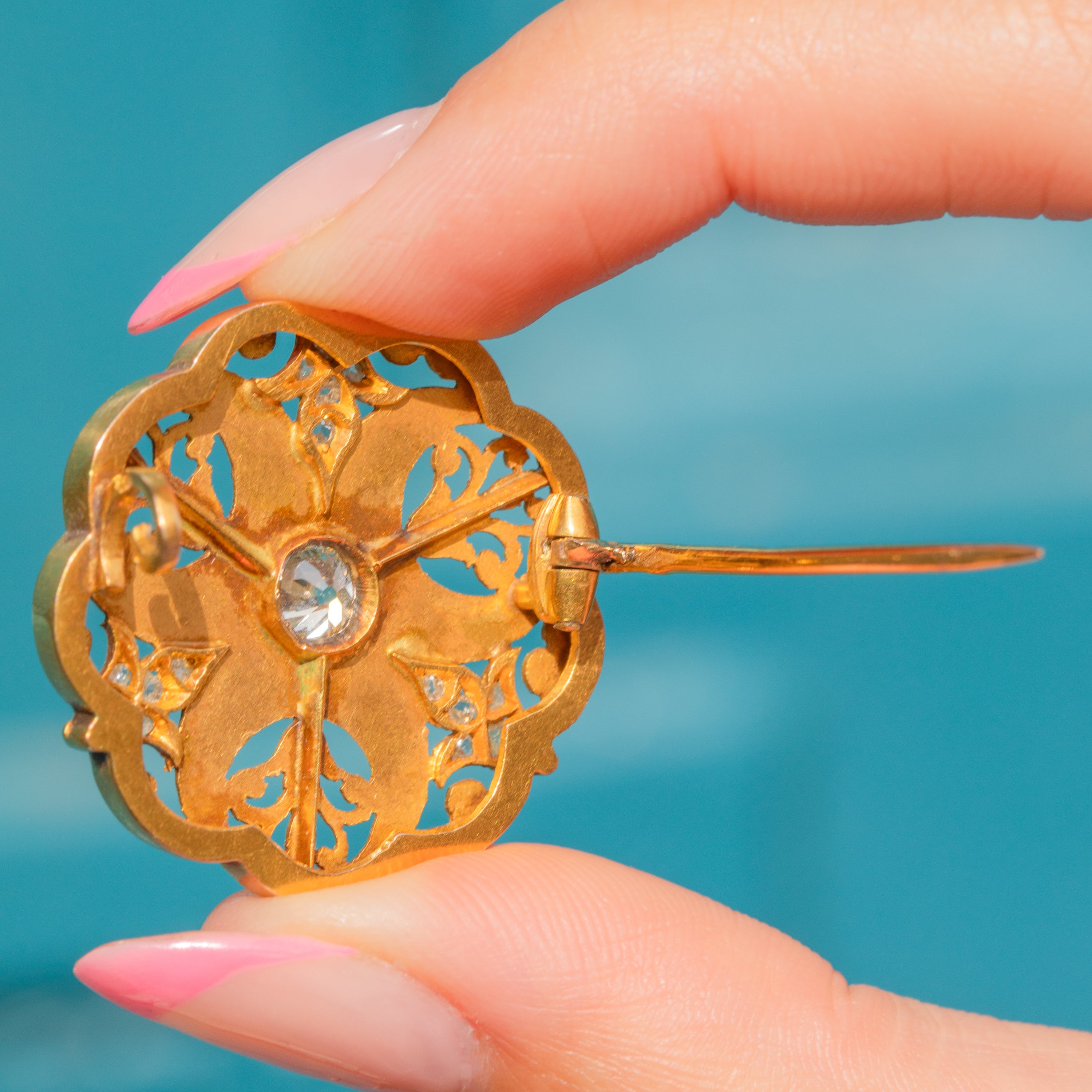 VERY GOOD-EXCELLENT: This French Art Nouveau 18ct Gold old-mine-cut Diamond openwork brooch is in superb condition. The Gold is radiant with a lovely satin finish, and the details are defined with no signs of wear. The Diamonds are all present and securely set, and the central old-mine-cut Diamond is nice and bright. The Gold shows some minor areas of discolouration on the back of the brooch, though this won't be visible while the brooch is worn. The pin is robust and sturdy, allowing you to wear this French antique Diamond brooch with absolute confidence!