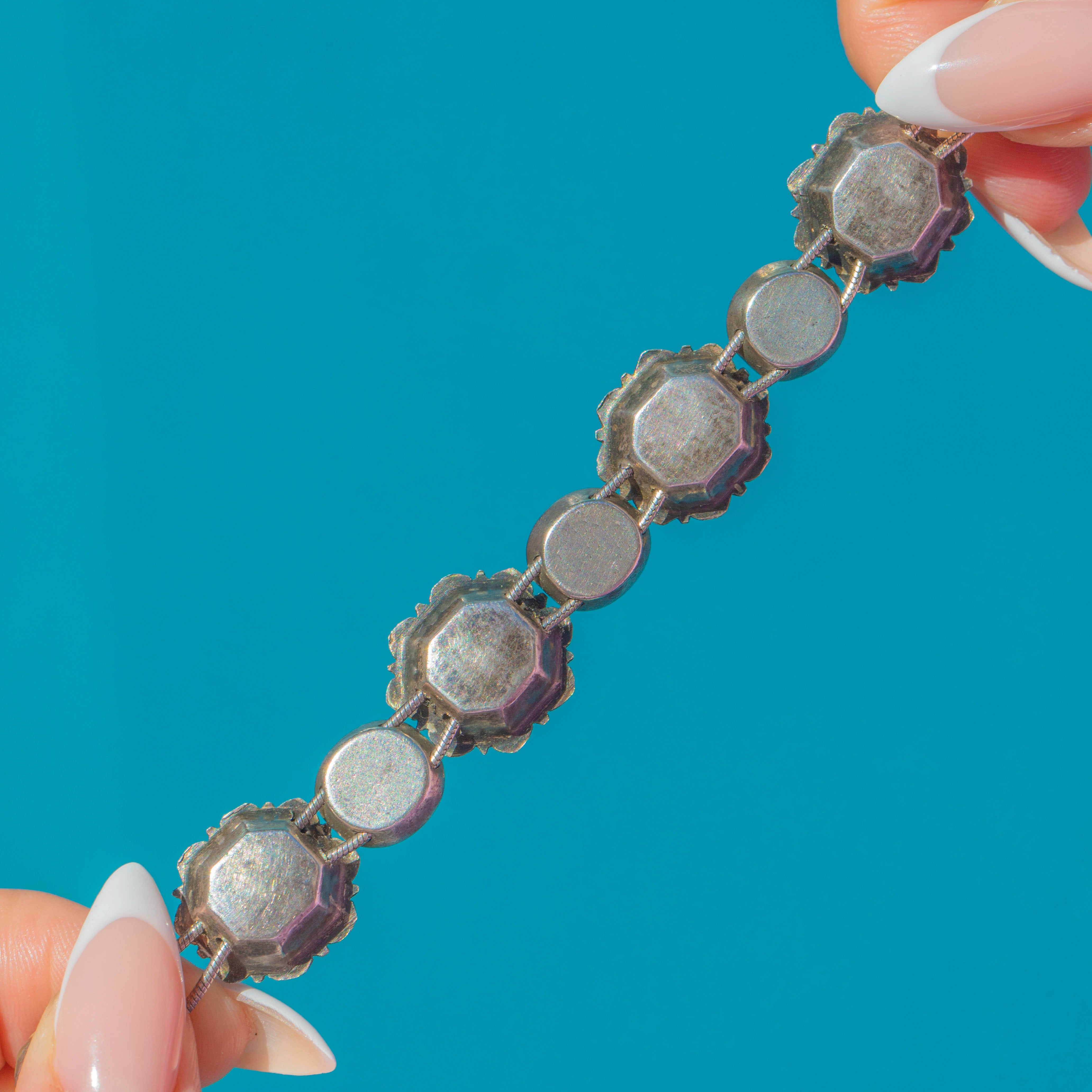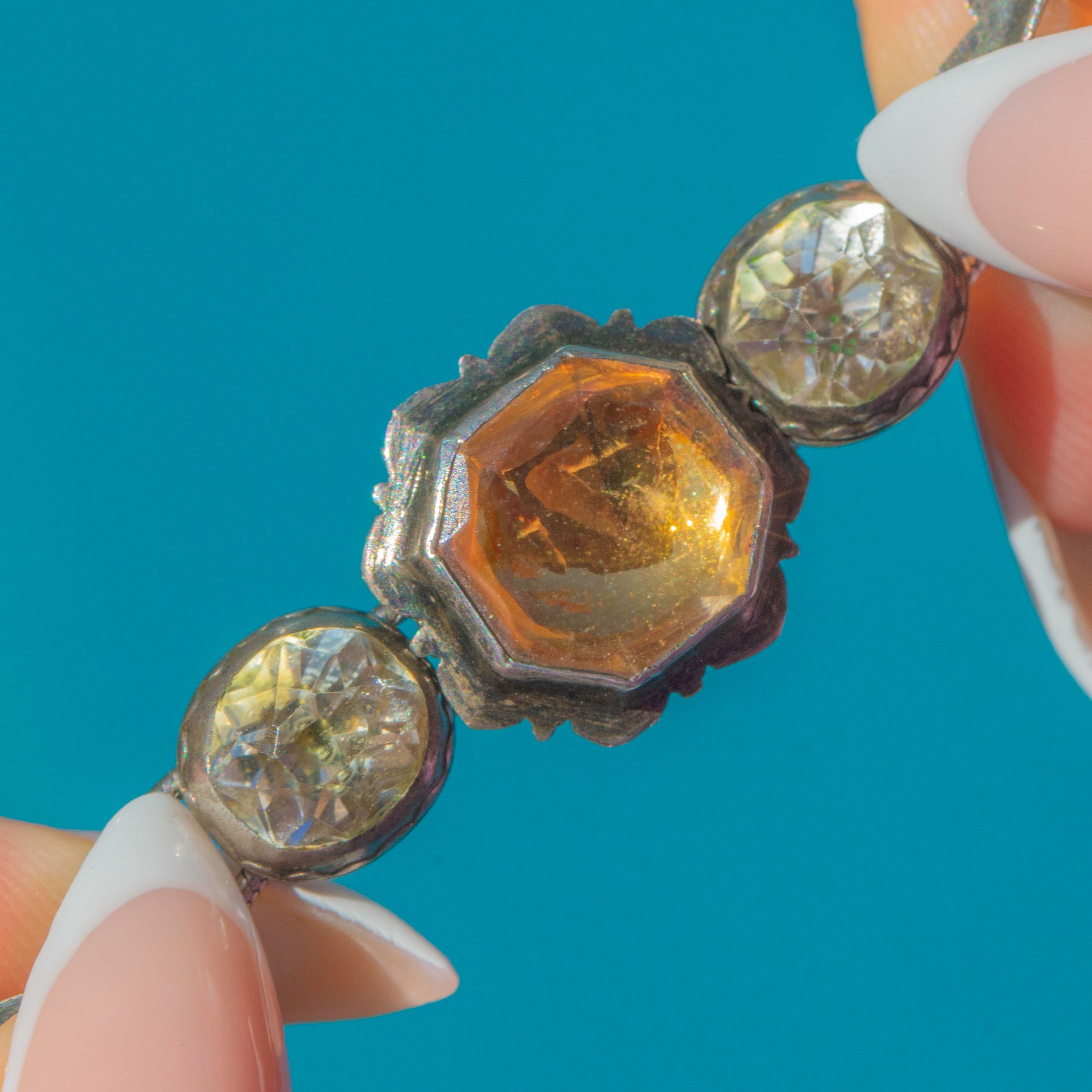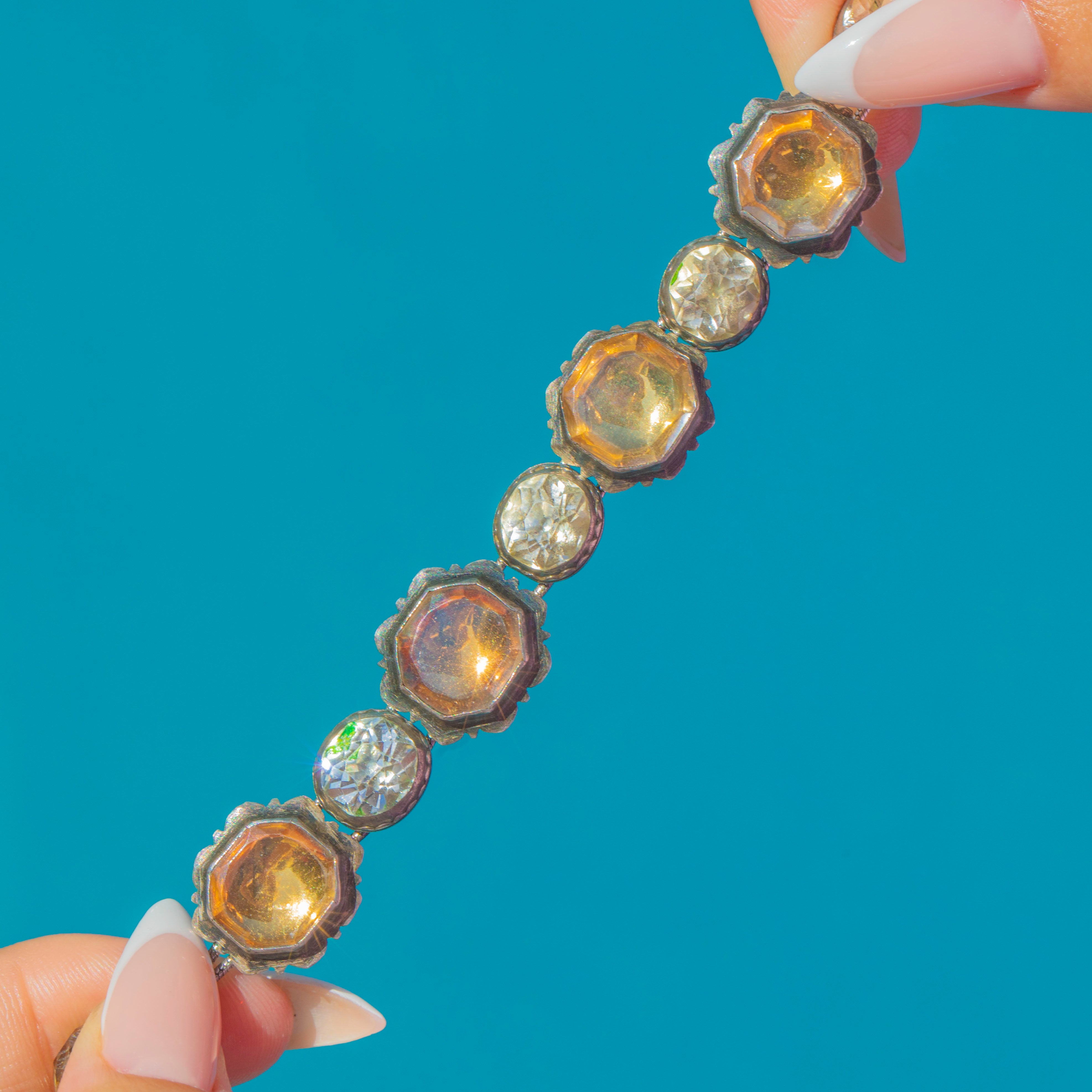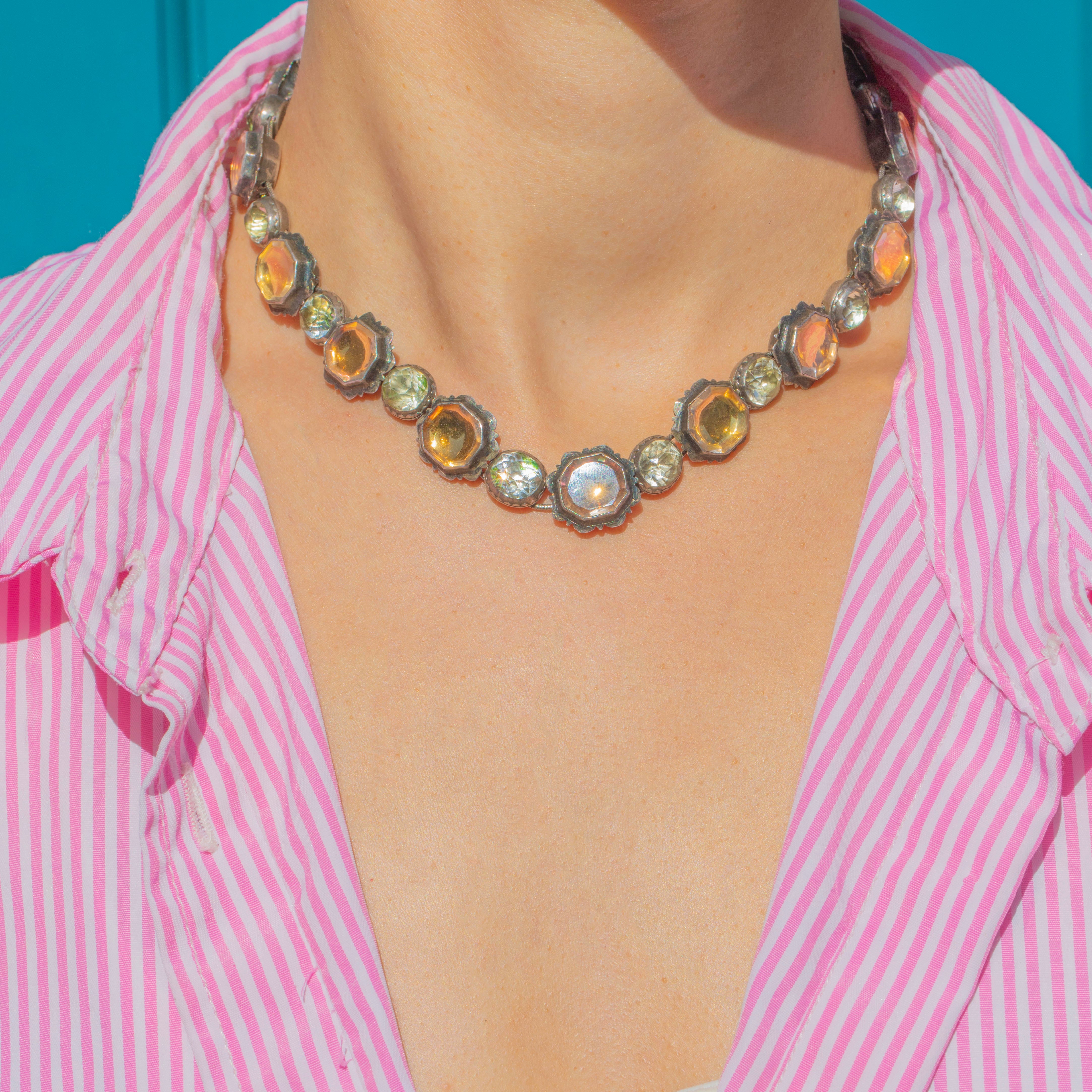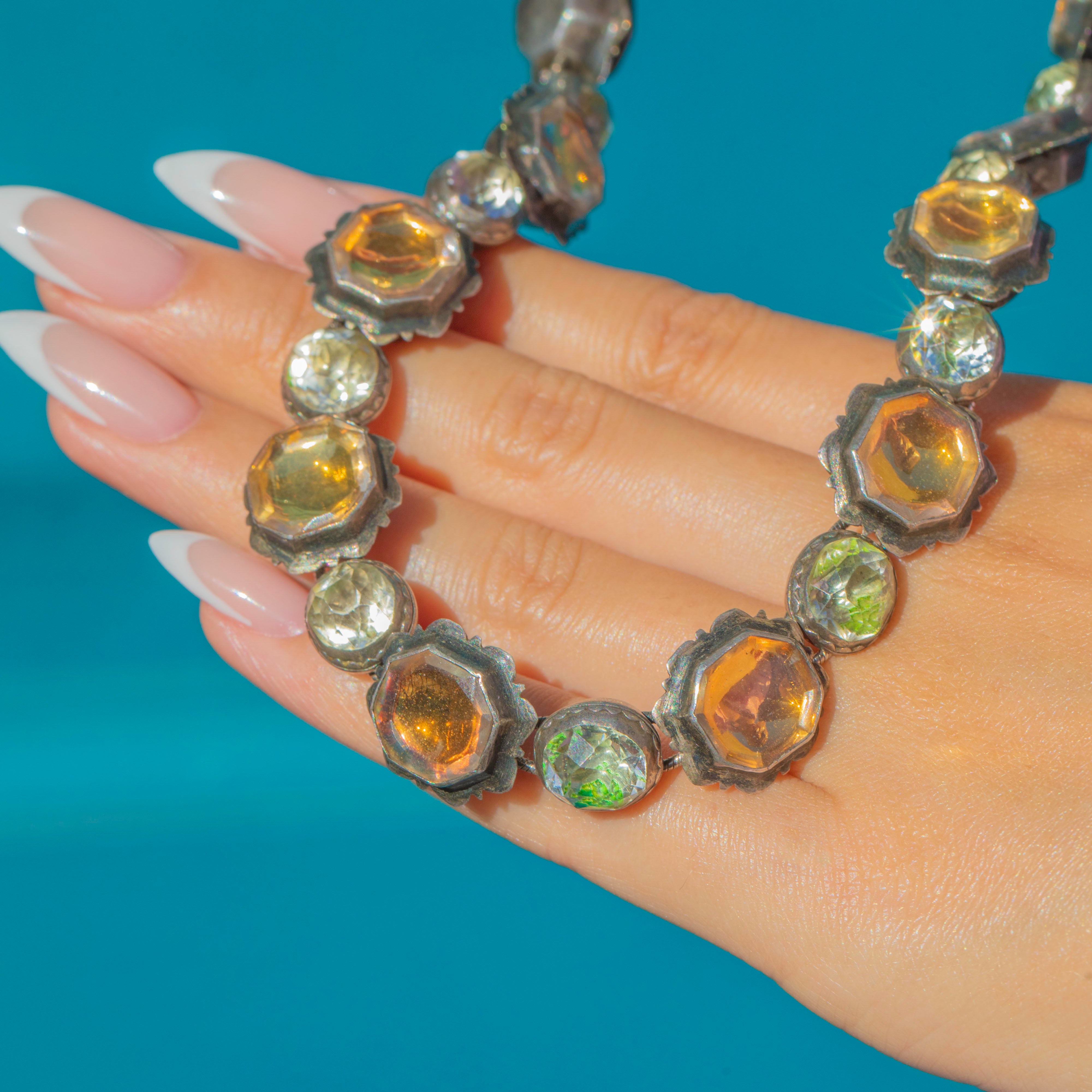 EXCELLENT: This necklace is in excellent antique condition. All settings are secure with no missing links, and the later-added extension has been carefully handcrafted. Some oxidisation and natural discolouration to the foils behind the Rock Crystal is present, which is consistent with age and only adds to its antique character.