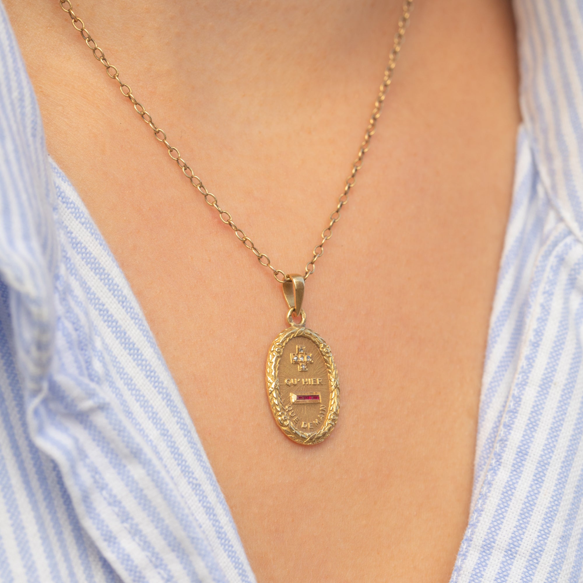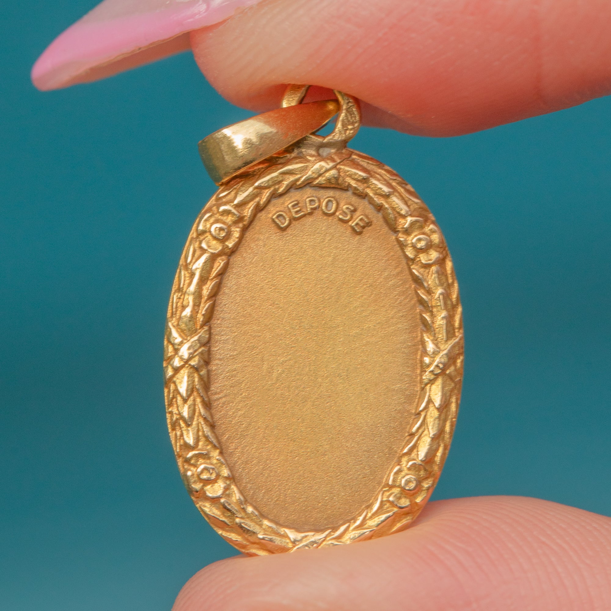 The word “plus” is represented by a Diamond-set cross, and “moins” by a Ruby-set dash, a charming visual expression of devotion. This particular pendant is a later Art Deco to Mid-Century example of Alphonse Augis’ celebrated 1907 design, featuring a soft crêpe de chine textured ground and a delicate laurel border symbolising eternal love and fidelity. The reverse is stamped “DEPOSE”, denoting a registered French design.