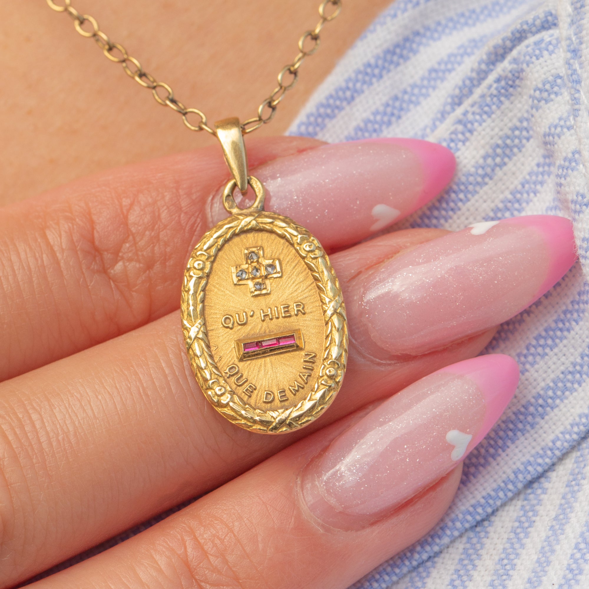This beautiful French Saint Augis “Qu’hier Que Demain” love token, crafted in 18ct Gold, bears the iconic rebus meaning “More than yesterday, less than tomorrow.” The phrase, penned in 1889 by poet Rosemonde Gérard for her husband Edmond Rostand, became one of France’s most enduring symbols of everlasting love.