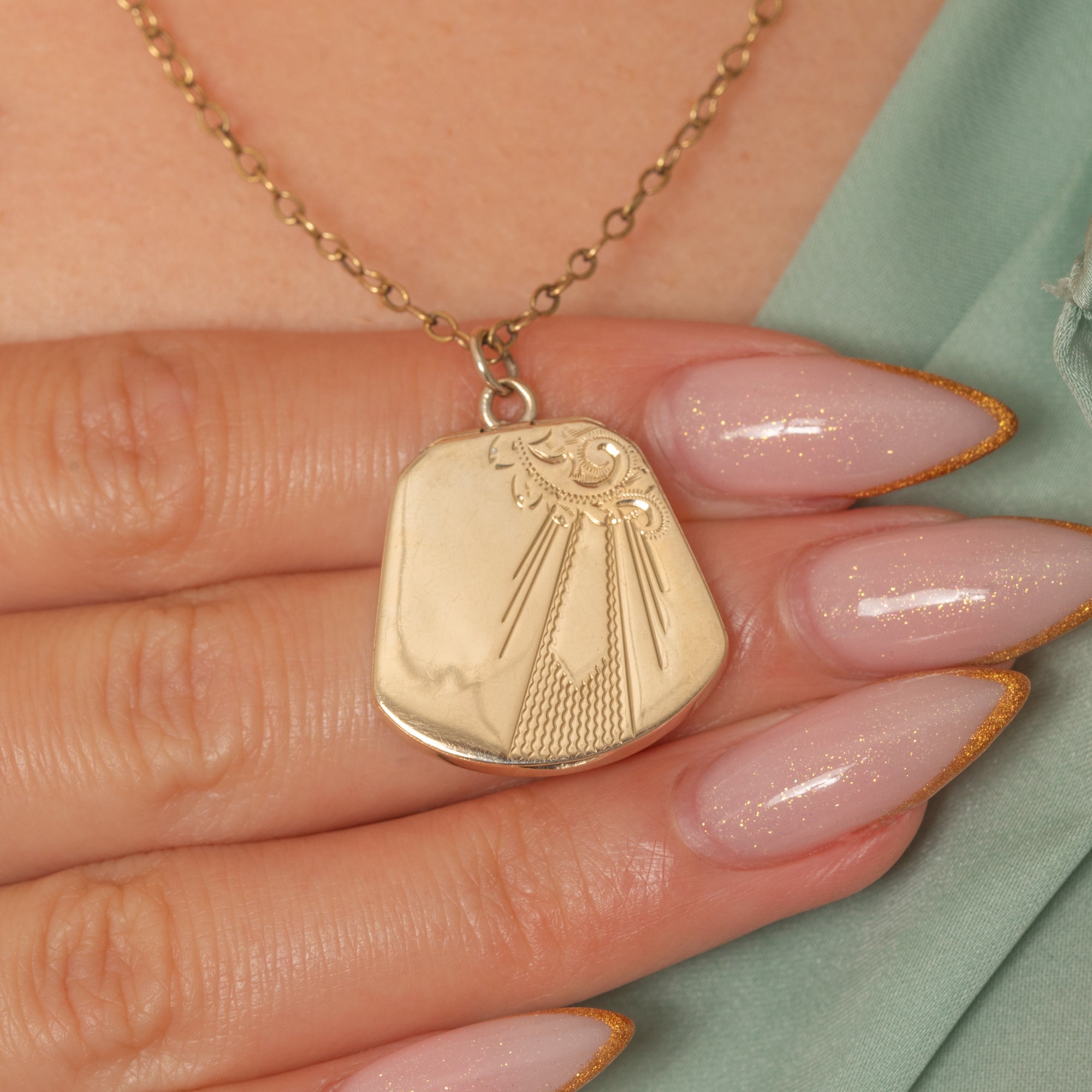 A sleek and stylish Art Deco locket with a classic geometric design, crafted in 9ct Gold back and front. Its crisp lines and softly polished panels give it that unmistakable 1920’s elegance — clean, modern, and effortlessly wearable. Light yet sturdy, it’s the perfect everyday locket for adding a touch of Deco glamour to any chain.